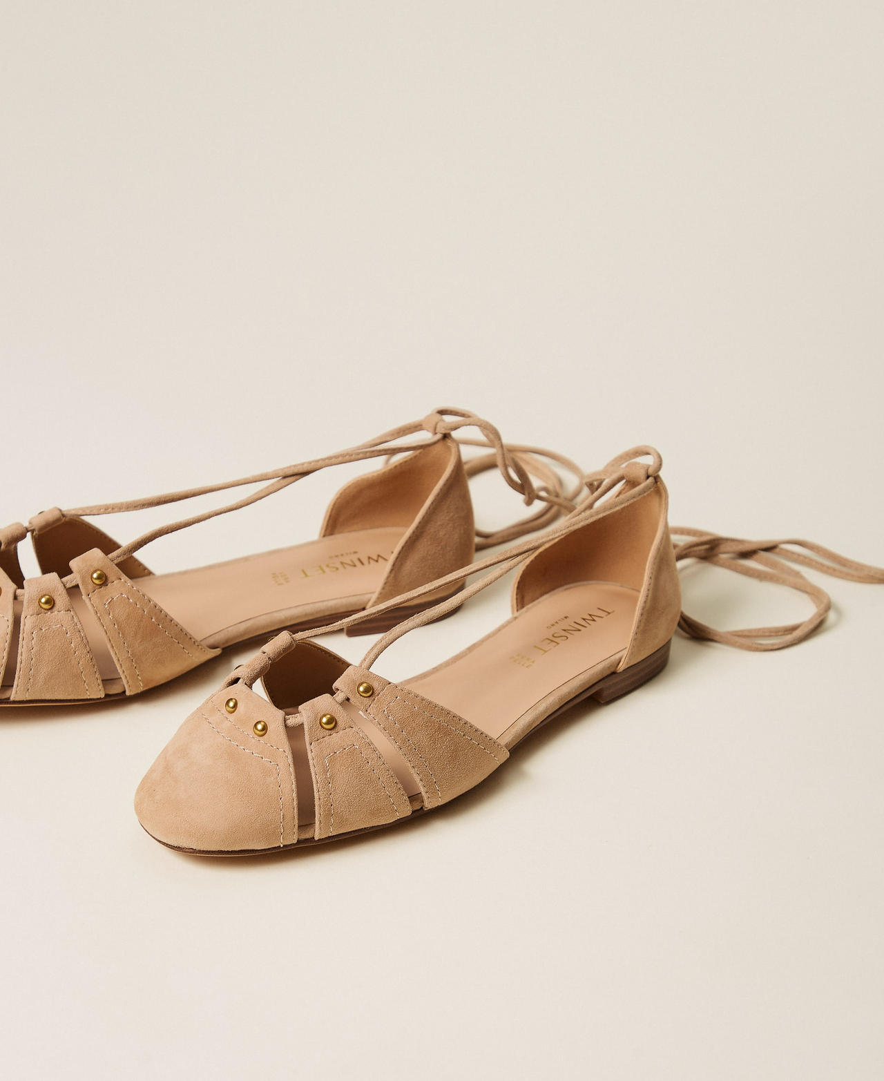Балетки из бархатистой замши на небольшом каблуке дополнены перекрестными завязками на щиколотке и металлическими деталями.