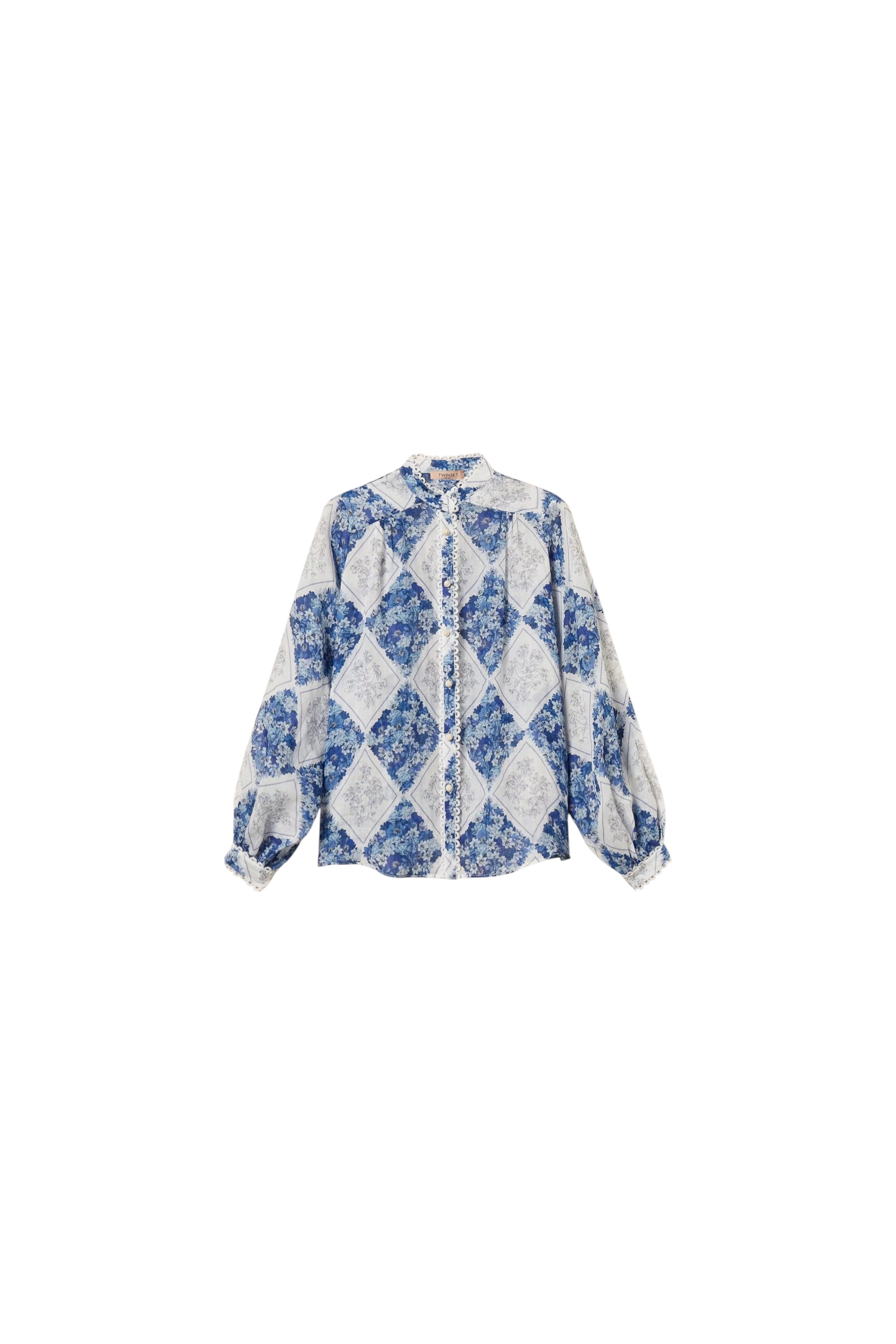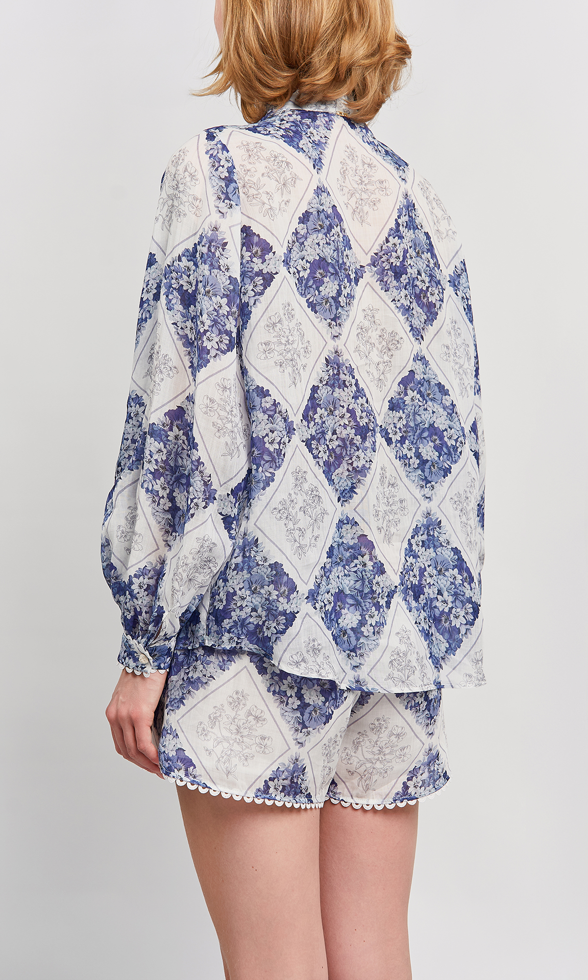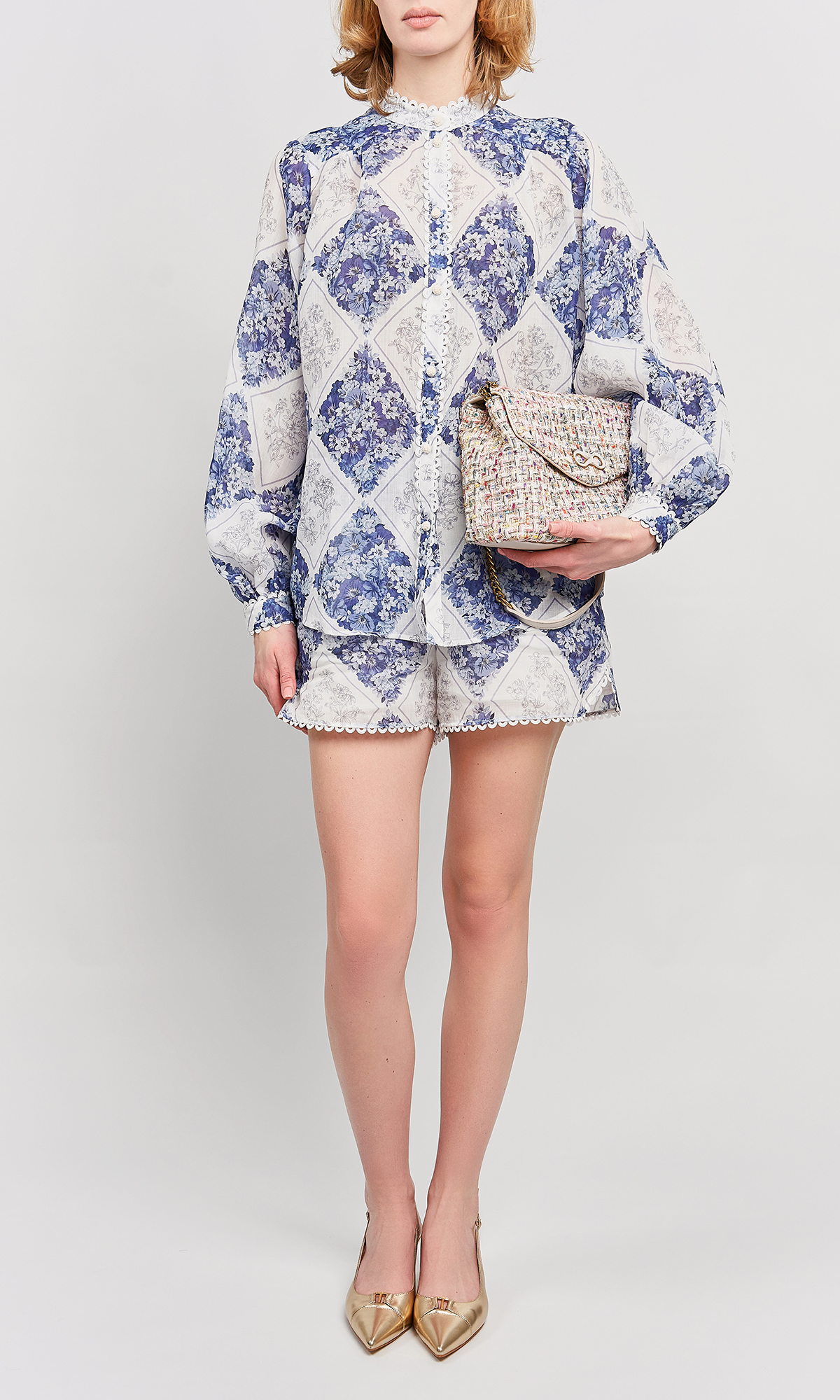 Блуза из натуральной ткани рами с нотки винтажной элегантности, объемными рукавами с манжетами на пуговицах и кружевной отделкой украшена цветочным принтом в виде ромбов.