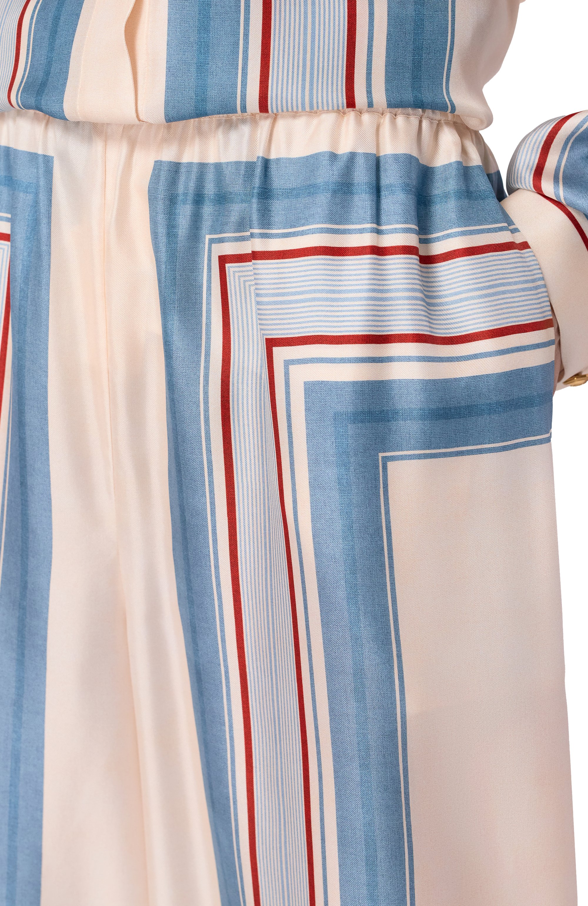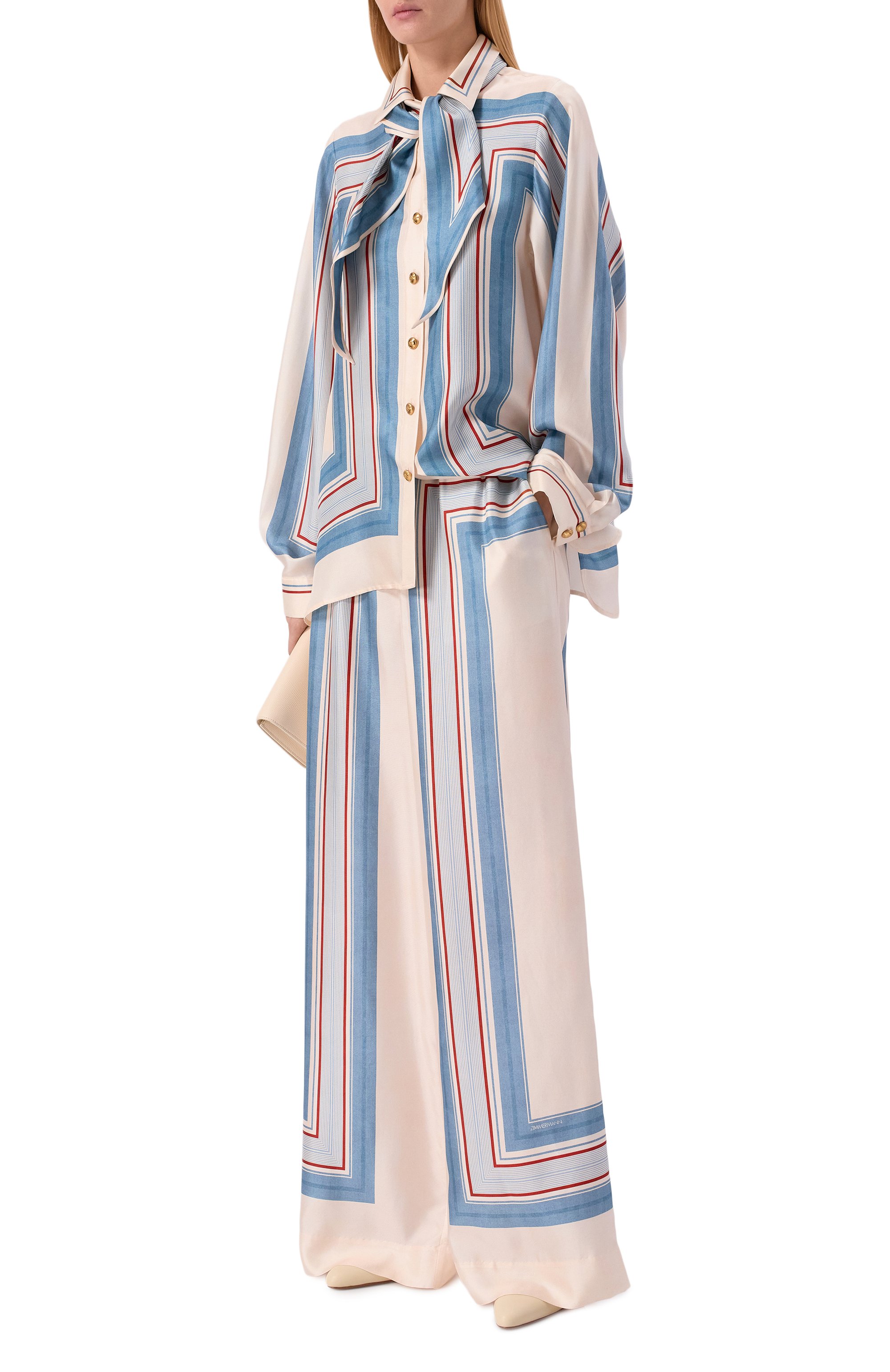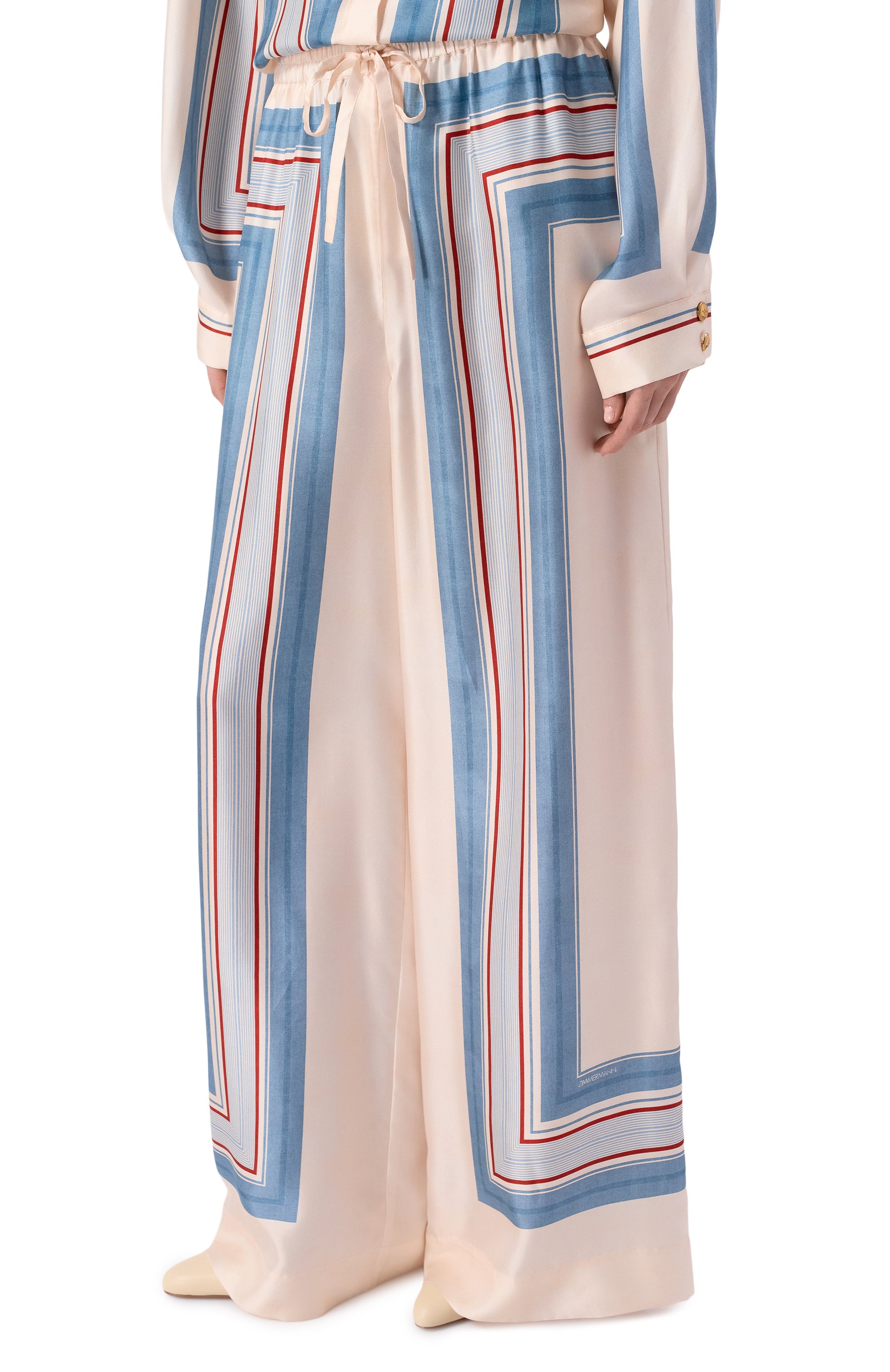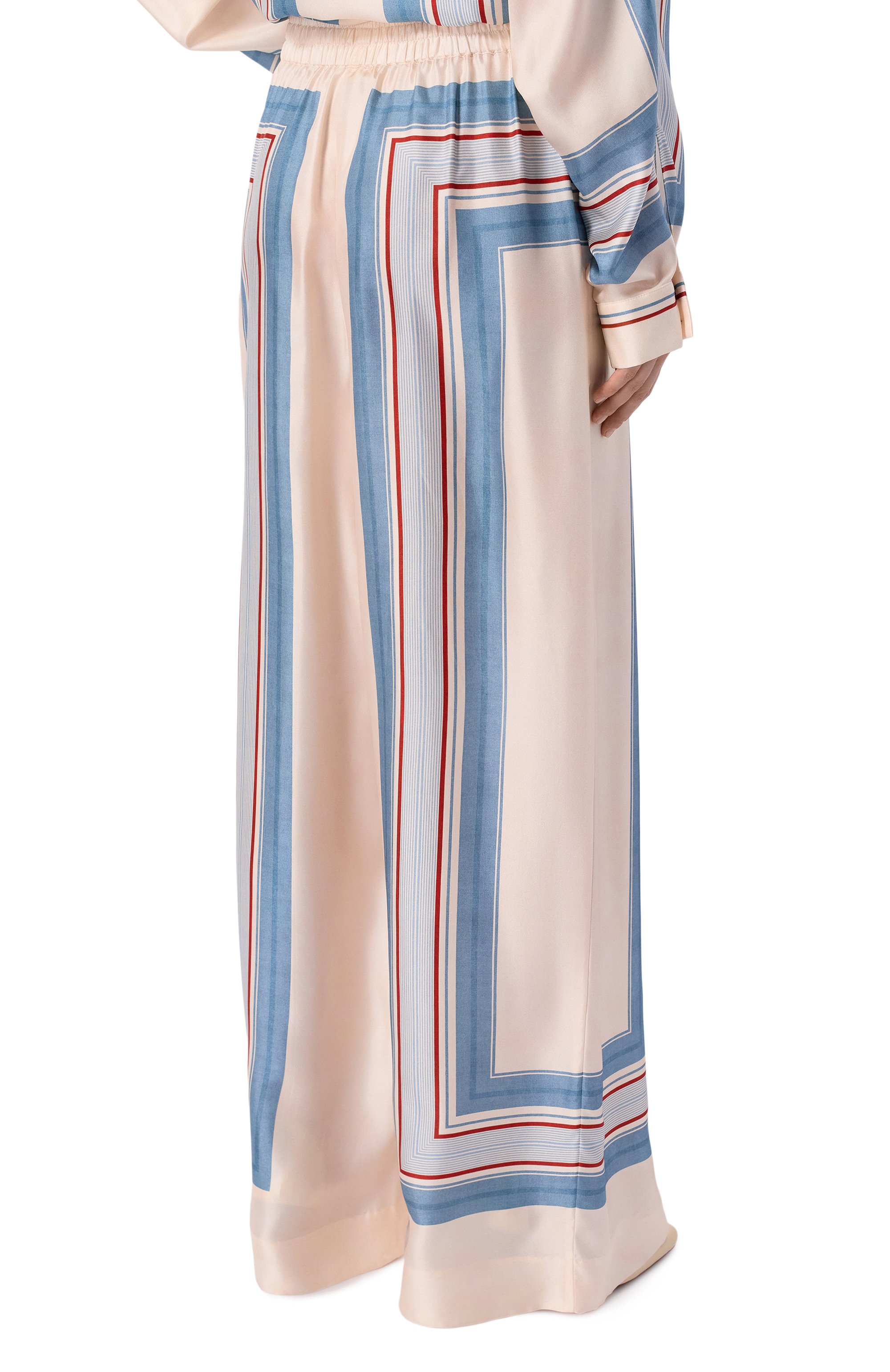 Брюки-палаццо с геометрическим принтом, напоминающим кант на платках, из шелкового твила дополнили регулируемым поясом-кулиской и врезными боковыми карманами.