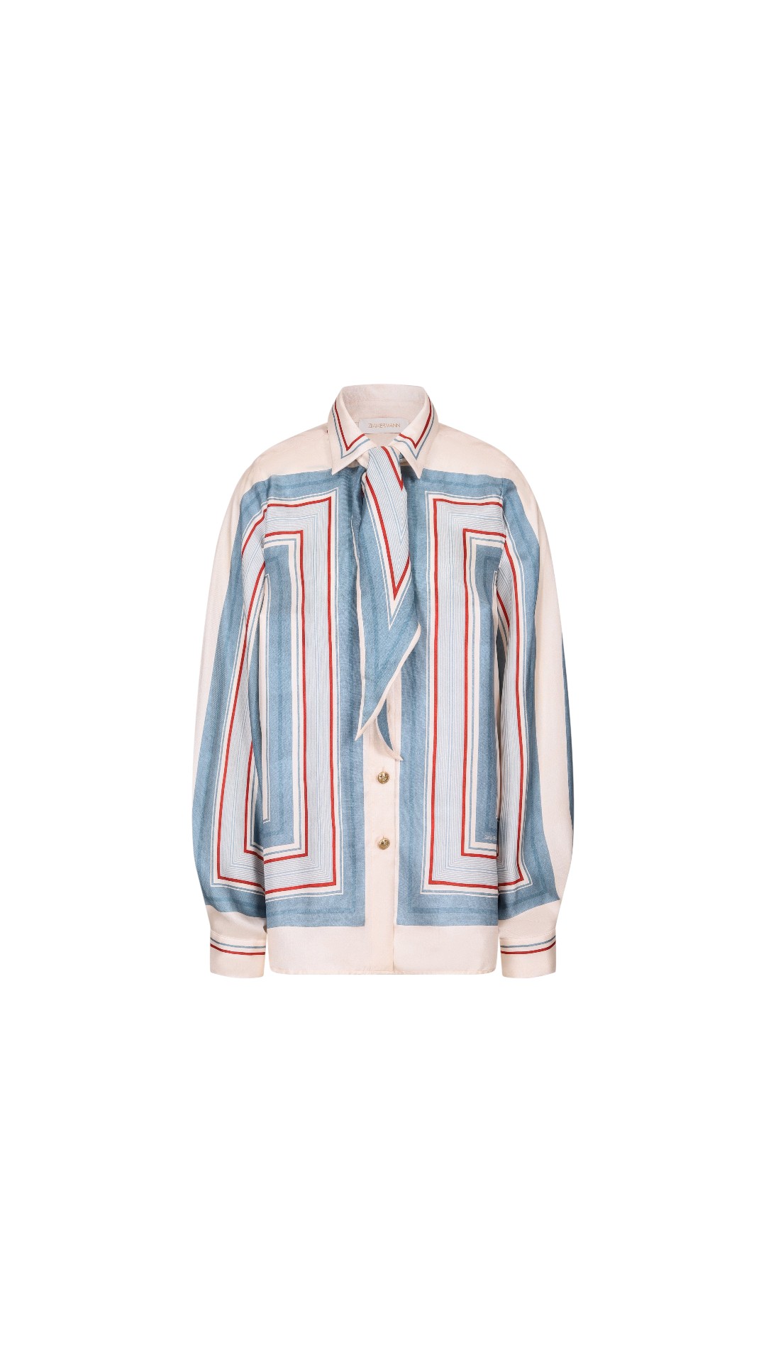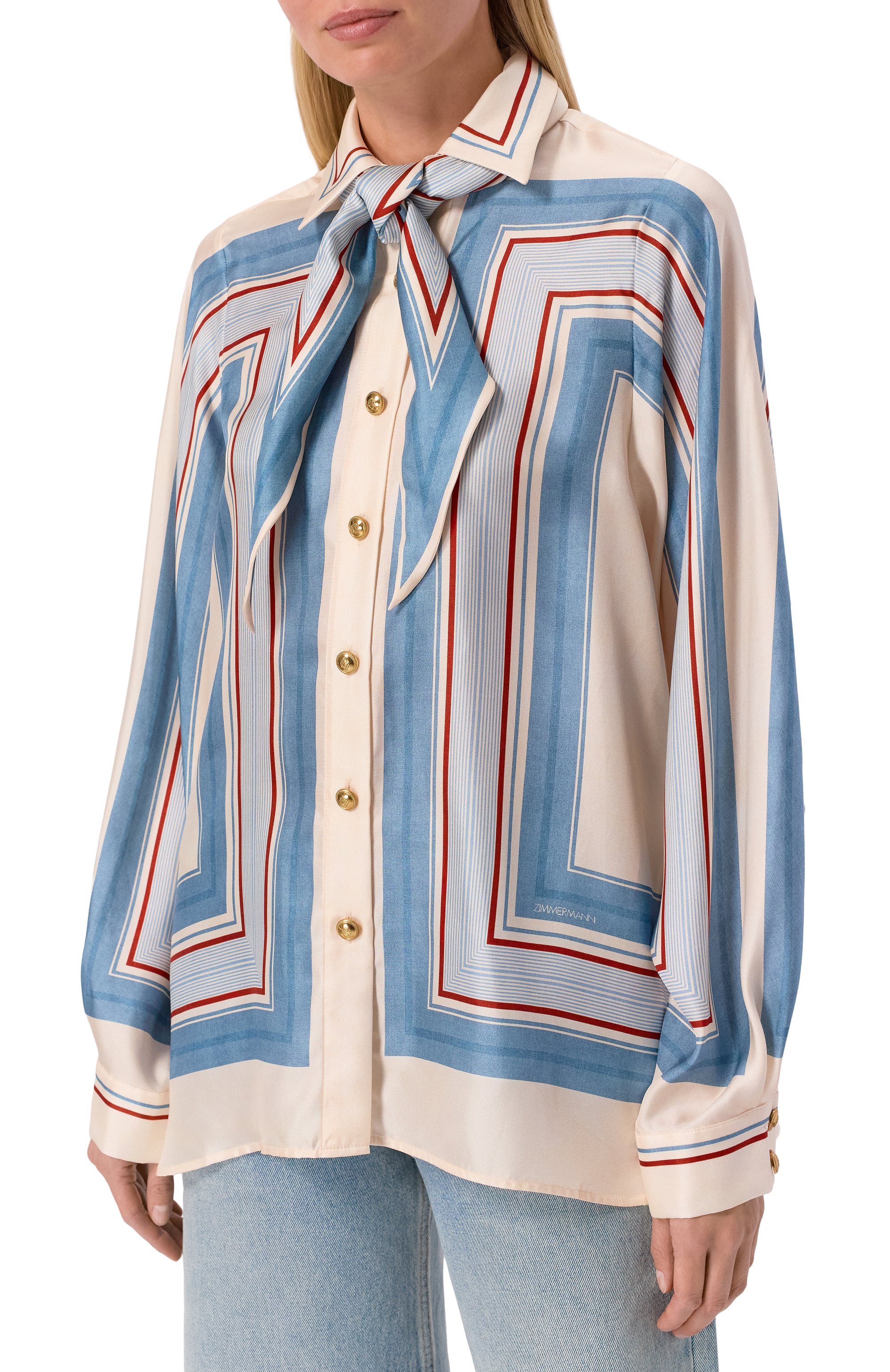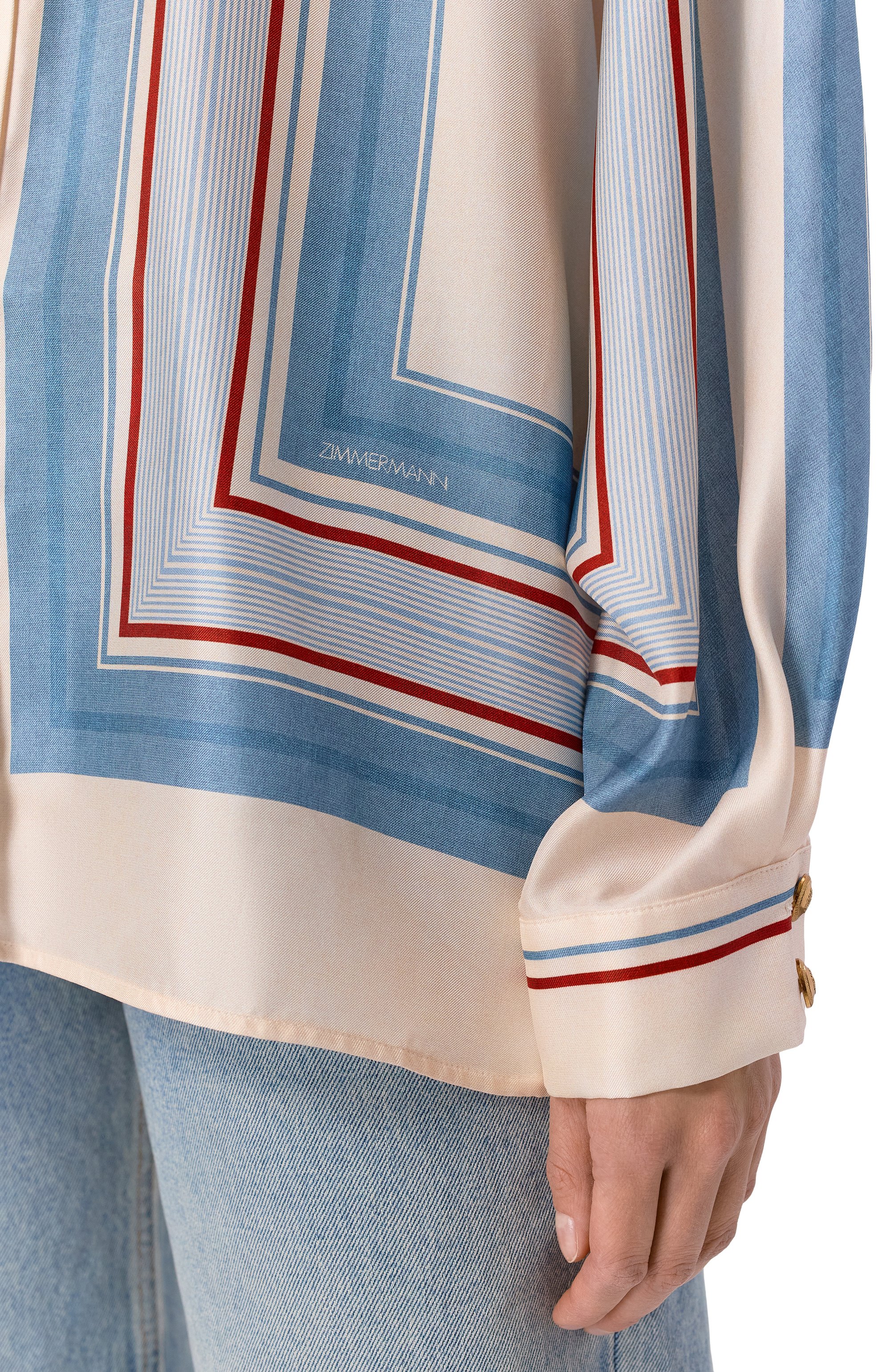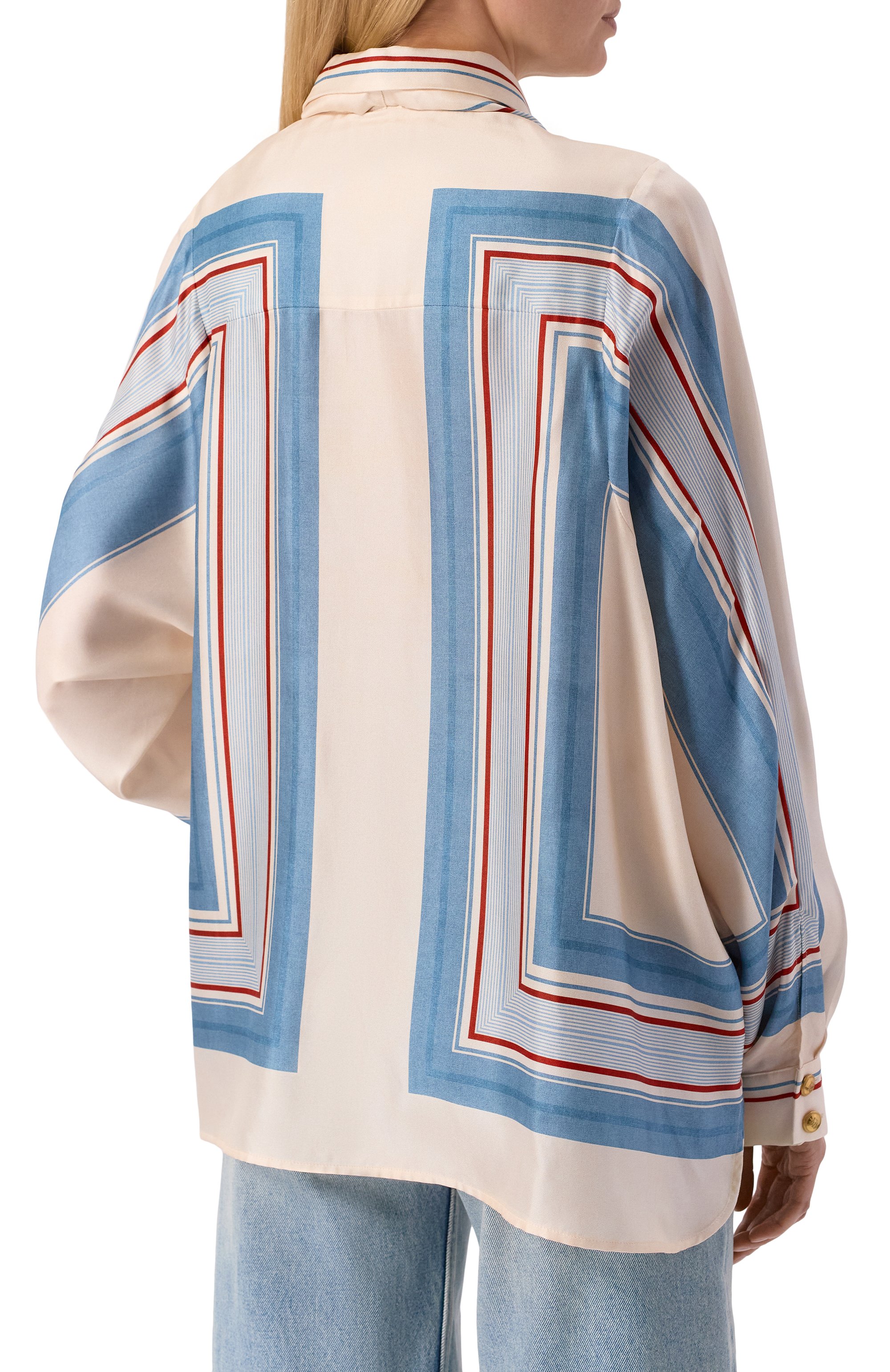 Брюки-палаццо с геометрическим принтом, напоминающим кант на платках, из шелкового твила дополнили регулируемым поясом-кулиской и врезными боковыми карманами.