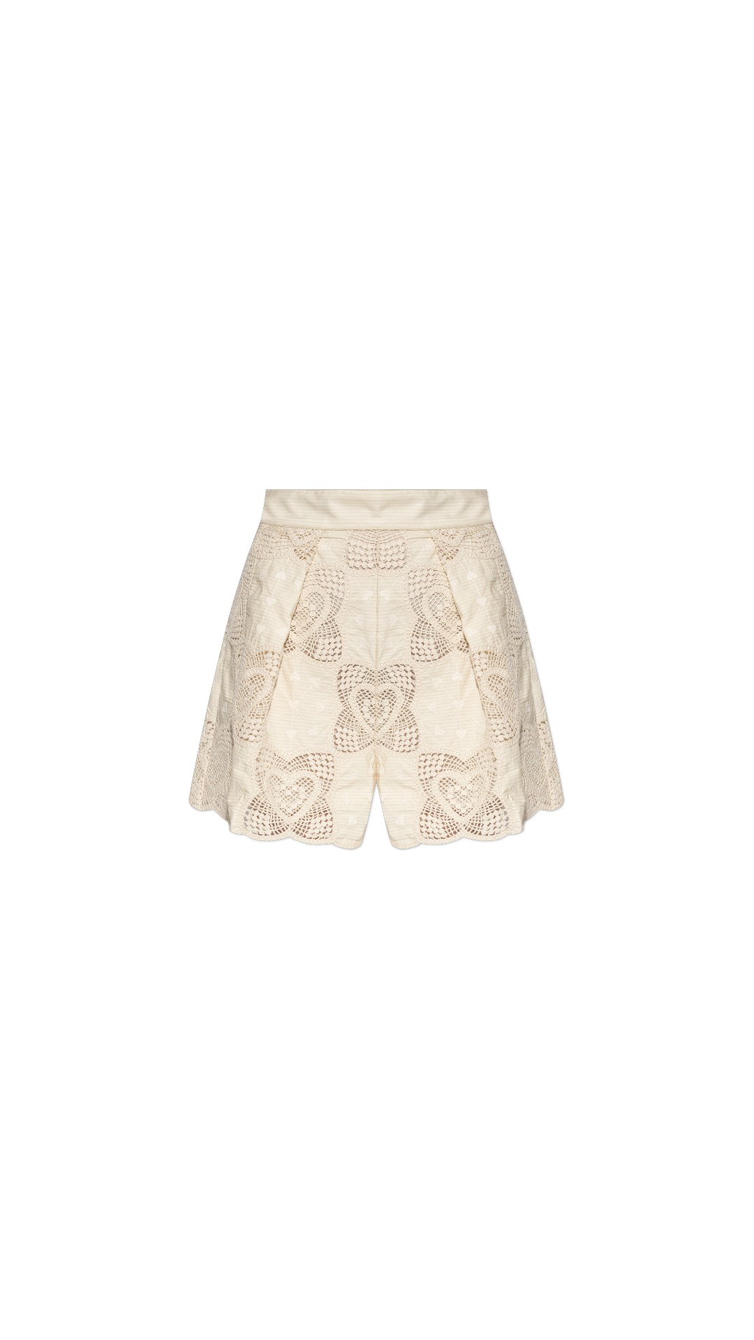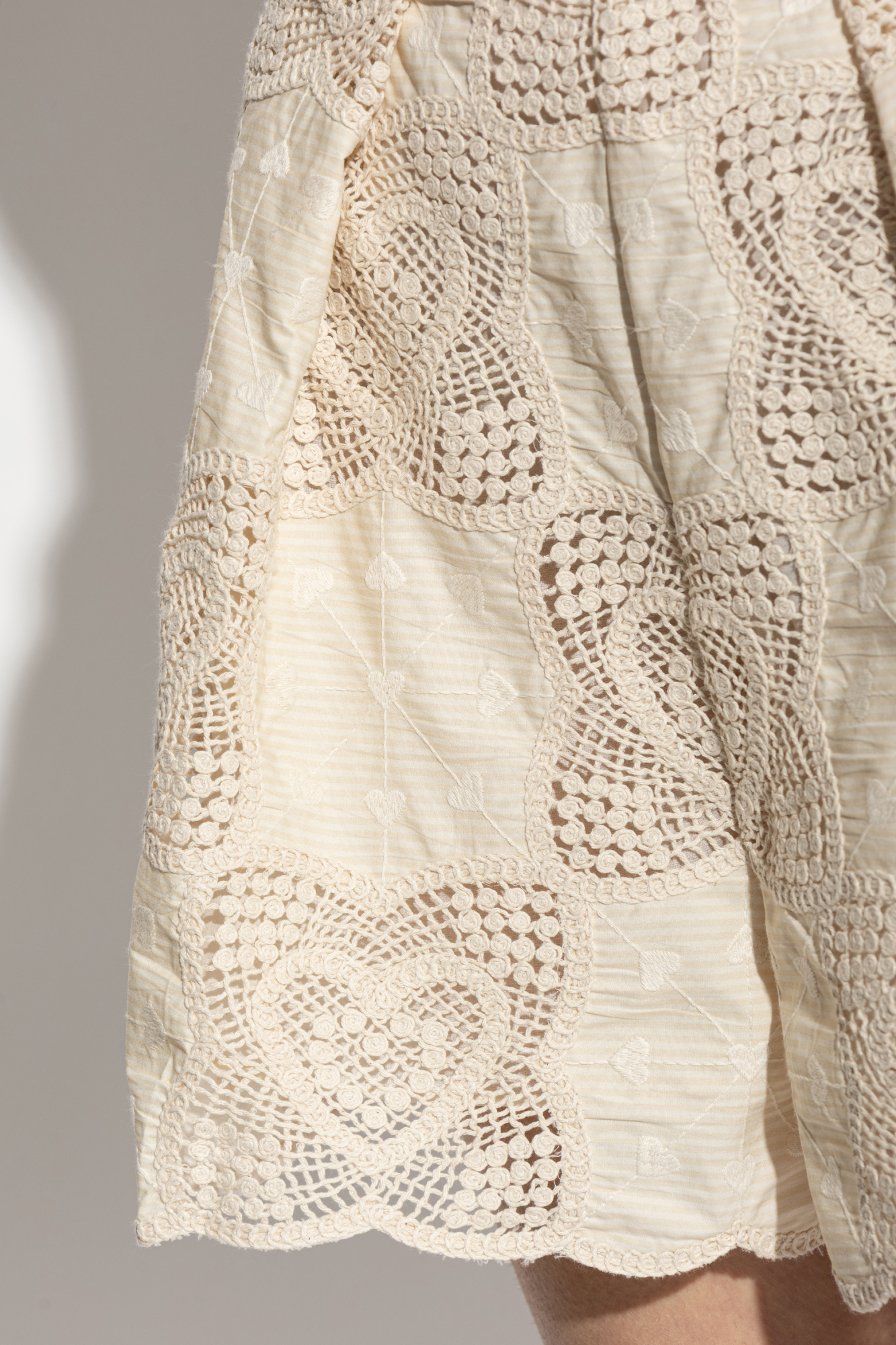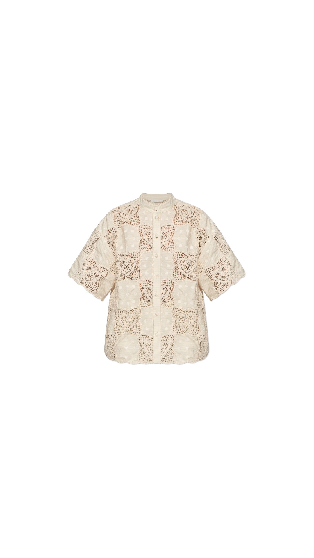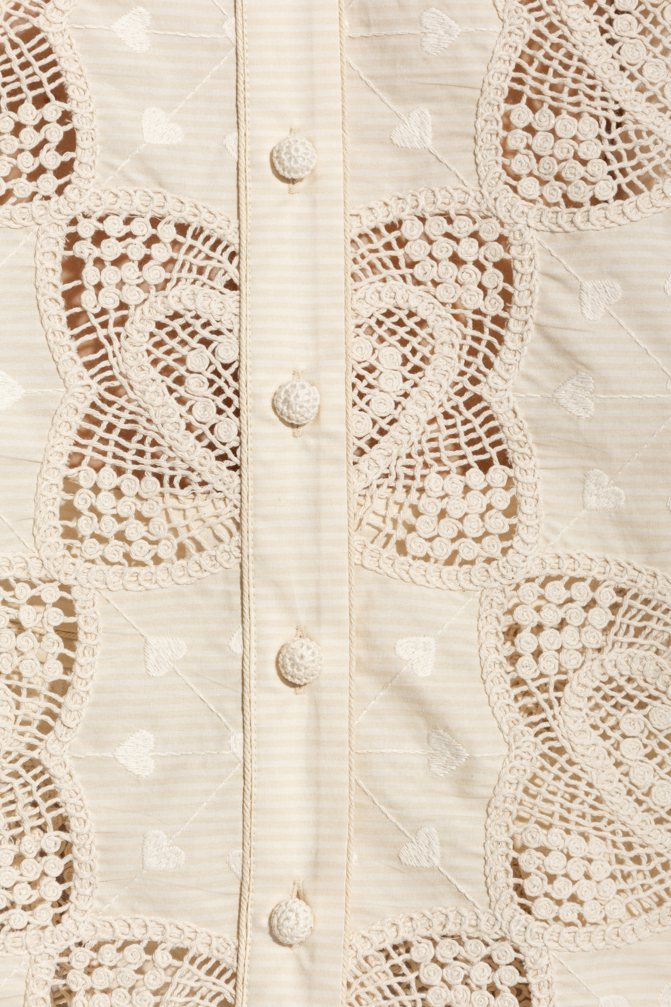 Рубашка слегка расслабленного силуэта с короткими рукавами, застежкой на пуговицы и спущенной линией плеч украшена полупрозрачными кружевными вставками.