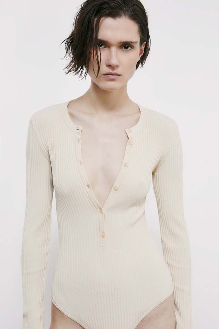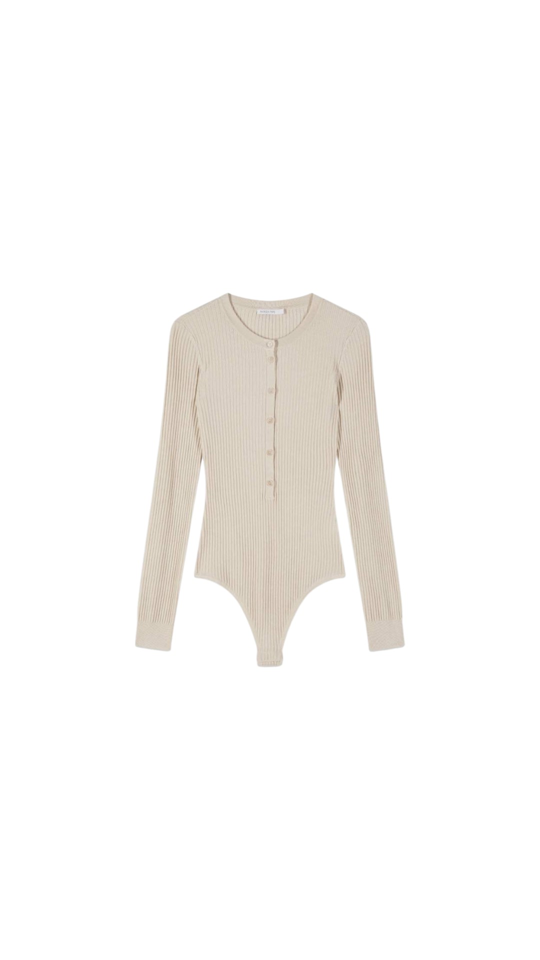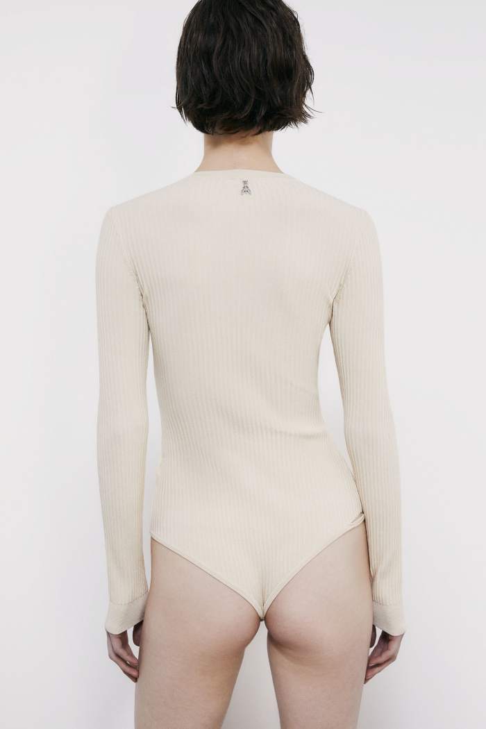 Боди в рубчик приталенного силуэта с круглым вырезом дополнено короткой застежкой на пуговицы и украшено на спине металлическим логотипом бренда.