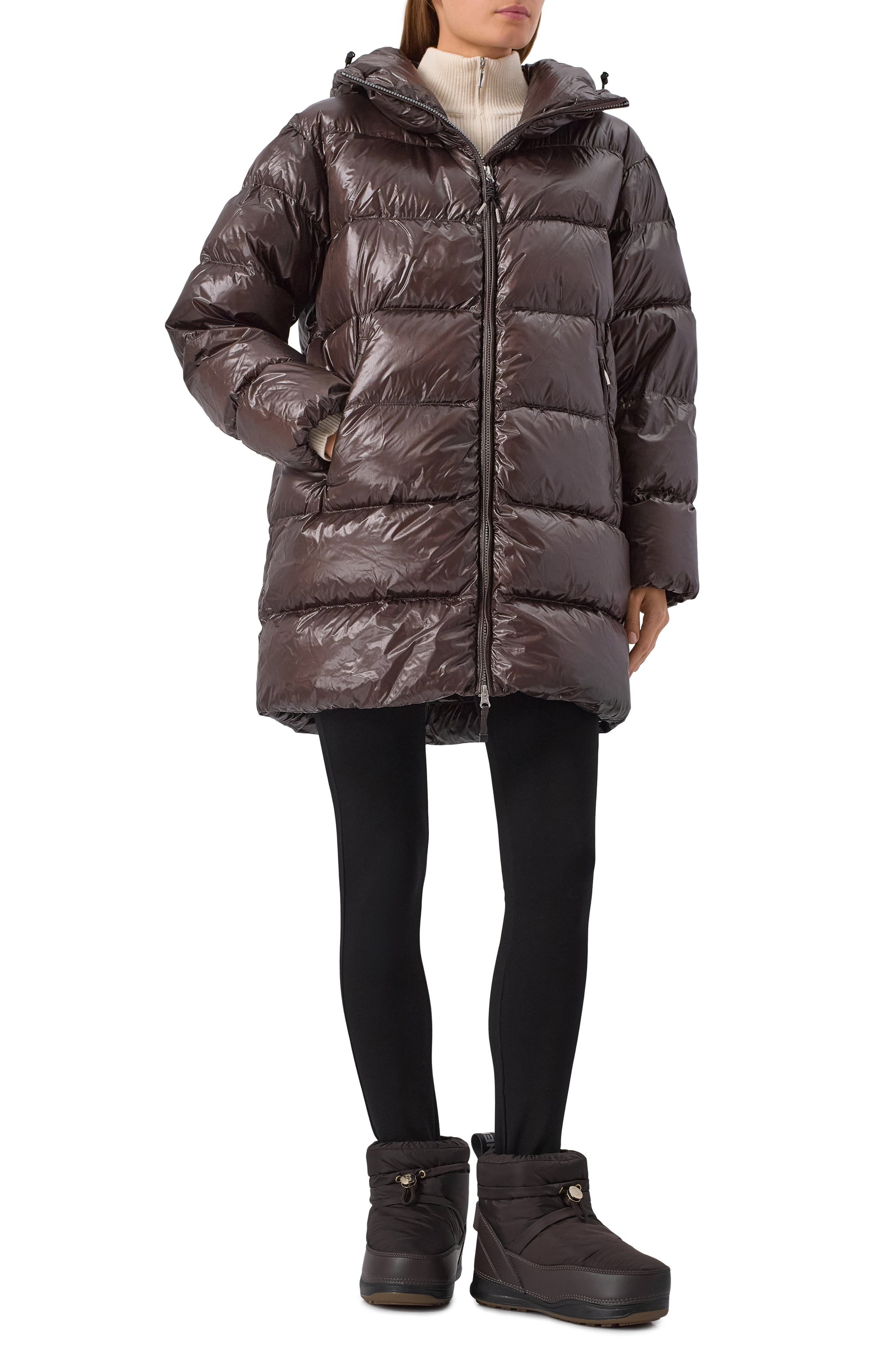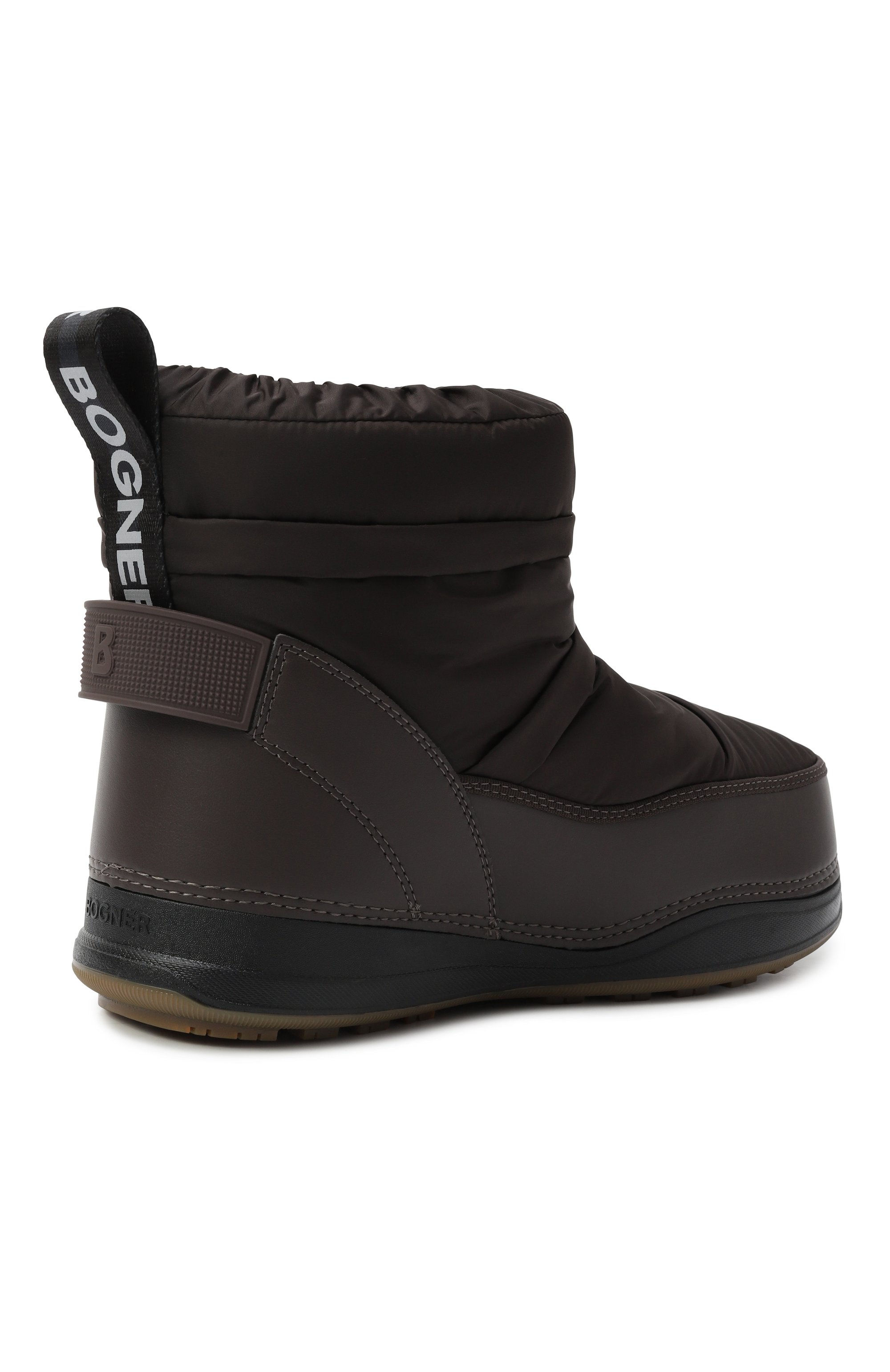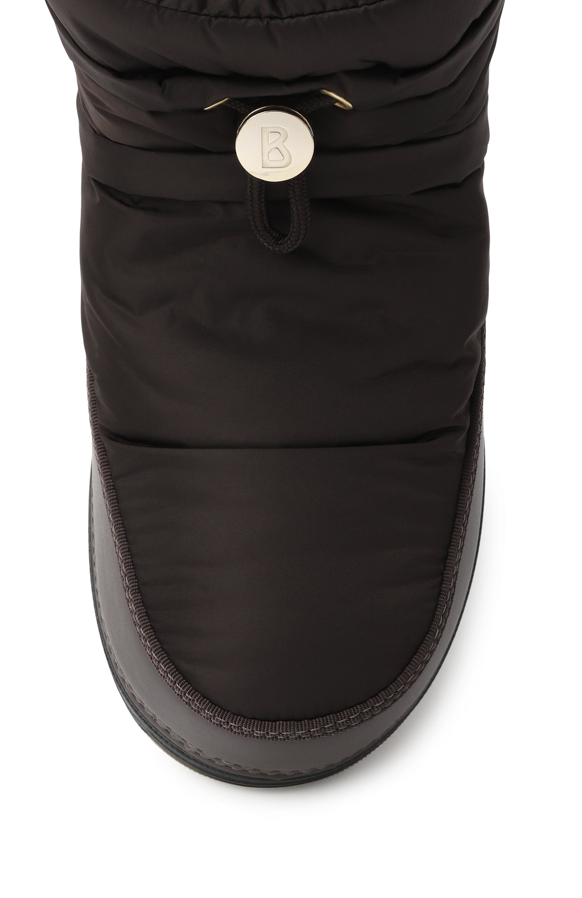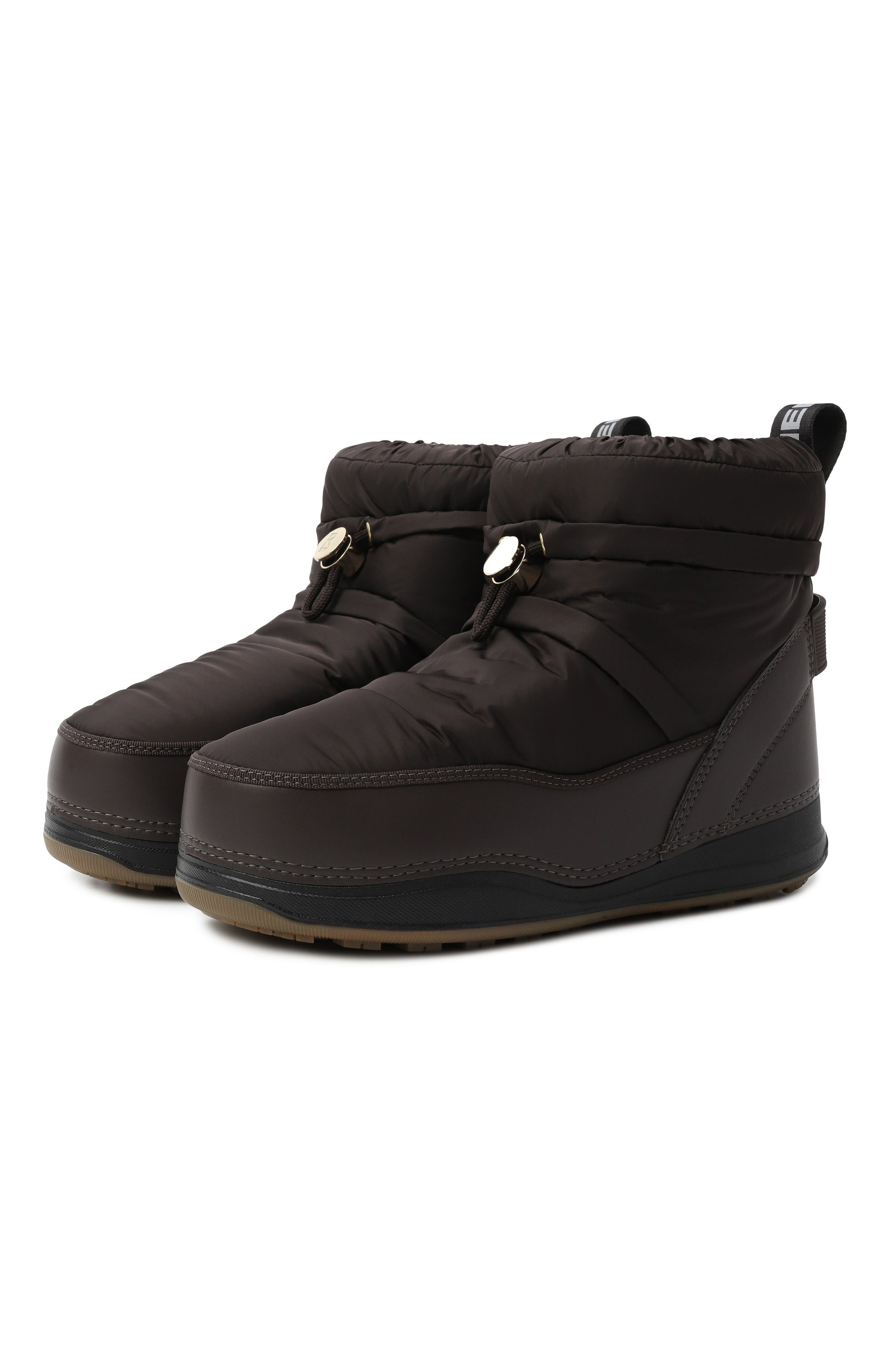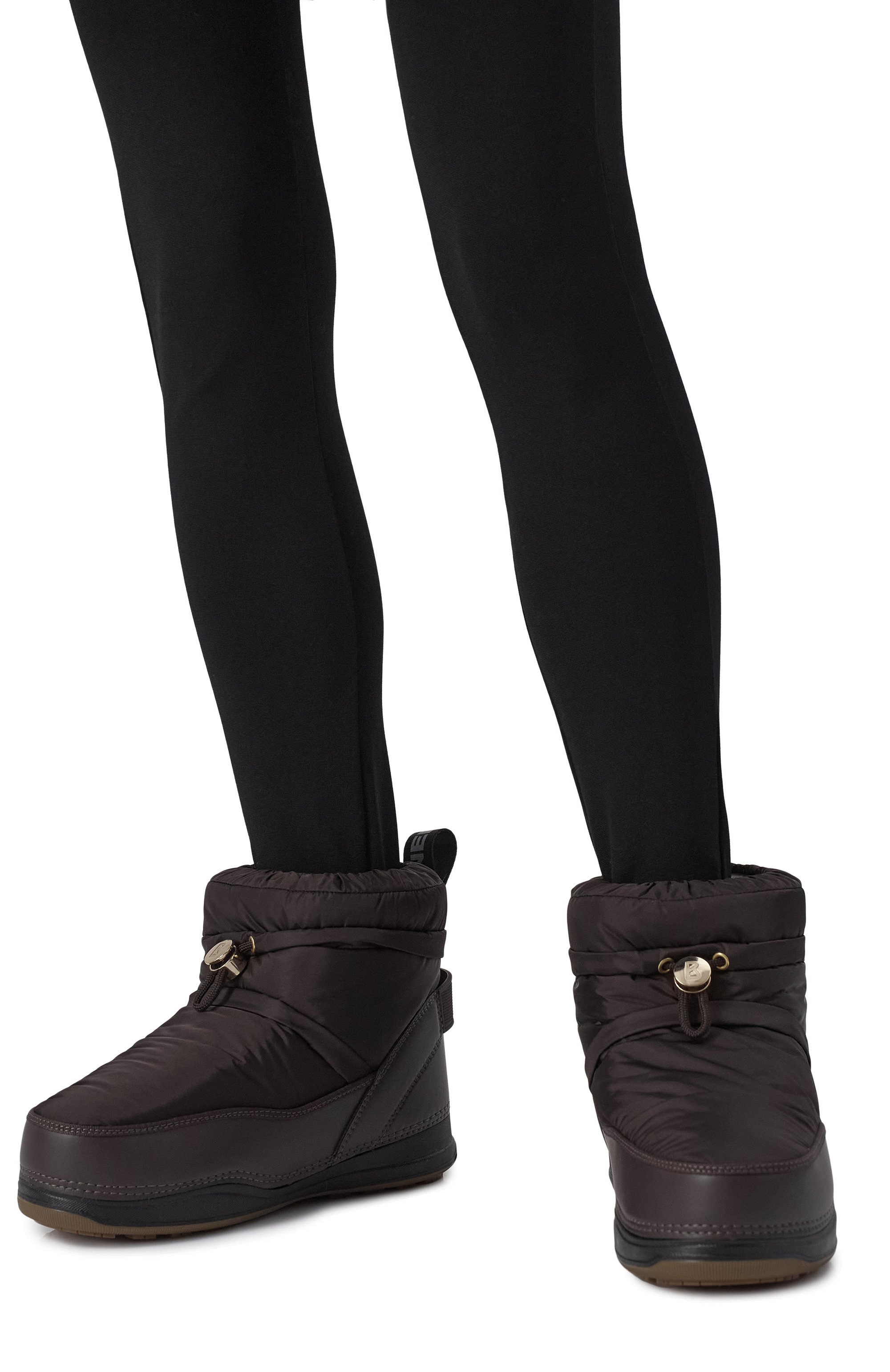 Стеганые полусапоги Meribel выполнили из водоотталкивающего нейлона и искусственной кожи. Модель на сплошной массивной подошве с широким рантом регулируется брендированным шнуром, продетым в кулиску на голенище, задник дополнили текстильной и резиновой фирменными петлями.