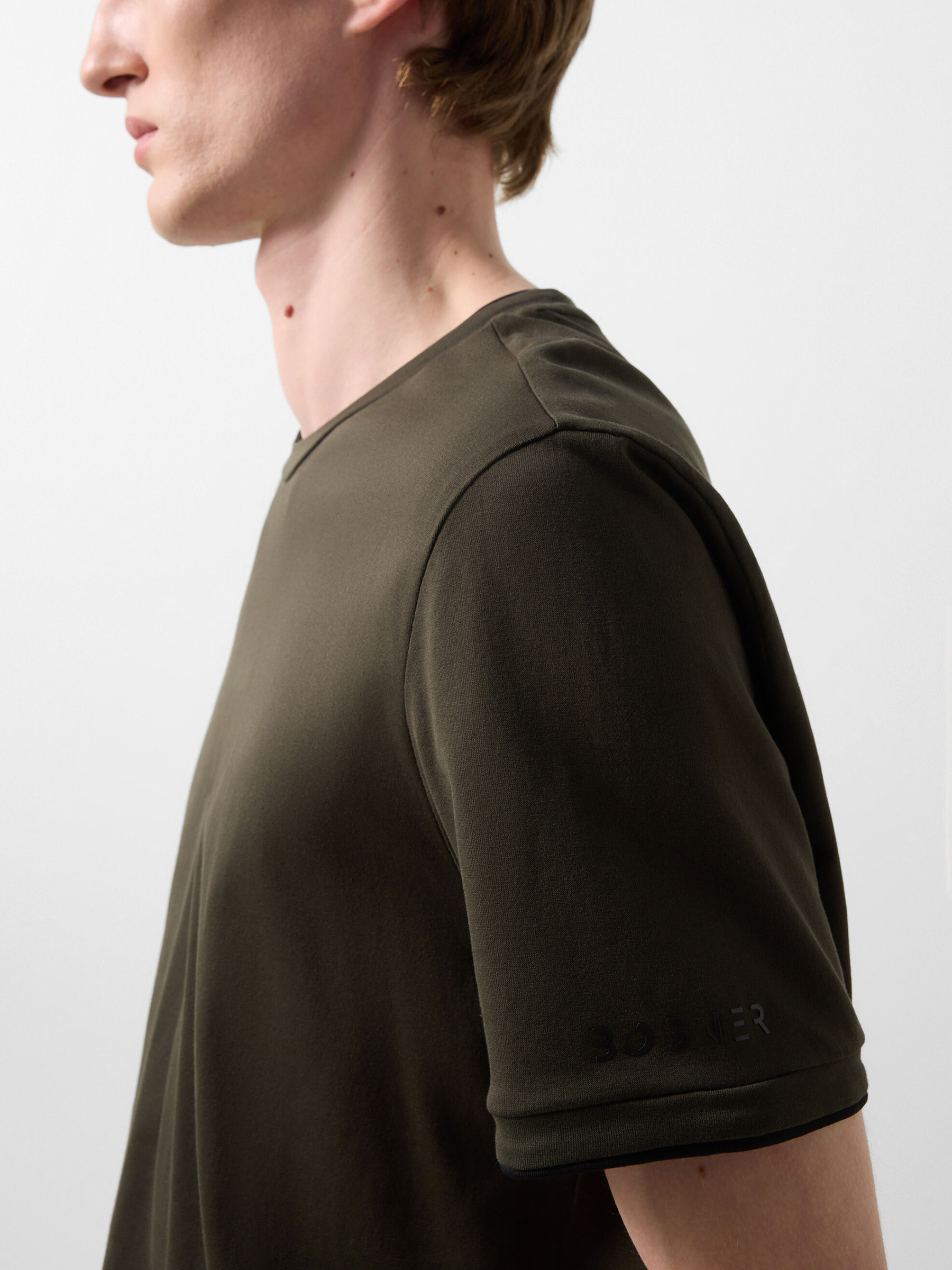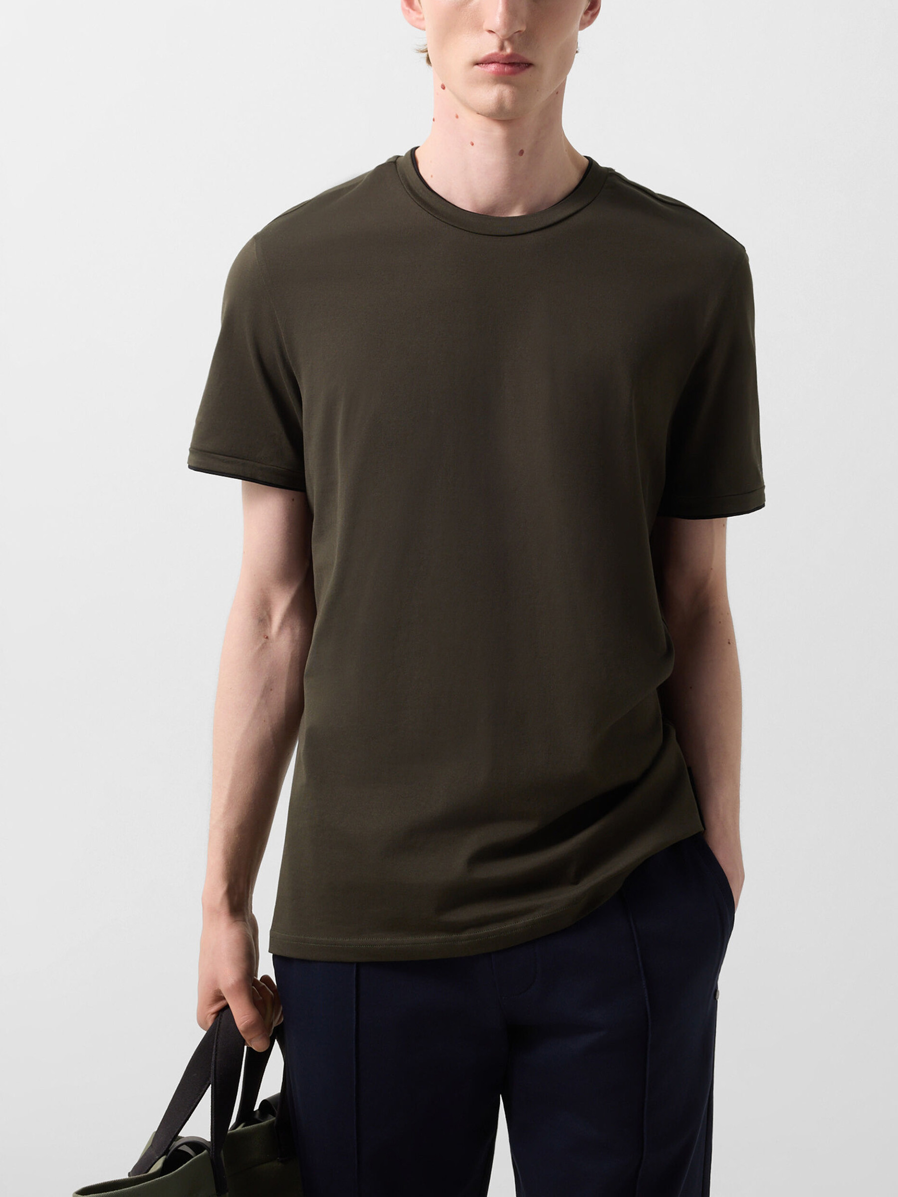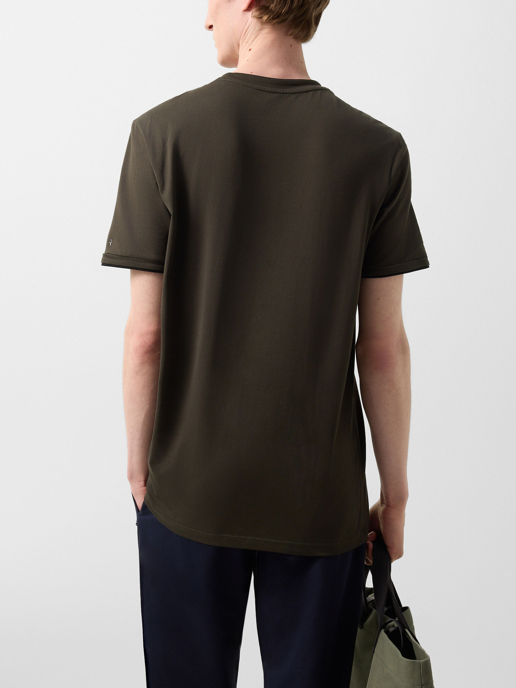 Универсальная футболка с классическим круглым вырезом дополнена на рукаве прорезиненным логотипом бренда.