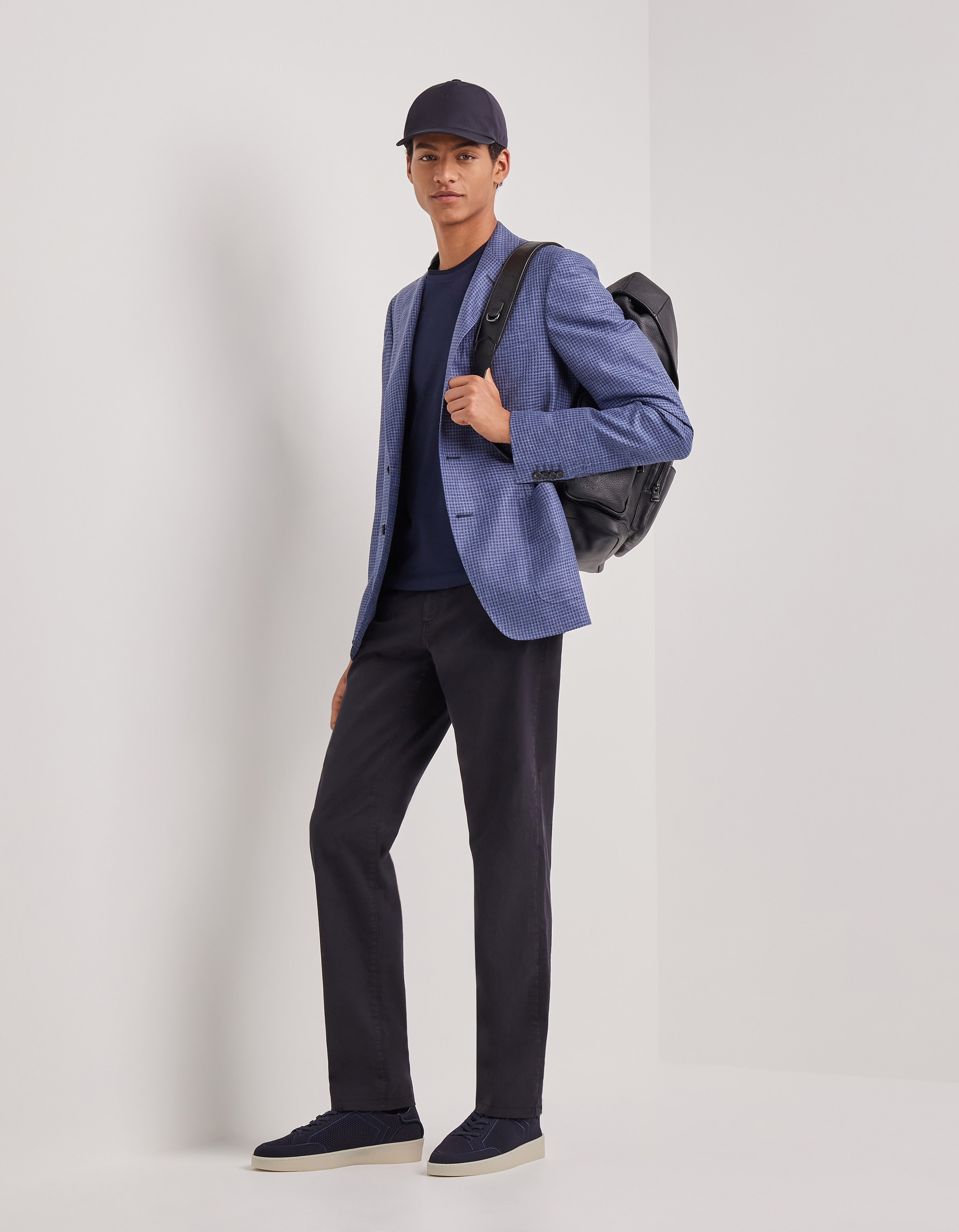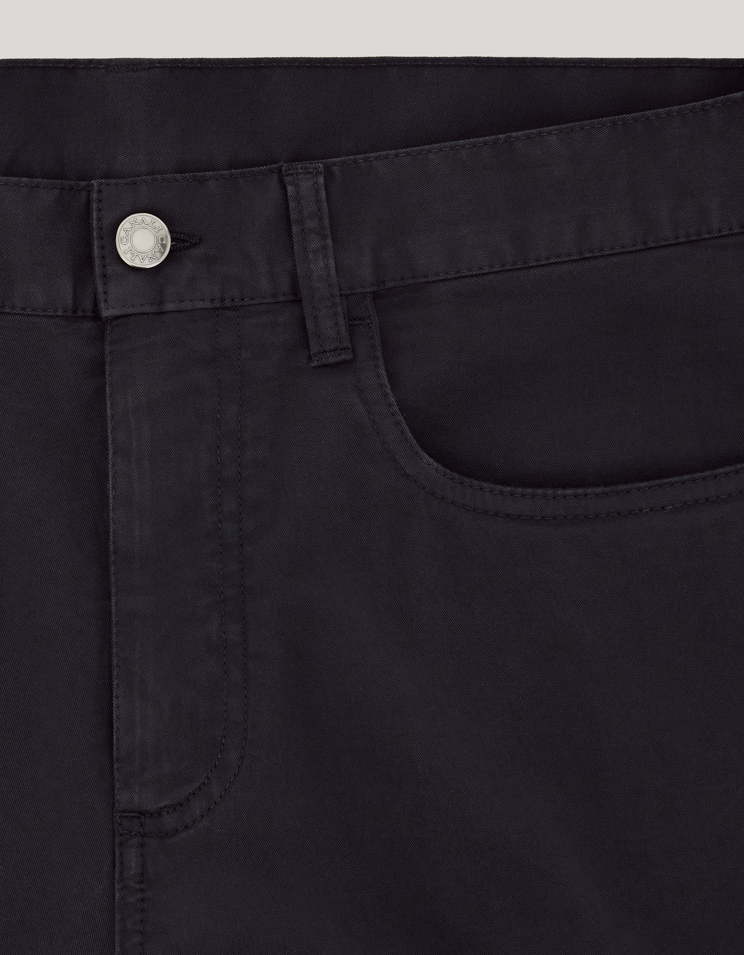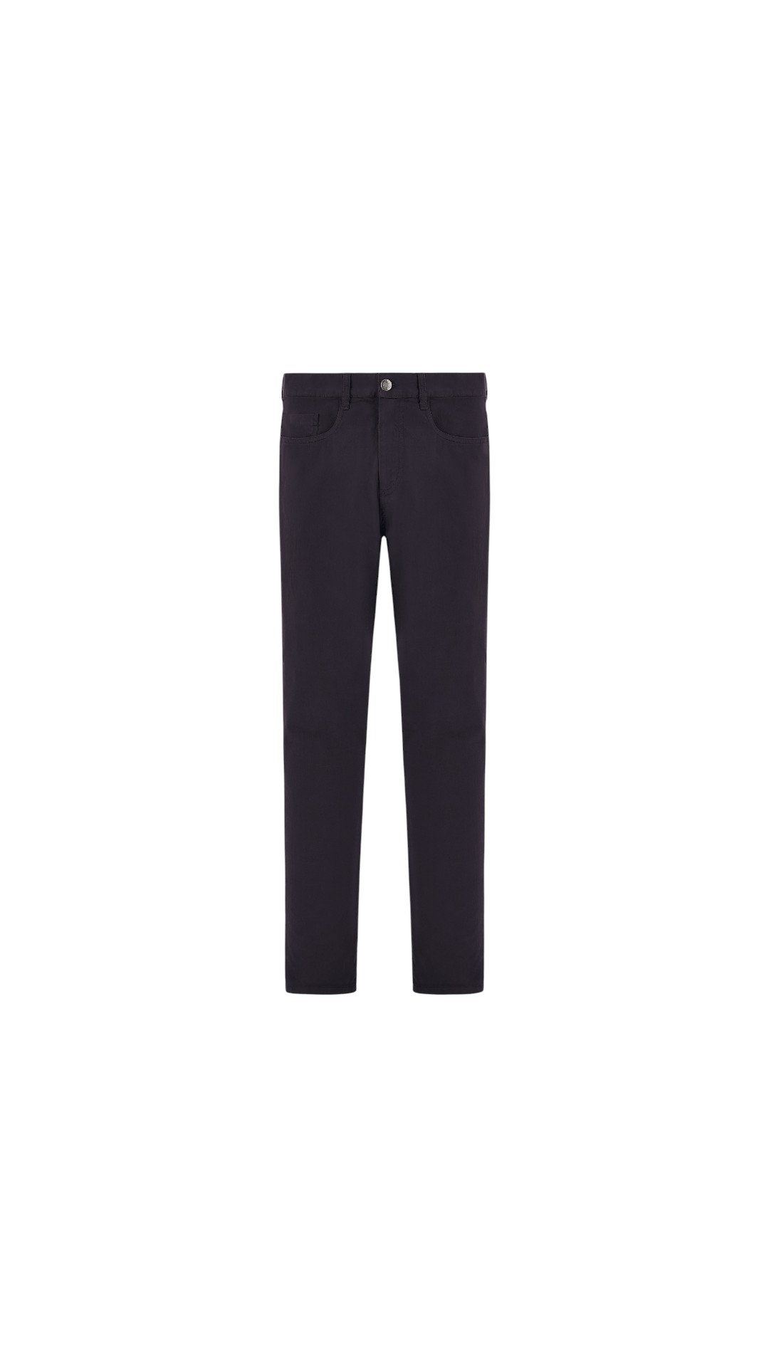 Универсальные брюки с застежкой на молнию и пуговицу дополнены пятью карманами, шлевками для ремня и кожаным патчем с логотипом бренда на поясе.