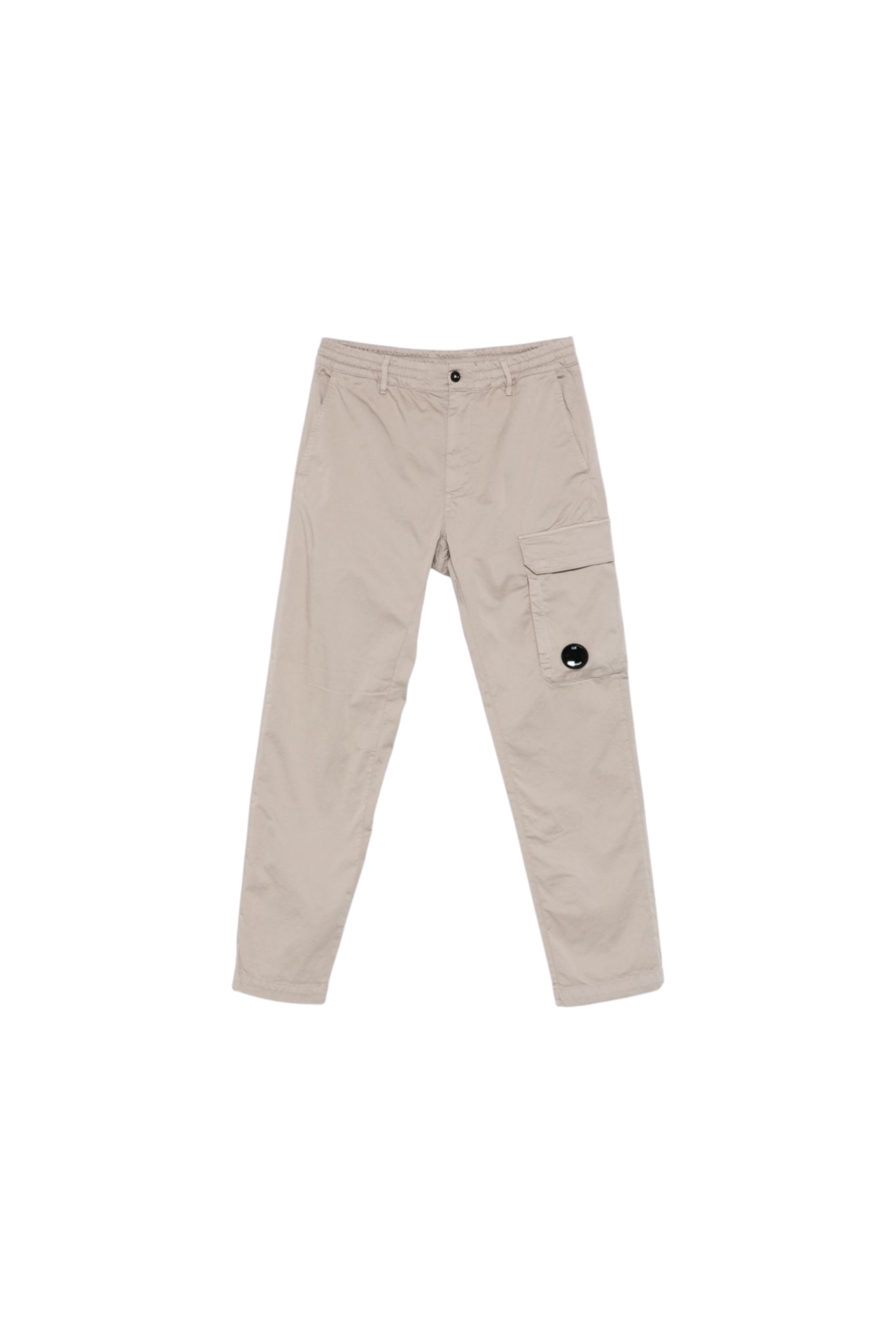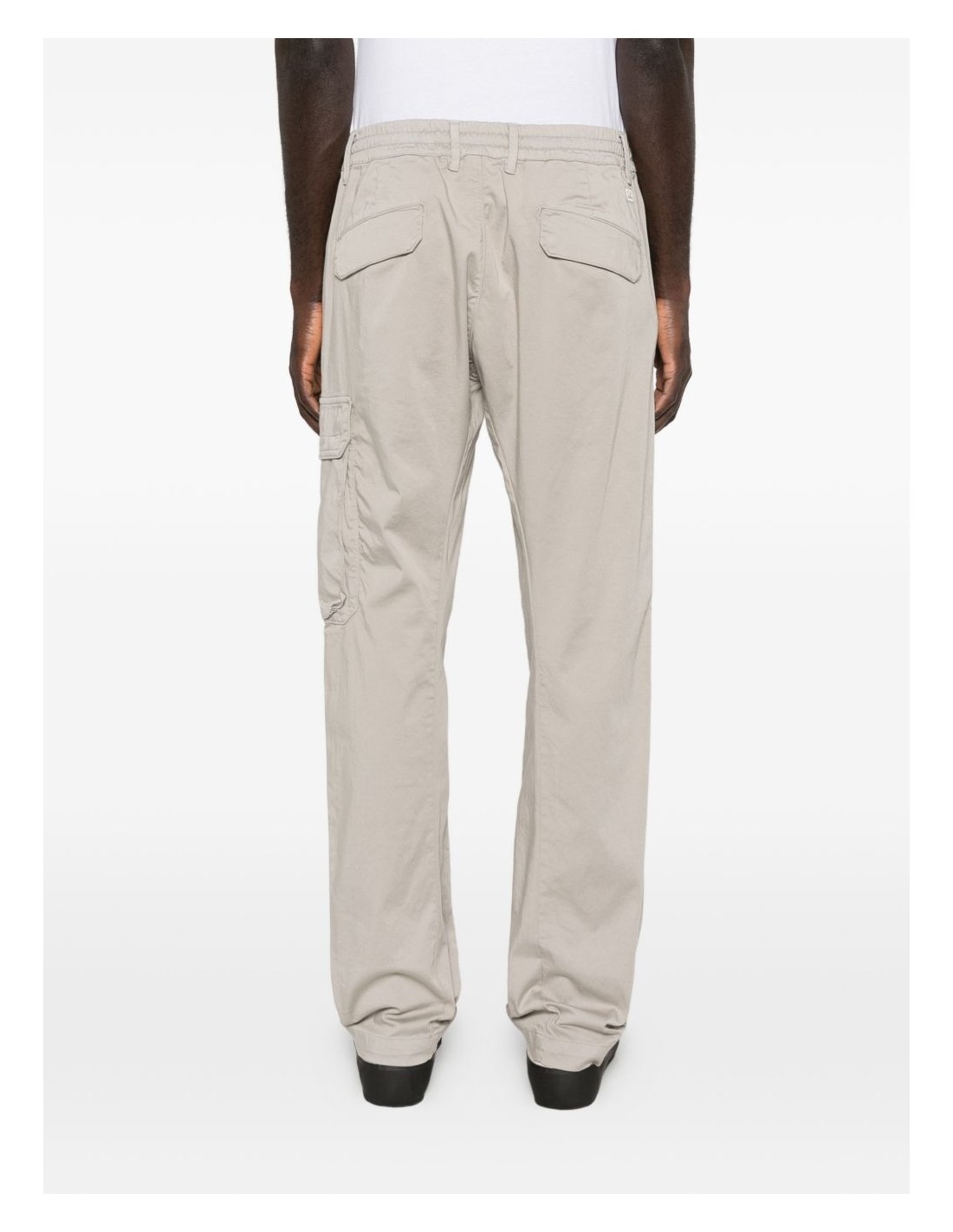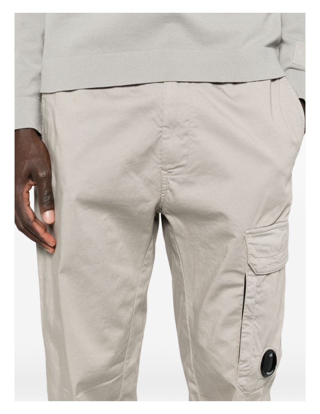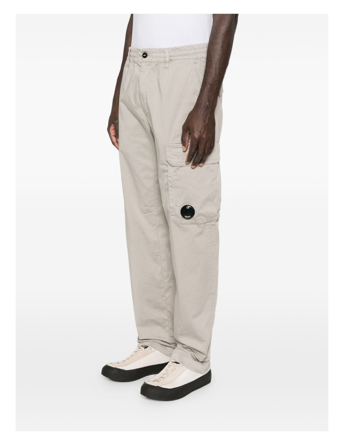 Функциональные брюки-карго из эластичного хлопка с застежкой на молнию и пуговицу украшены на накладном кармане фирменной линзой бренда.