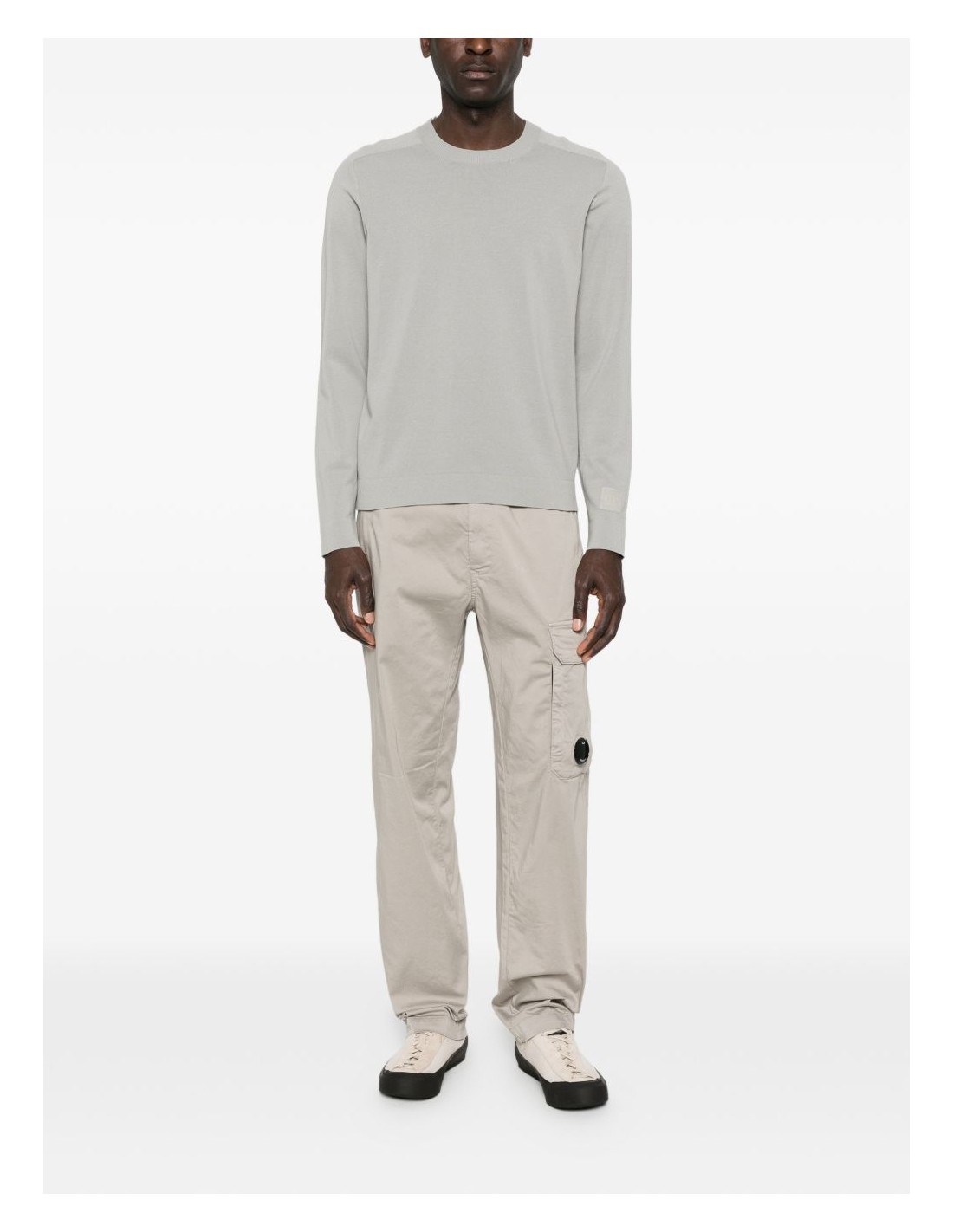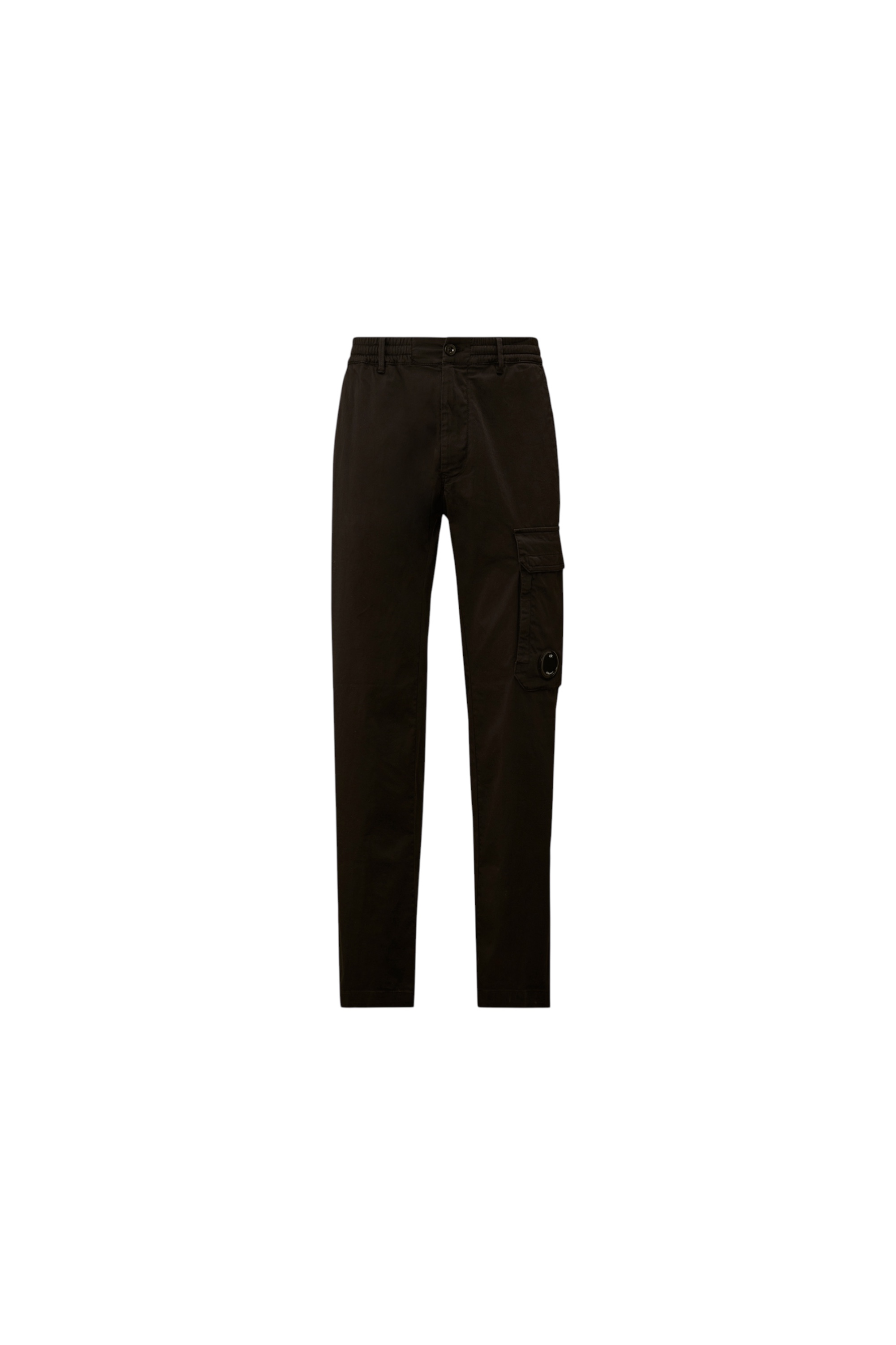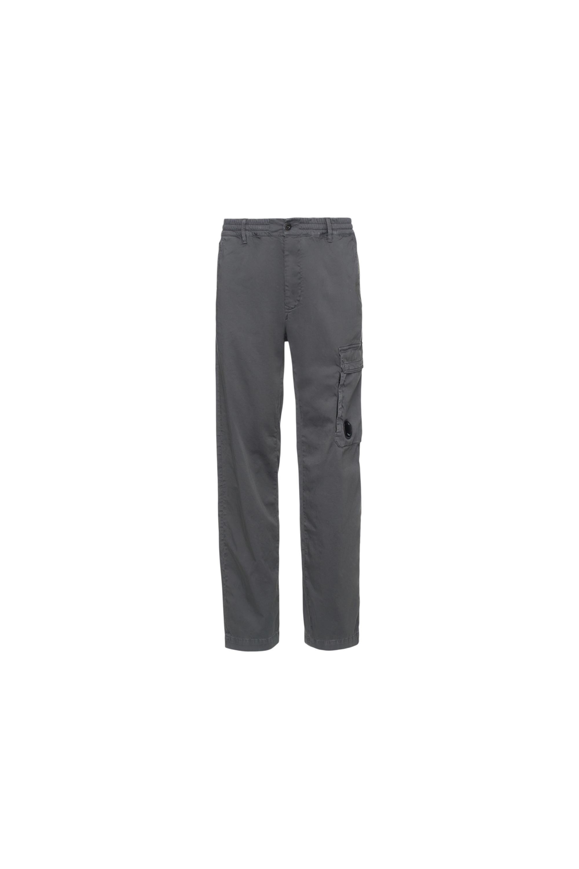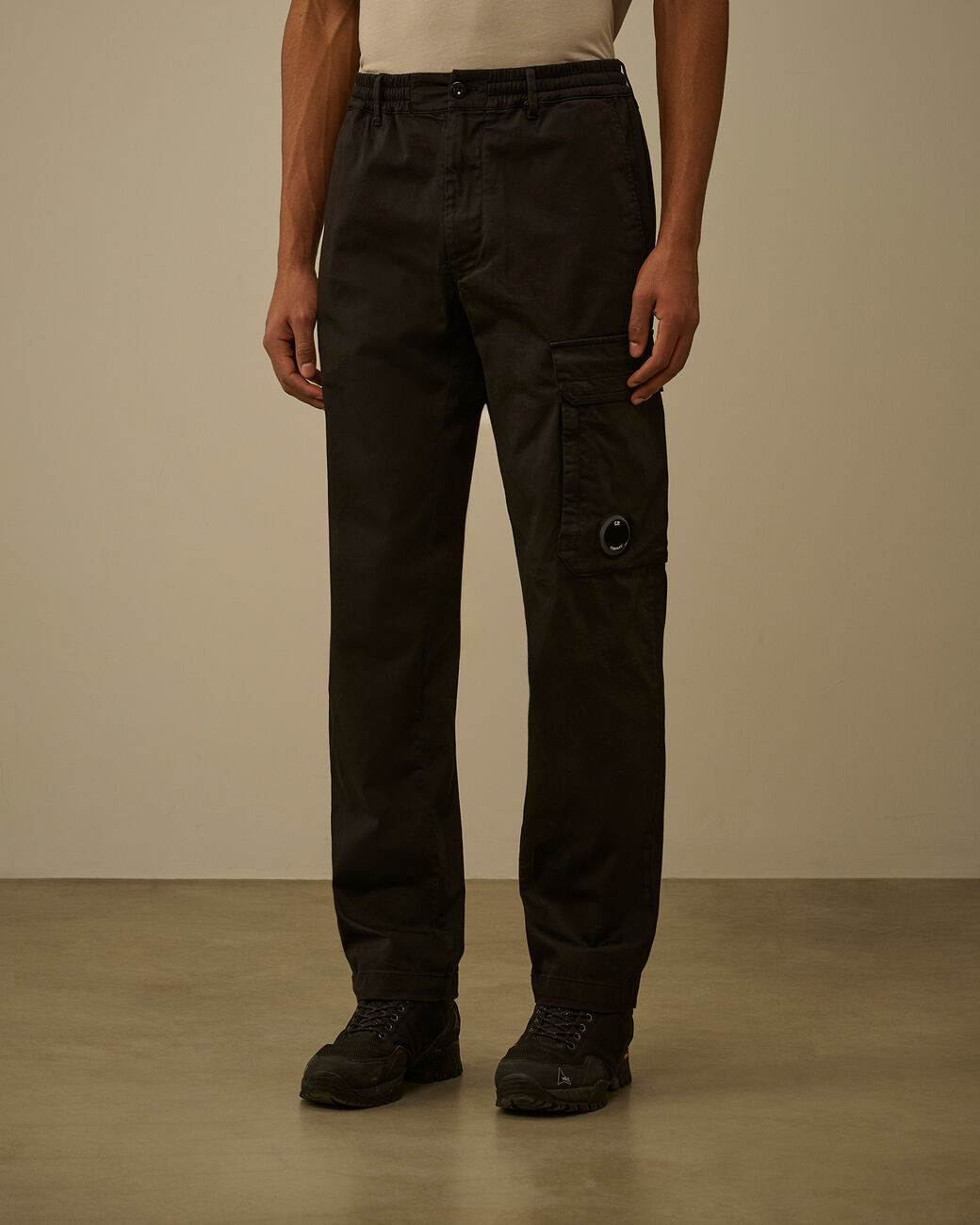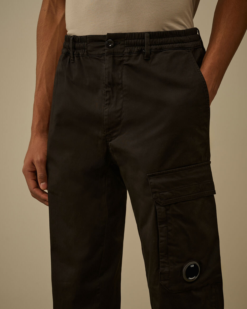 Функциональные брюки-карго из эластичного хлопка с застежкой на молнию и пуговицу украшены на накладном кармане фирменной линзой бренда.