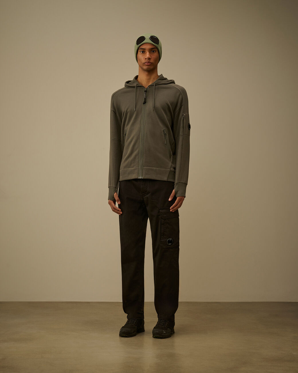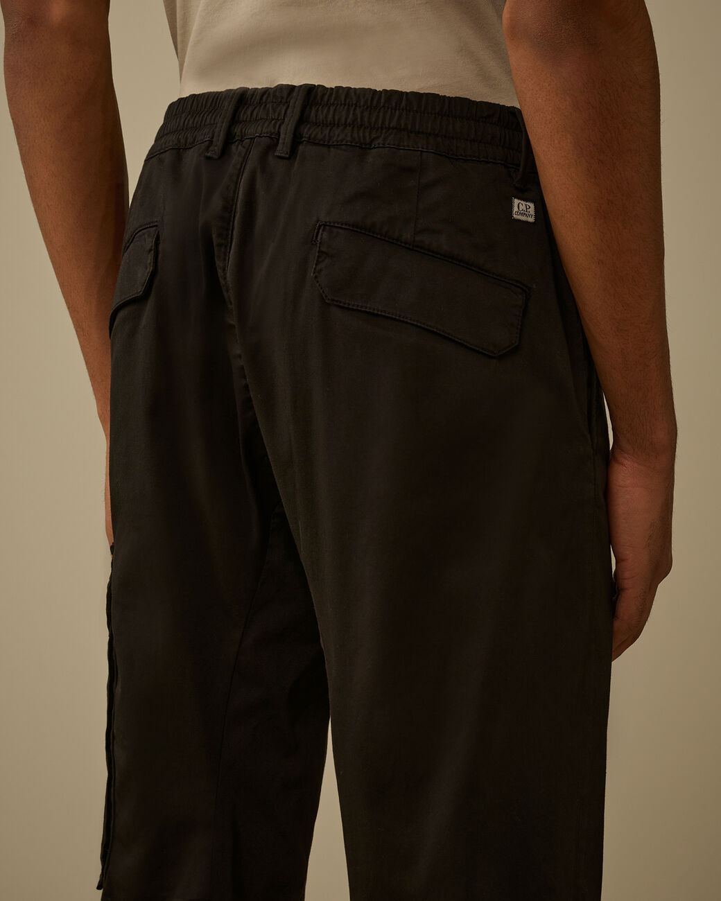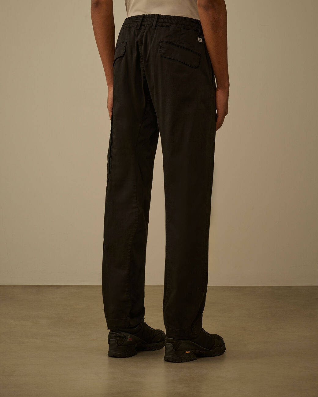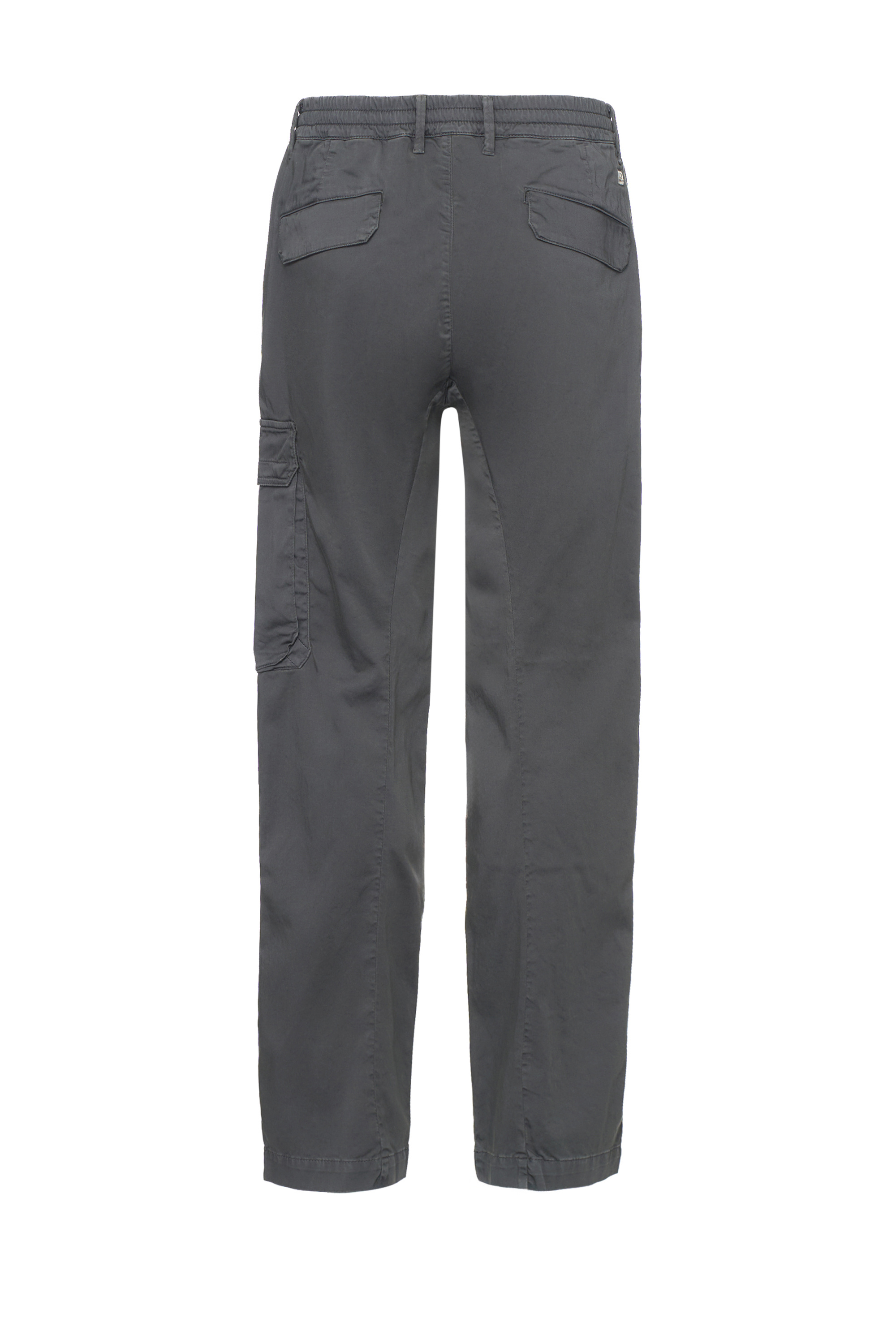 Функциональные брюки-карго из эластичного хлопка с застежкой на молнию и пуговицу украшены на накладном кармане фирменной линзой бренда.