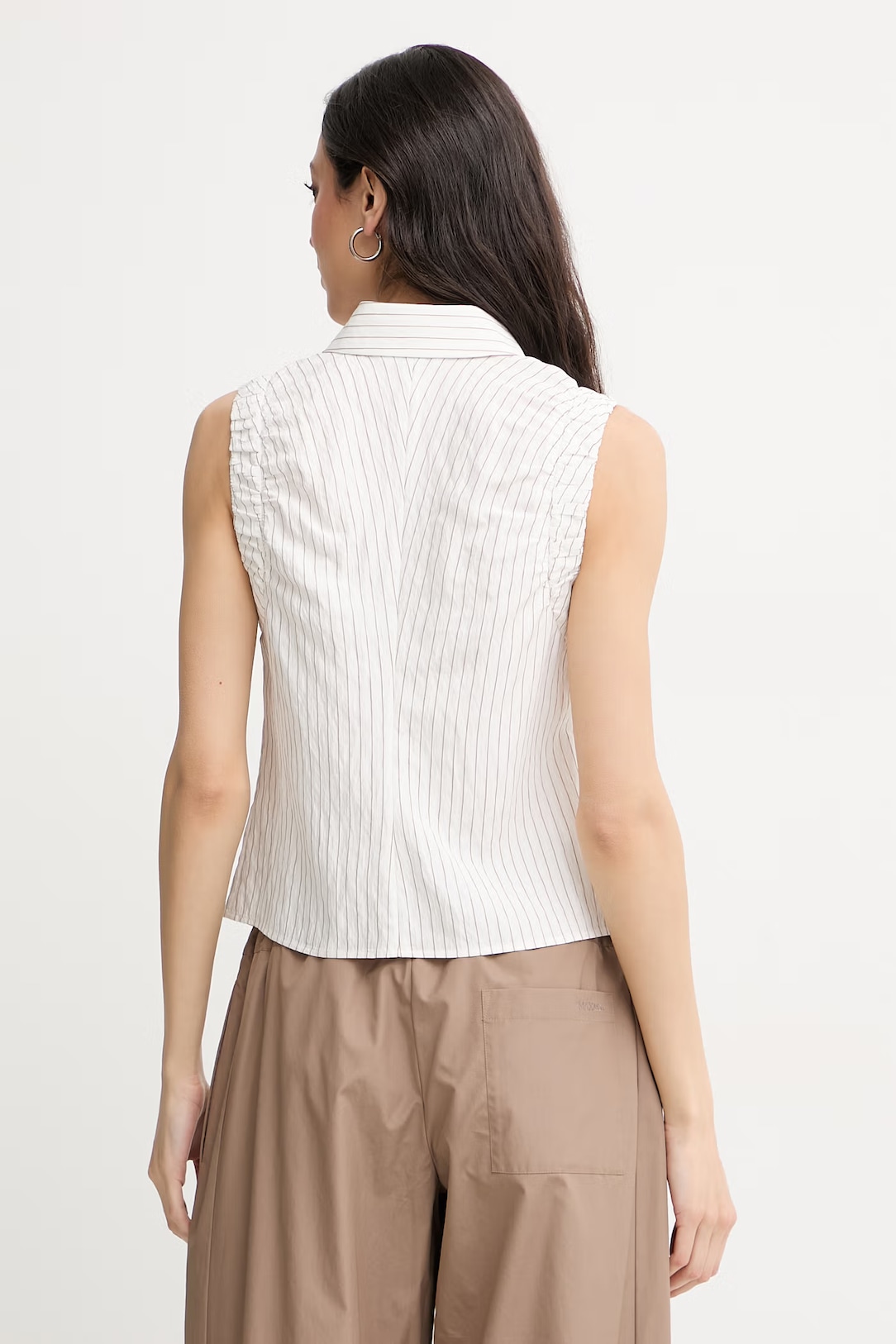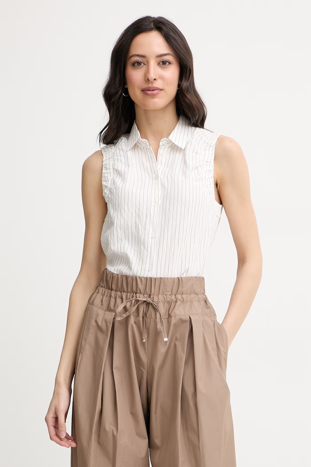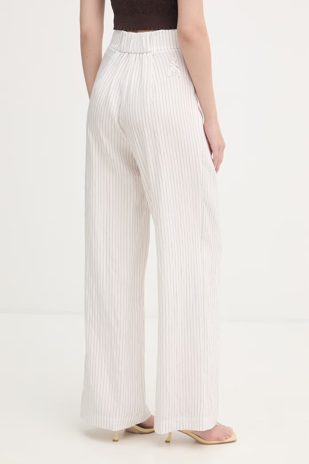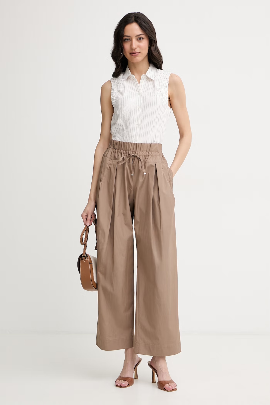 Струящиеся брюки из вискозы и нейлона с принтом в полоску на высокой талии дополнены боковыми карманами.