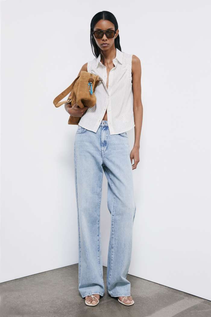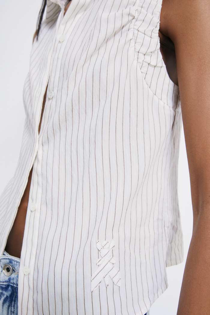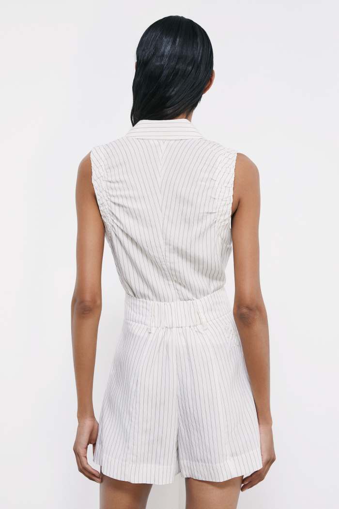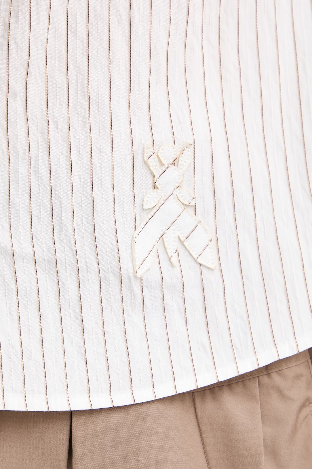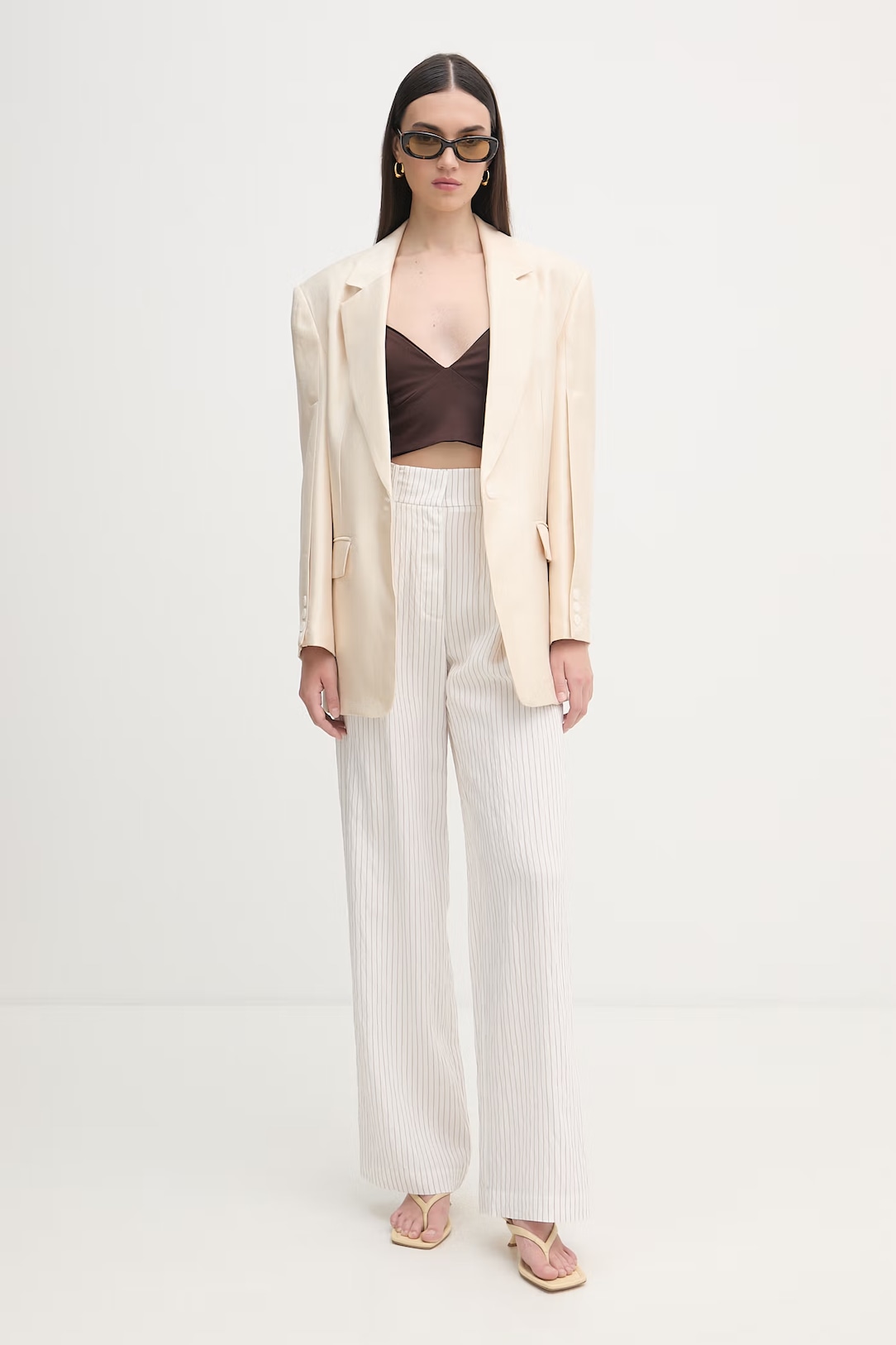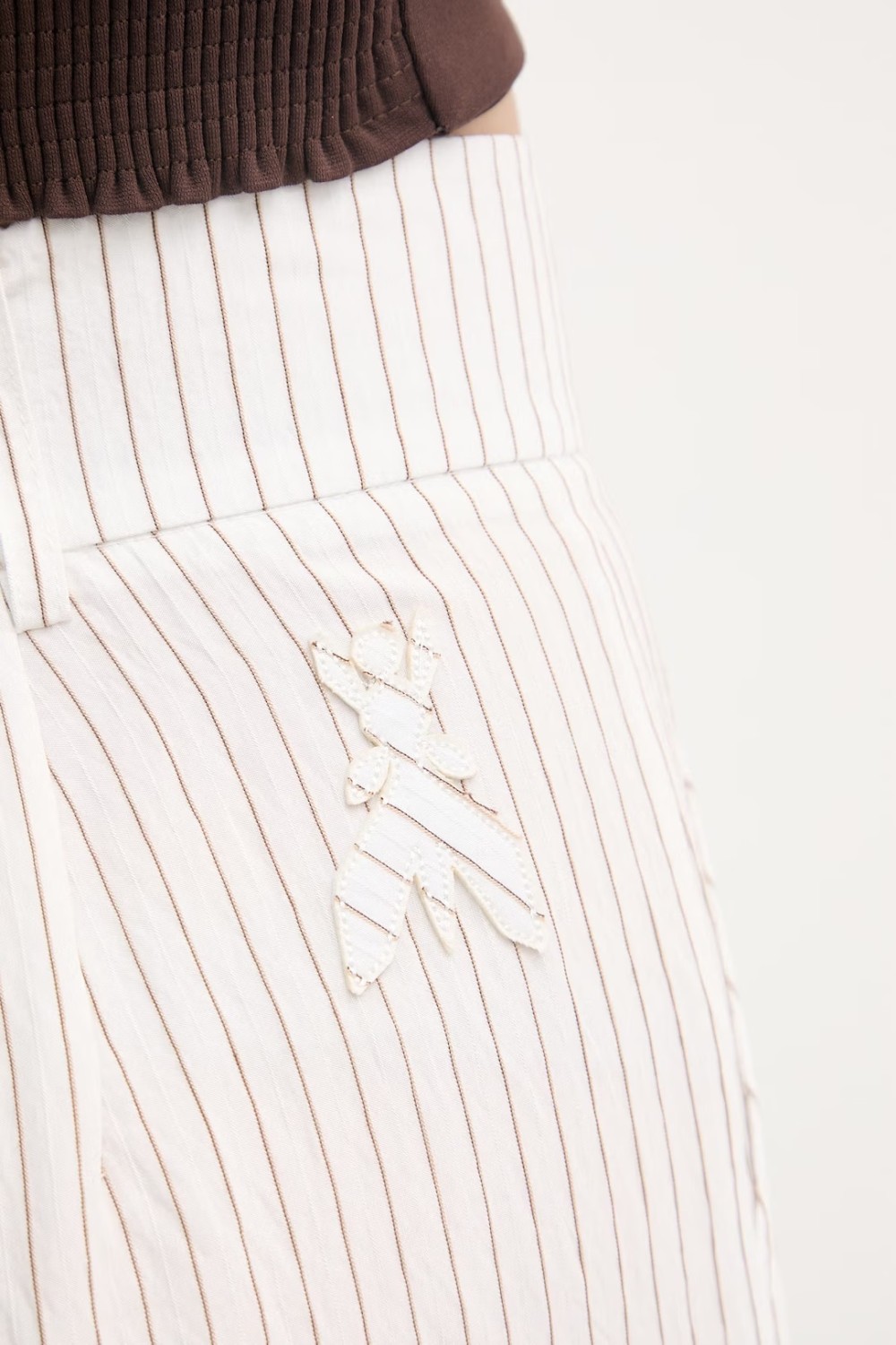 Струящиеся брюки из вискозы и нейлона с принтом в полоску на высокой талии дополнены боковыми карманами.