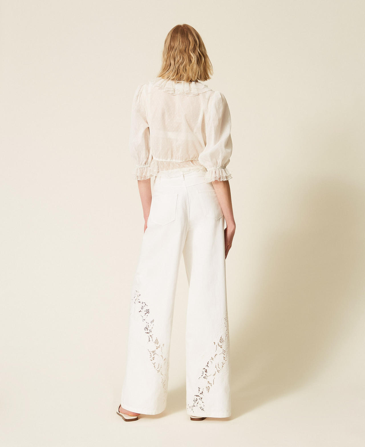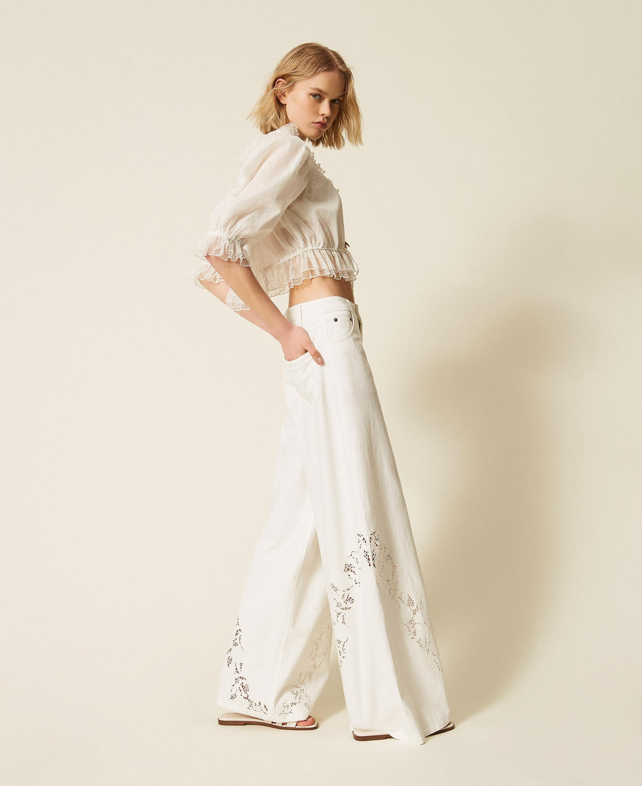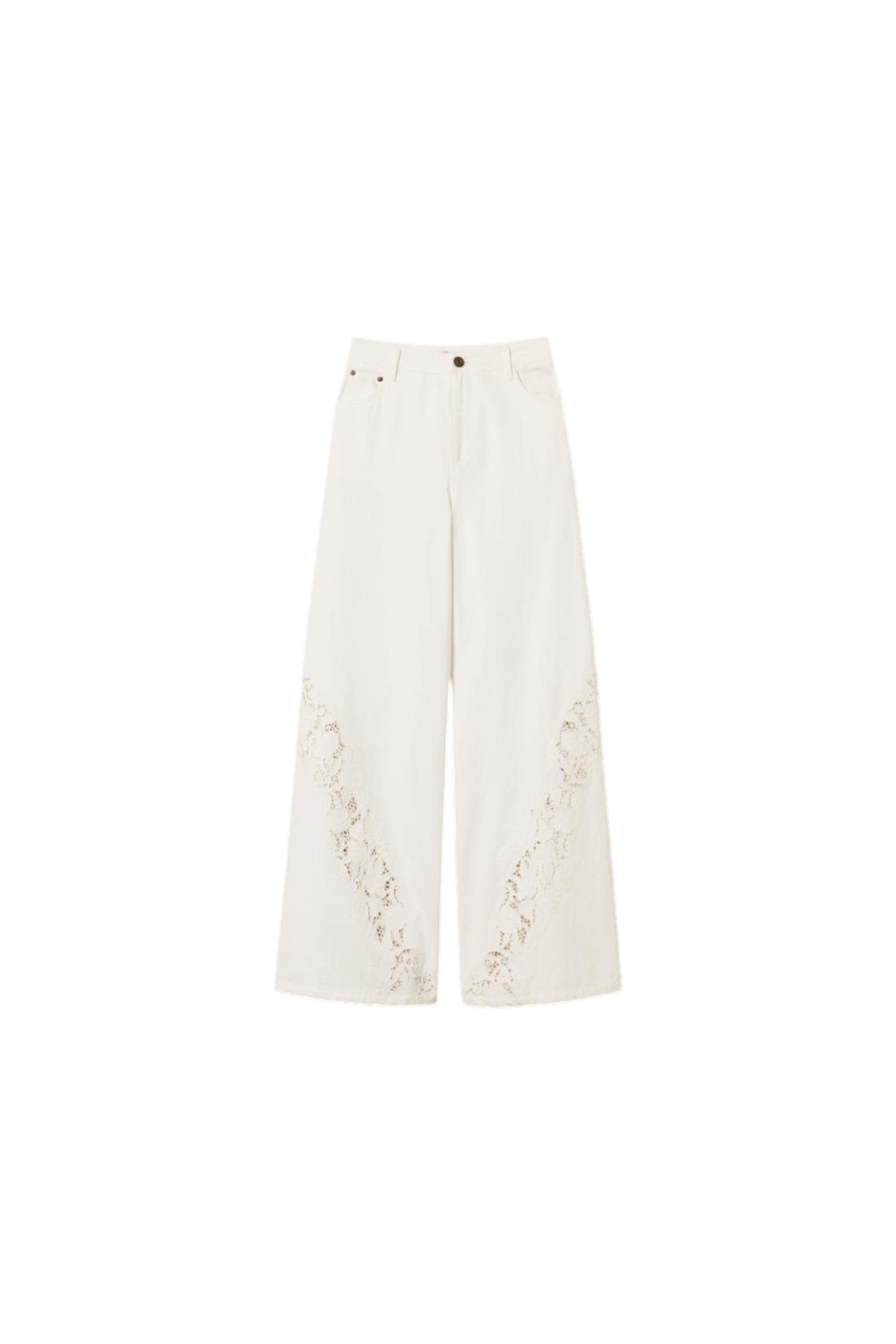 Широкие джинсы с застежкой на молнию и пуговицу дополнены пятью карманами и украшены эффектными ажурными вставками.