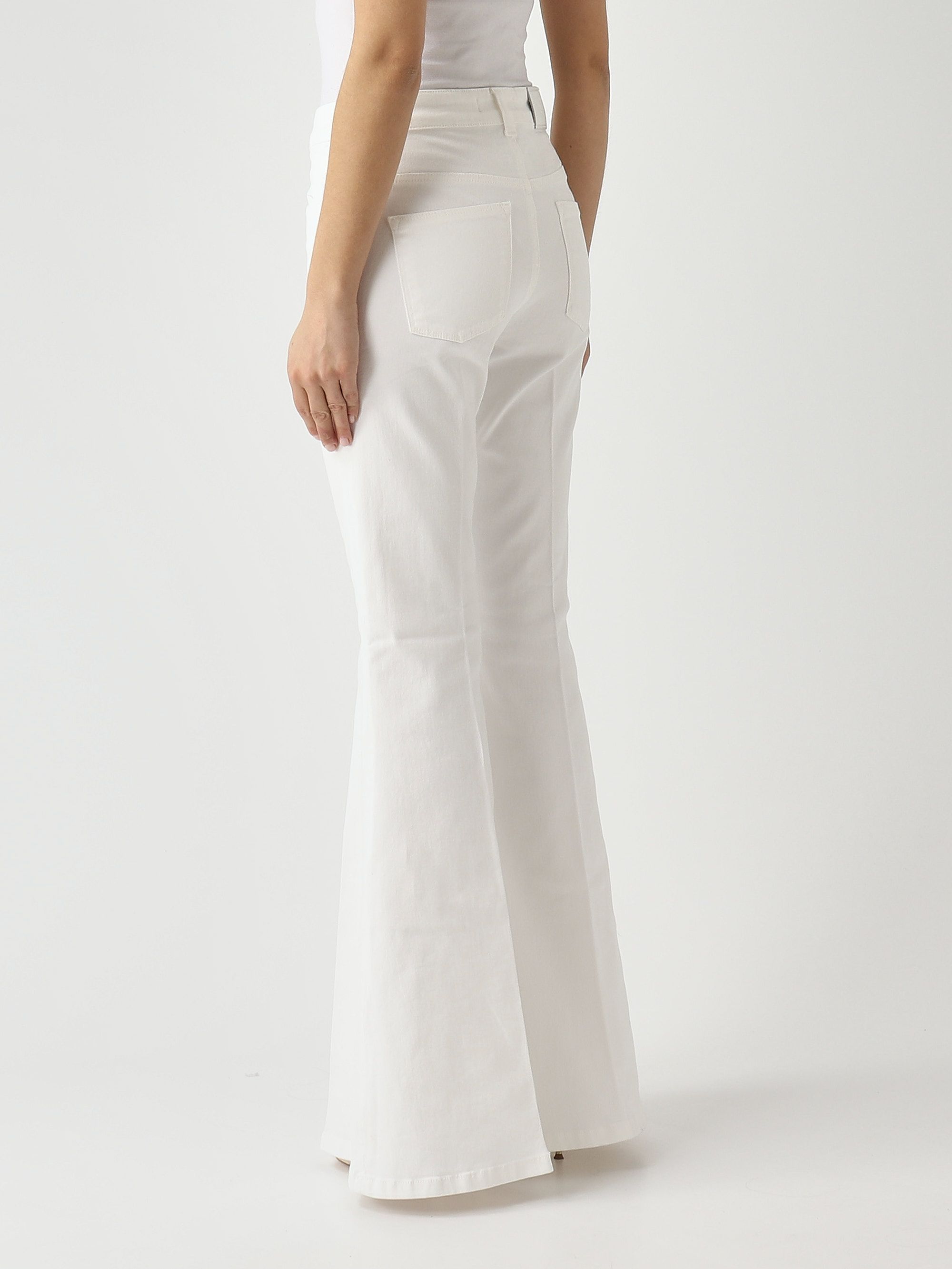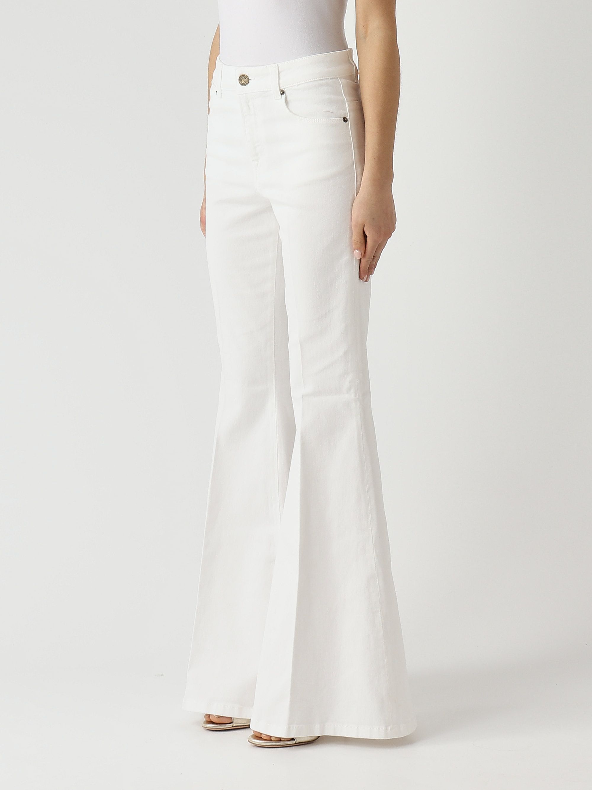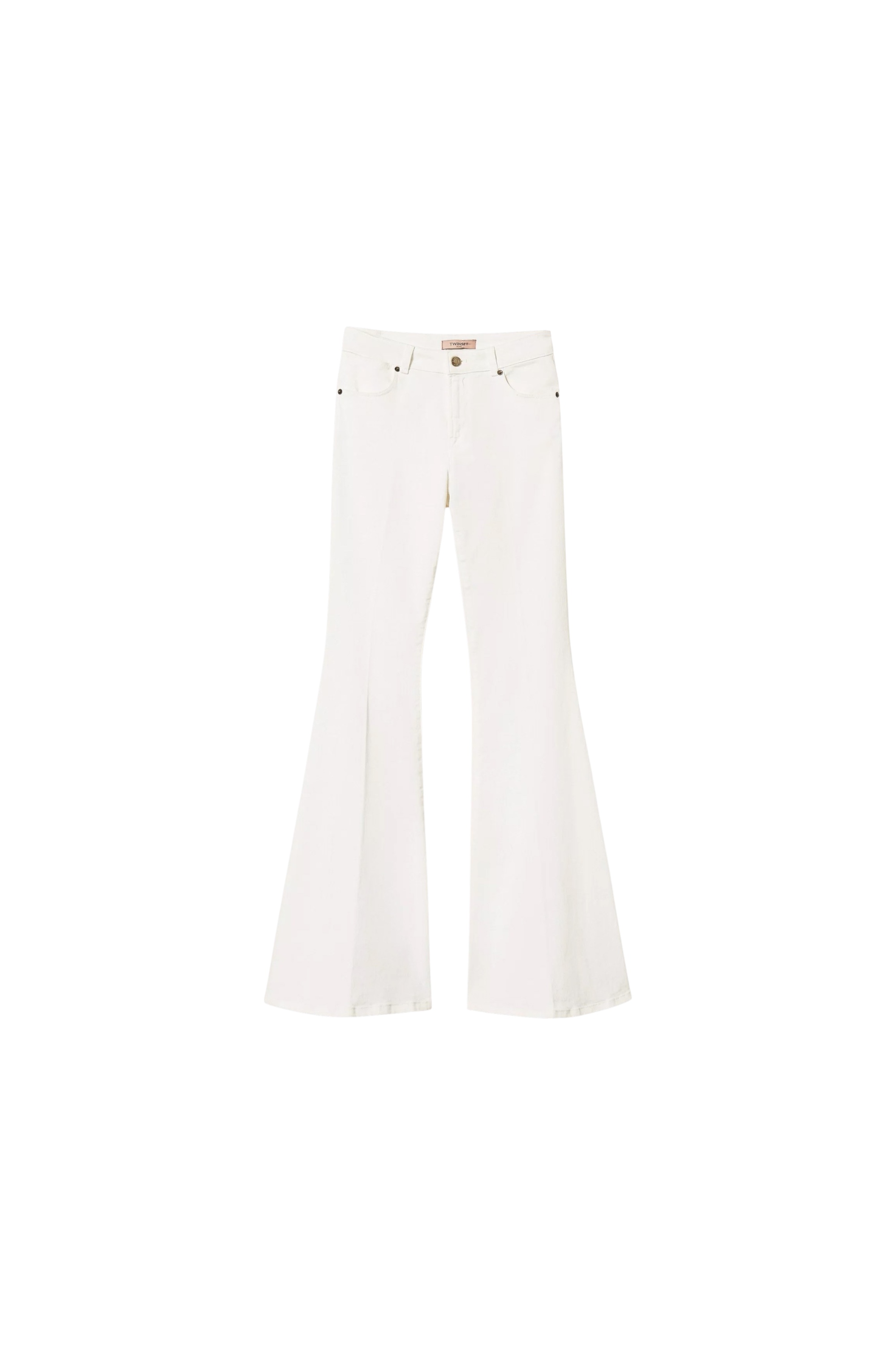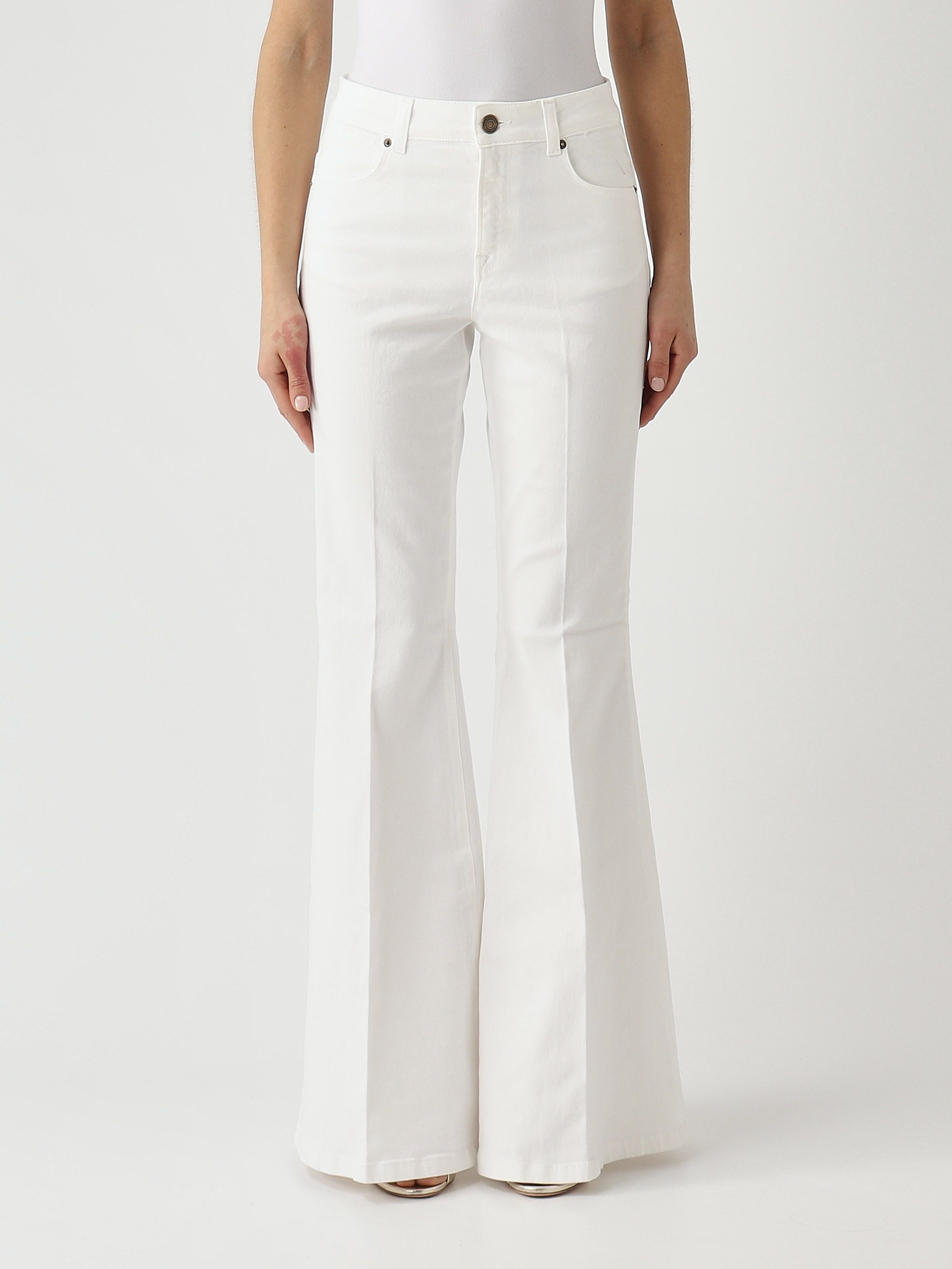 Расклешенные джинсы из эластичного хлопка с застежкой на молнию и пуговицу дополнены поясом со шлевками для ремня и карманами.