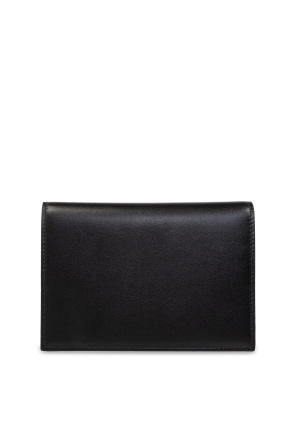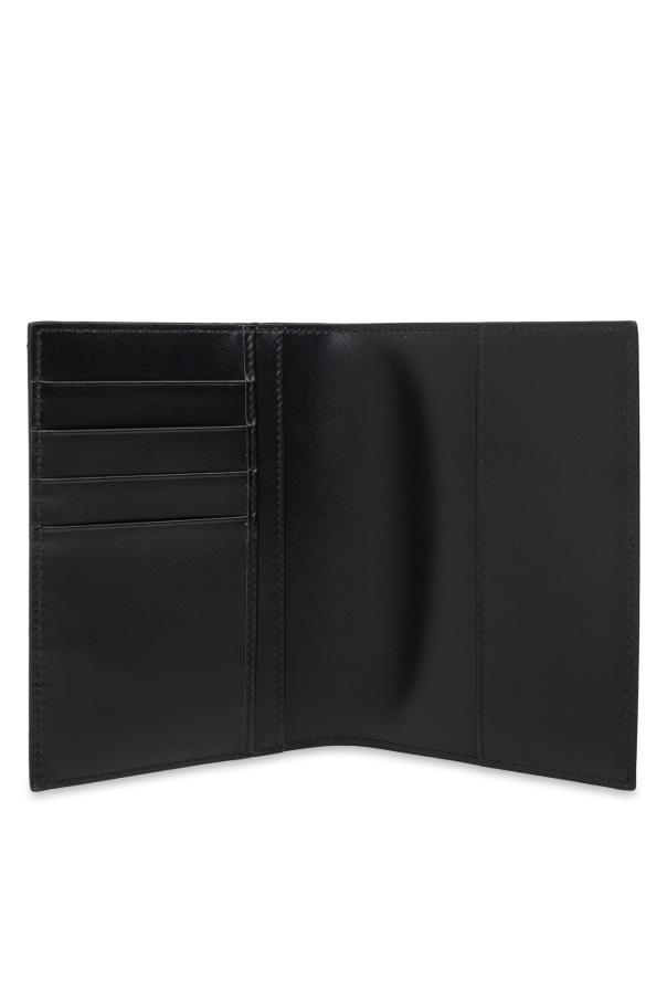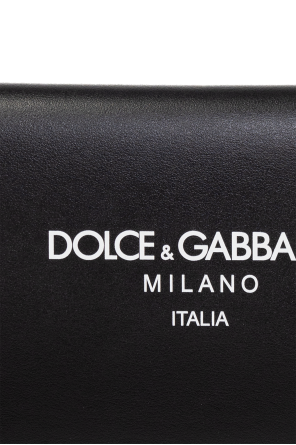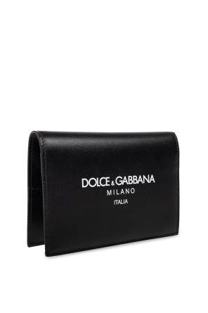Черный кошелек от Dolce & Gabbana. Модель выполнена из кожи и украшена принтом белого логотипа спереди, тремя накладными карманами и четырьмя отделениями для карточек внутри