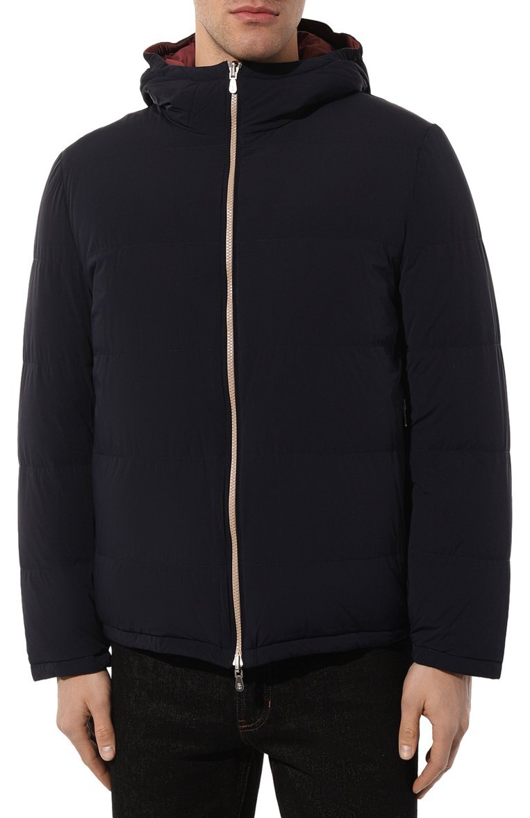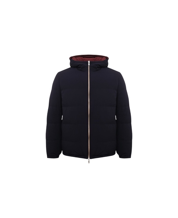 Двустороннее исполнение позволяет носить пуховик темно-синей или бордовой стороной наружу. Для пошива модели выбрали плотный нейлон с добавлением эластана: мембранная ткань отталкивает влагу, не продувается ветром и при этом хорошо пропускает воздух.