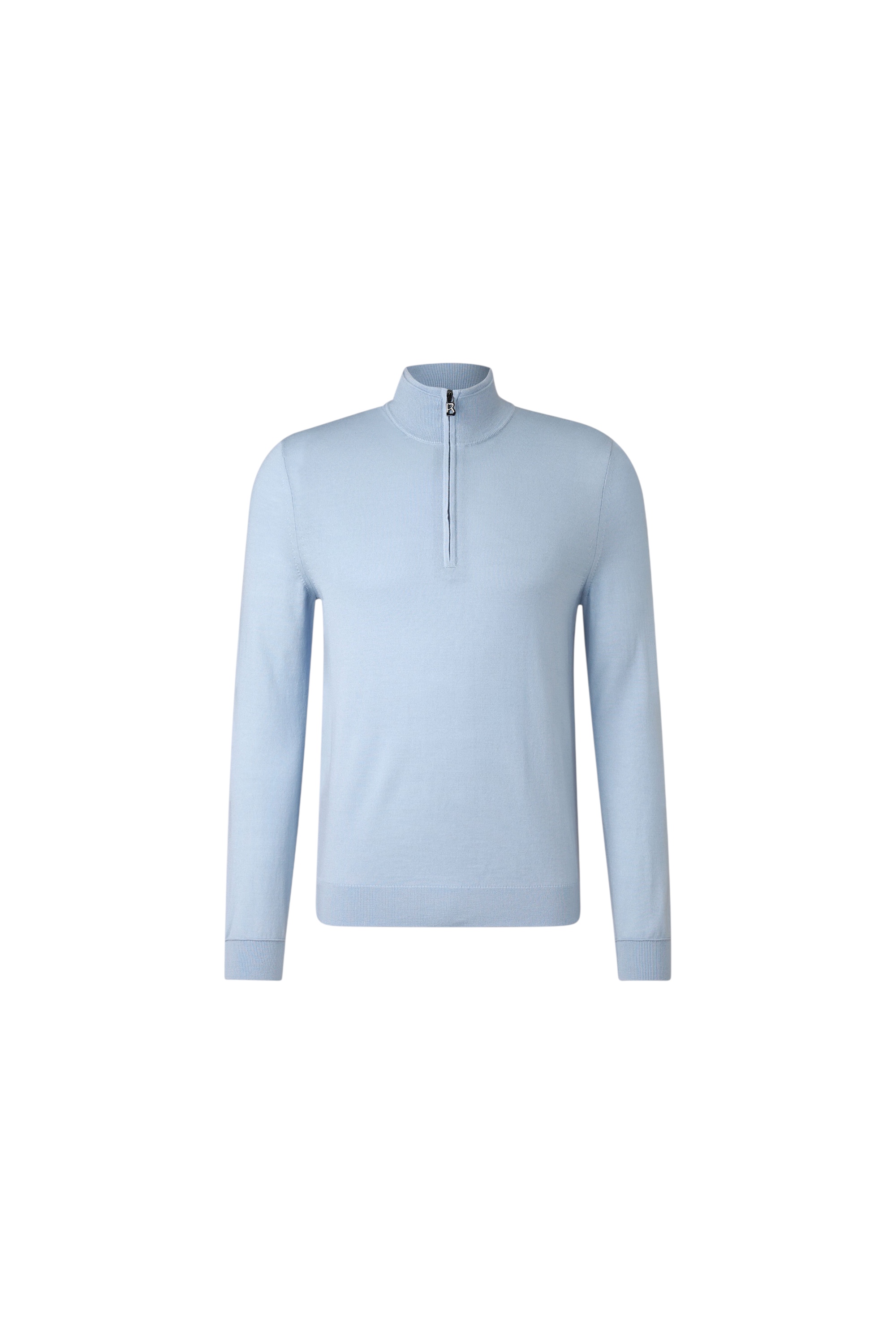 Джемпер из мягкой шерсти прямого силуэта с эластичными манжетами и поясом, высоким воротником дополнен короткой застежкой на молнию.