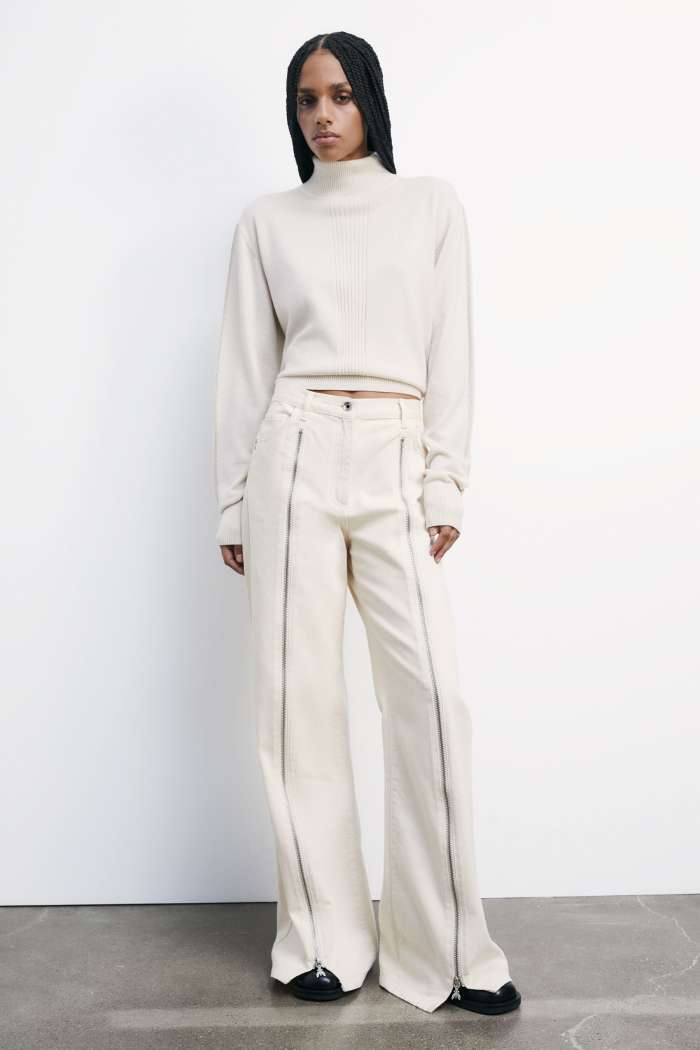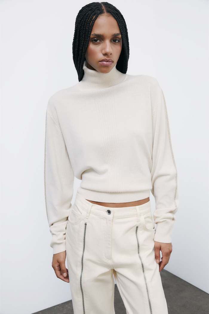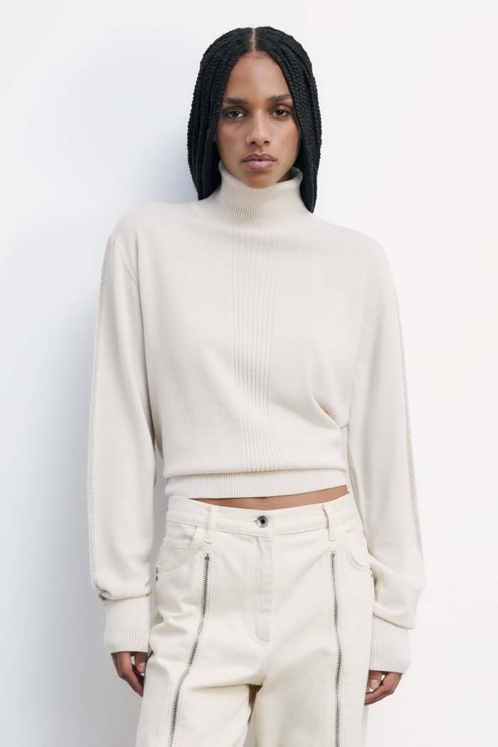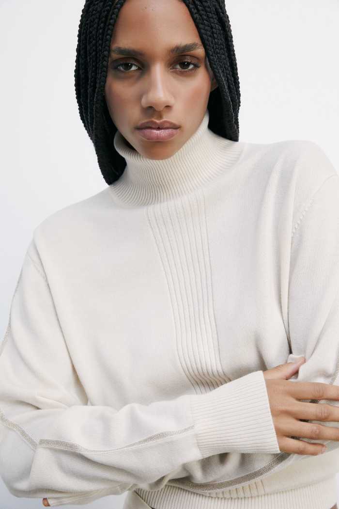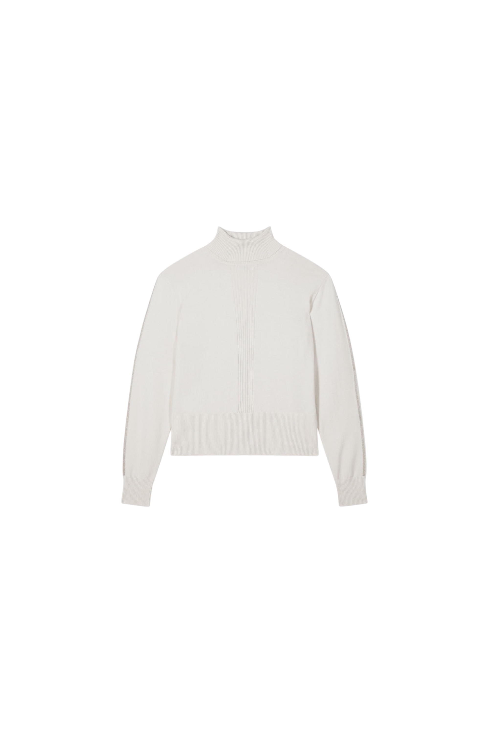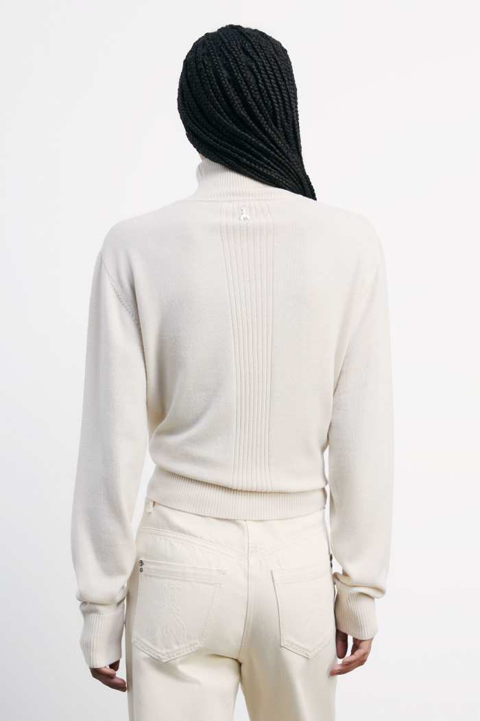 Джемпер слегка расслабленного силуэта со спущенной линией плеч и высоким воротником украшен вставками на рукавах и фирменным логотипом бренда на спине.