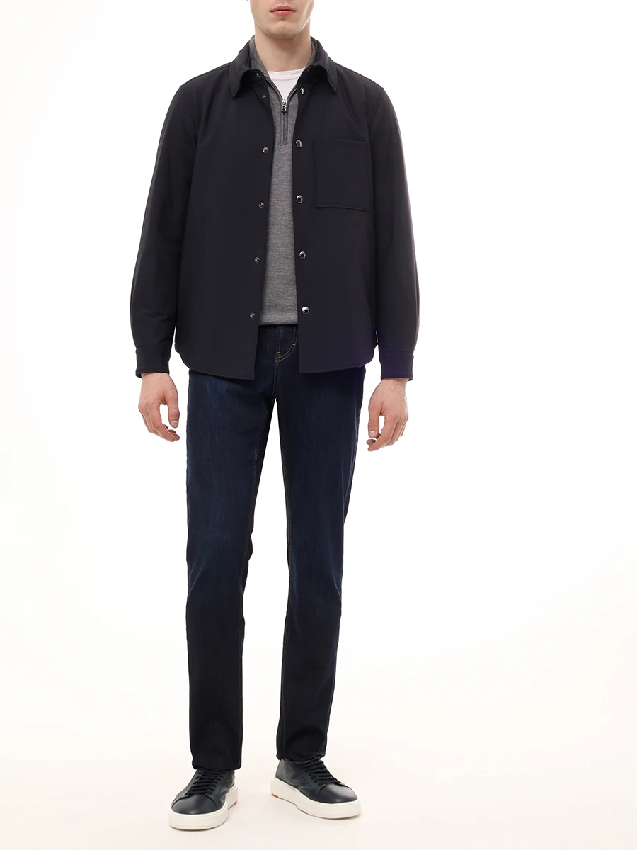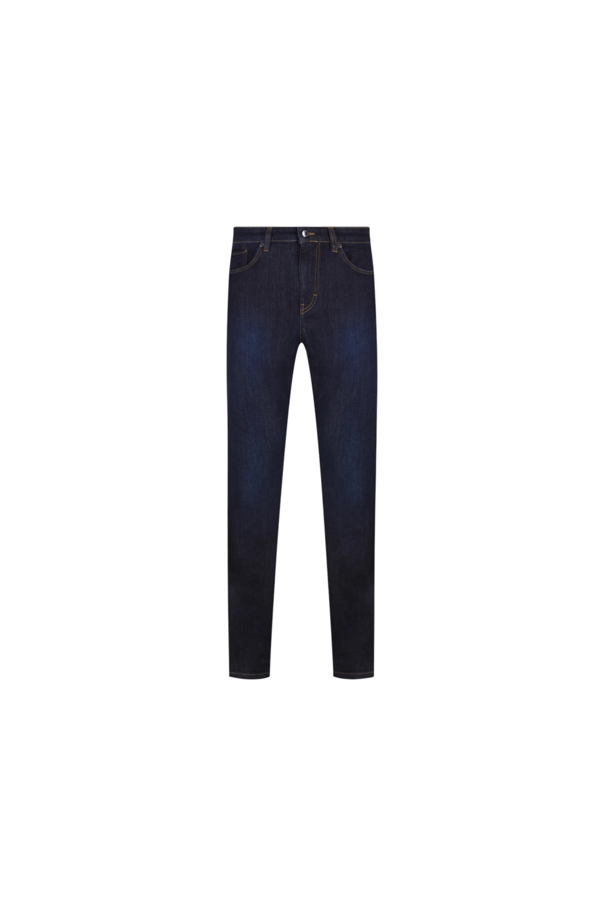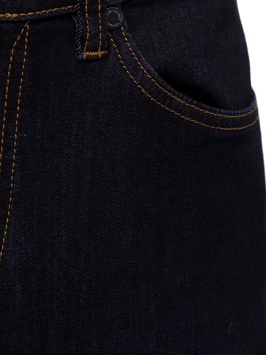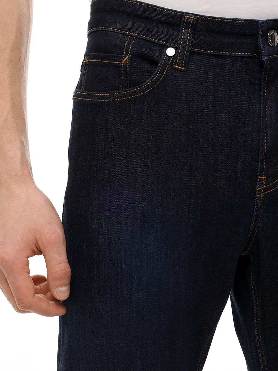 Джинсы из стрейч-хлопка стандартного кроя и посадки с поясом со шлевками, прорезными и накладными карманами, застежкой на молнию и пуговицу. Изделие дополнили нашивкой с логотипом бренда сзади и контрастной отстрочкой деталей.