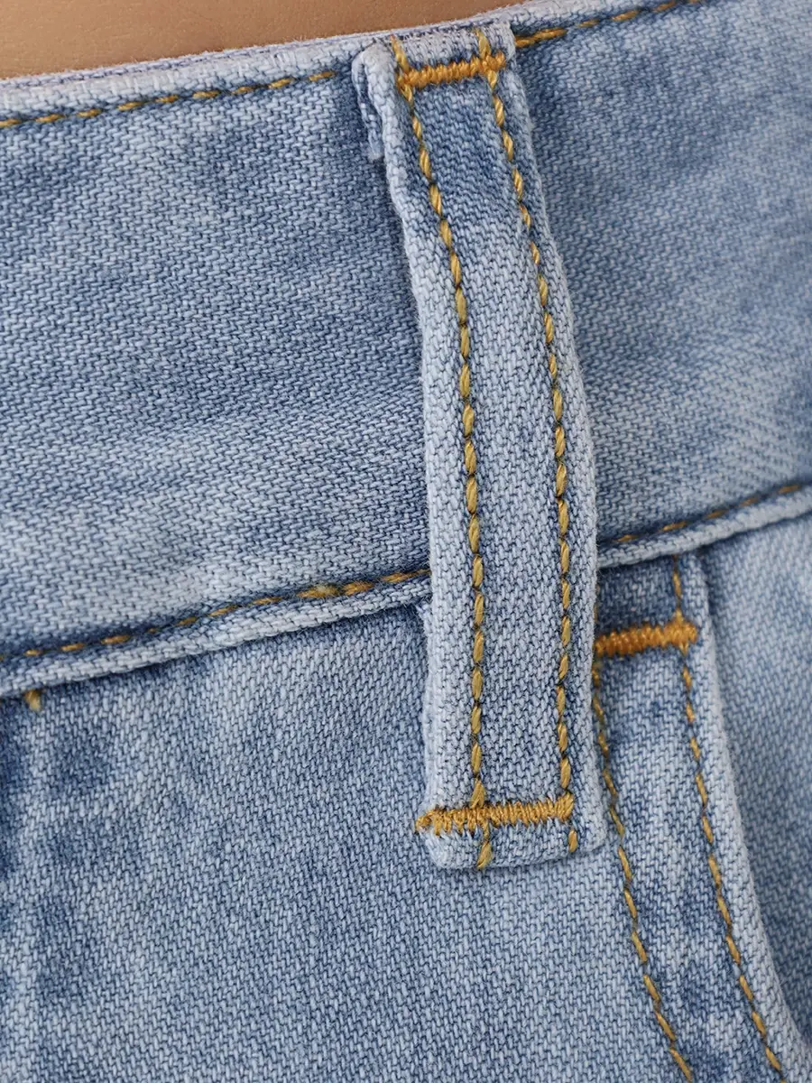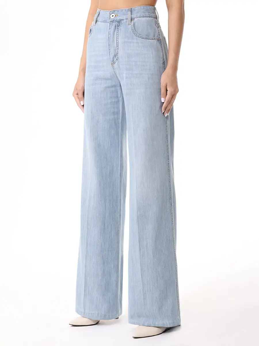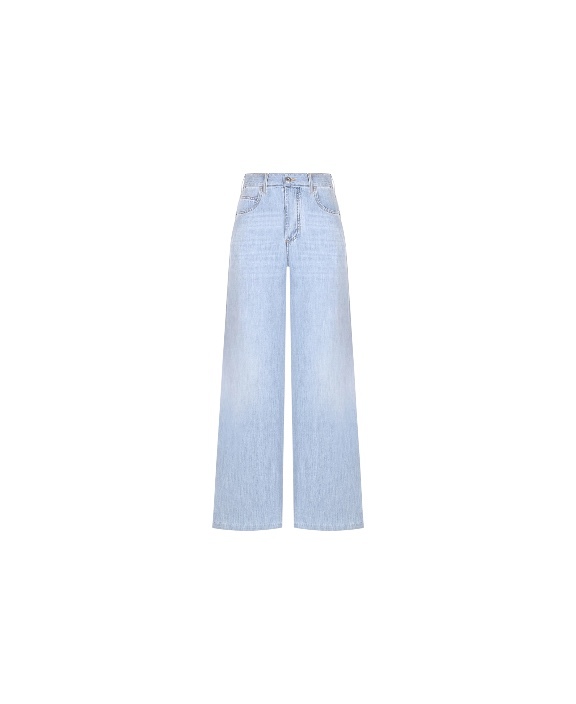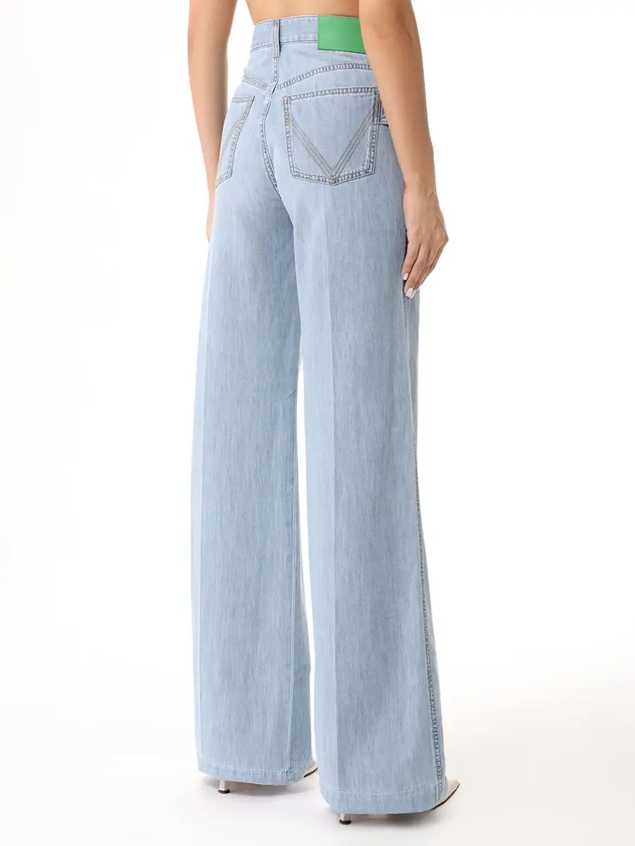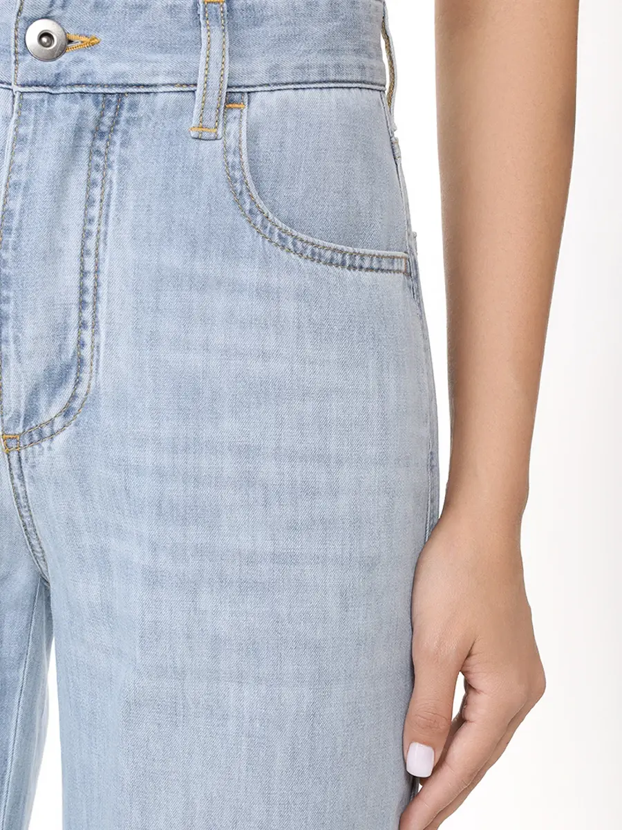 Джинсы из хлопка широкого кроя с высокой посадкой и застежкой на пуговицы дополнили поясом со шлевками, прорезными и накладными карманами. Сзади изделие украсили нашивкой с логотипом бренда.