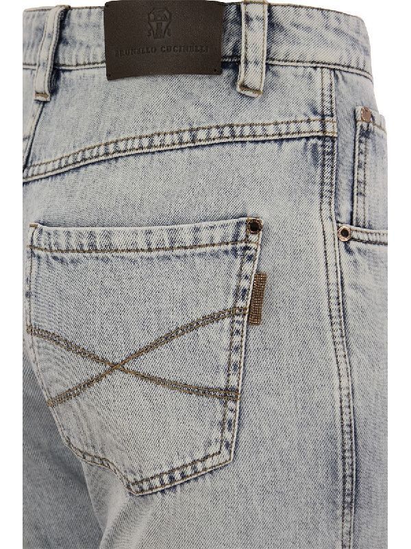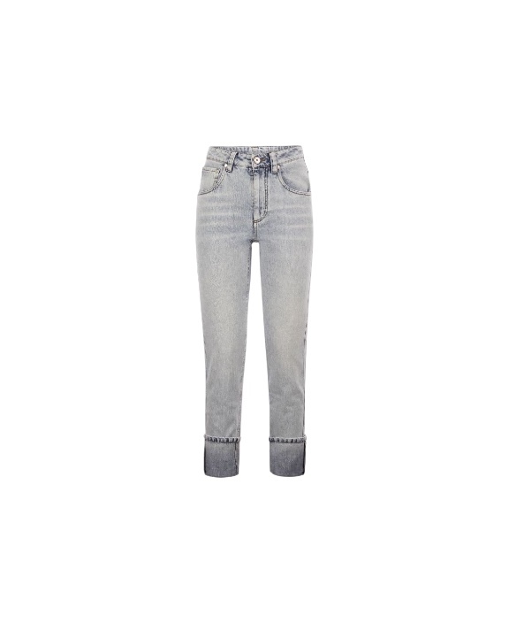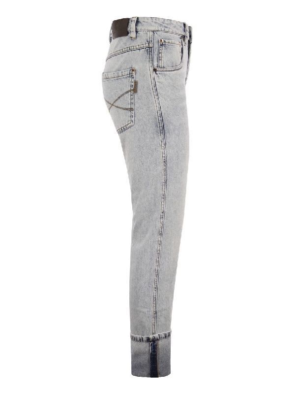 Лаконичные джинсы зауженного силуэта с застежкой на молнию и пуговицу дополнены сзади на поясе кожаной нашивкой с логотипом бренда.