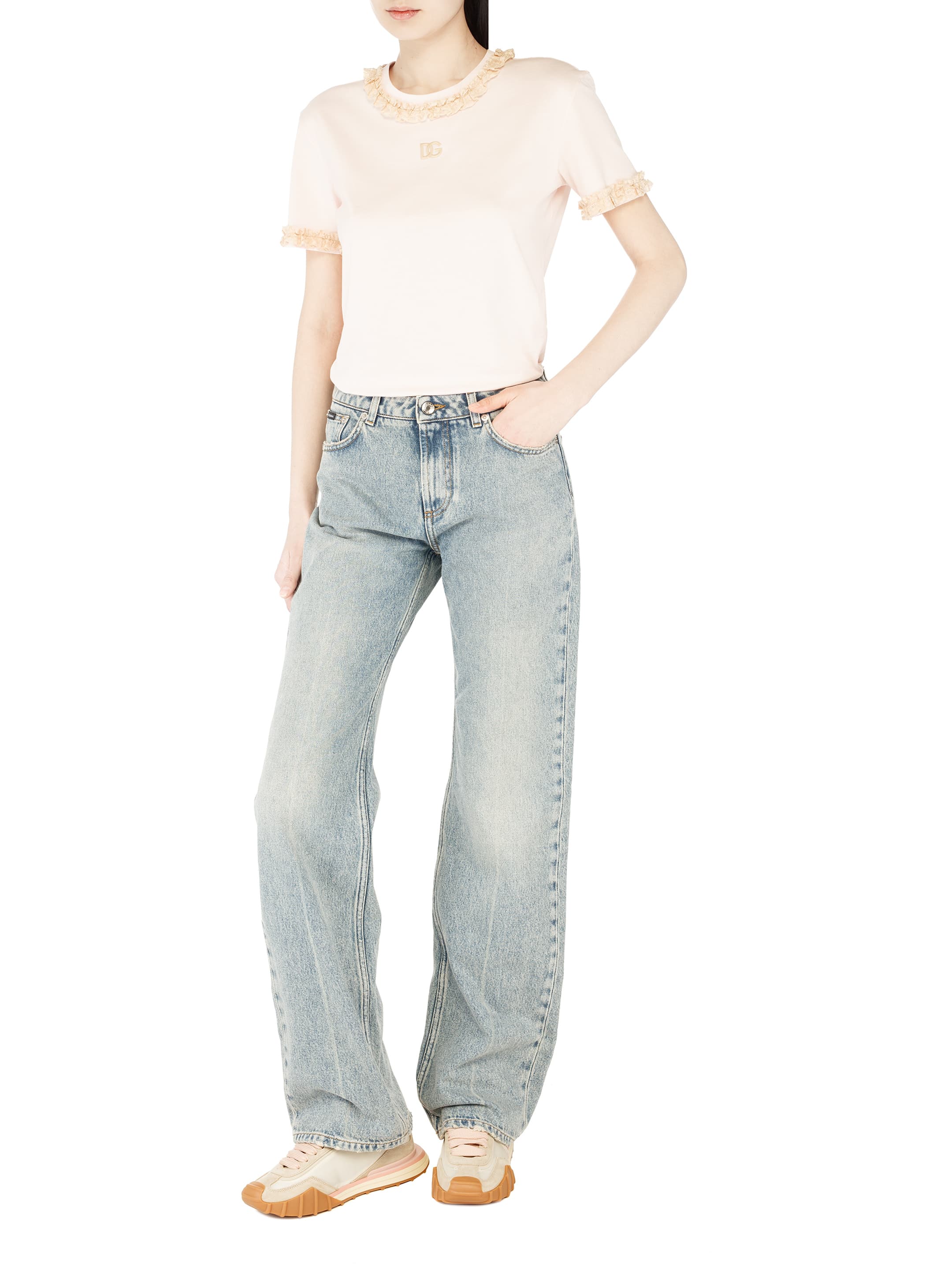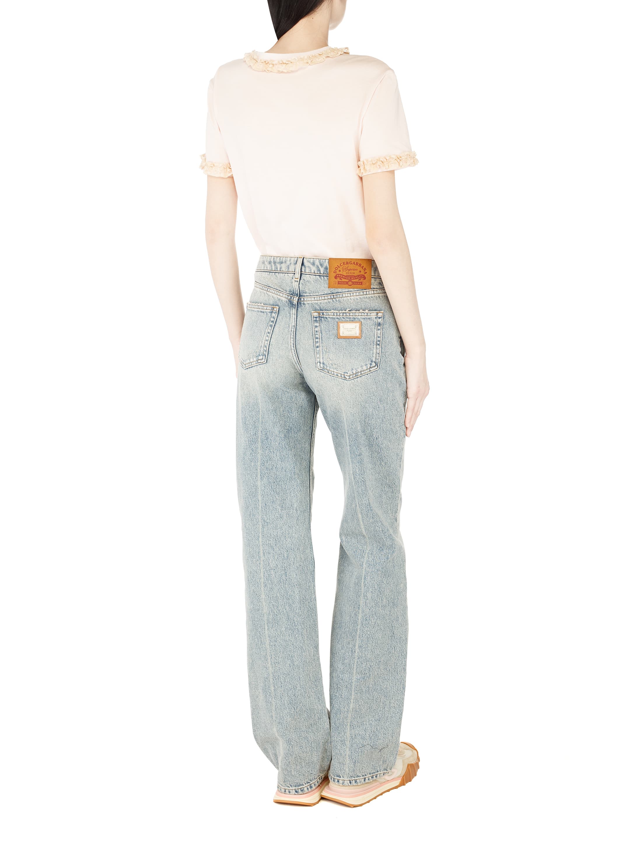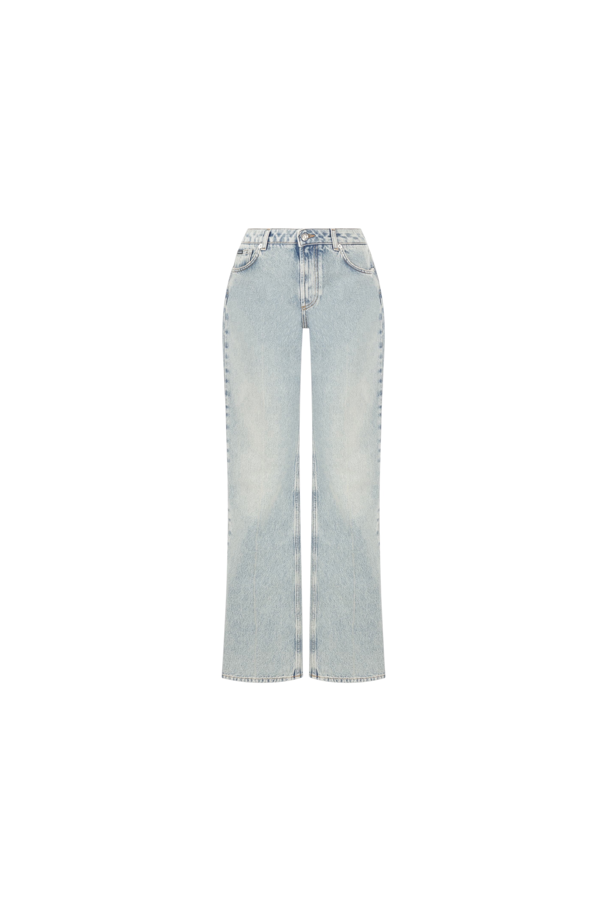 Классические джинсы прямого кроя на высокой посадке из плотного денима с застежкой на пуговицу и молнию дополнены пятью карманами, кожаным патчем на поясе и фирменным металлическим патчем с логотипом бренда на заднем кармане.