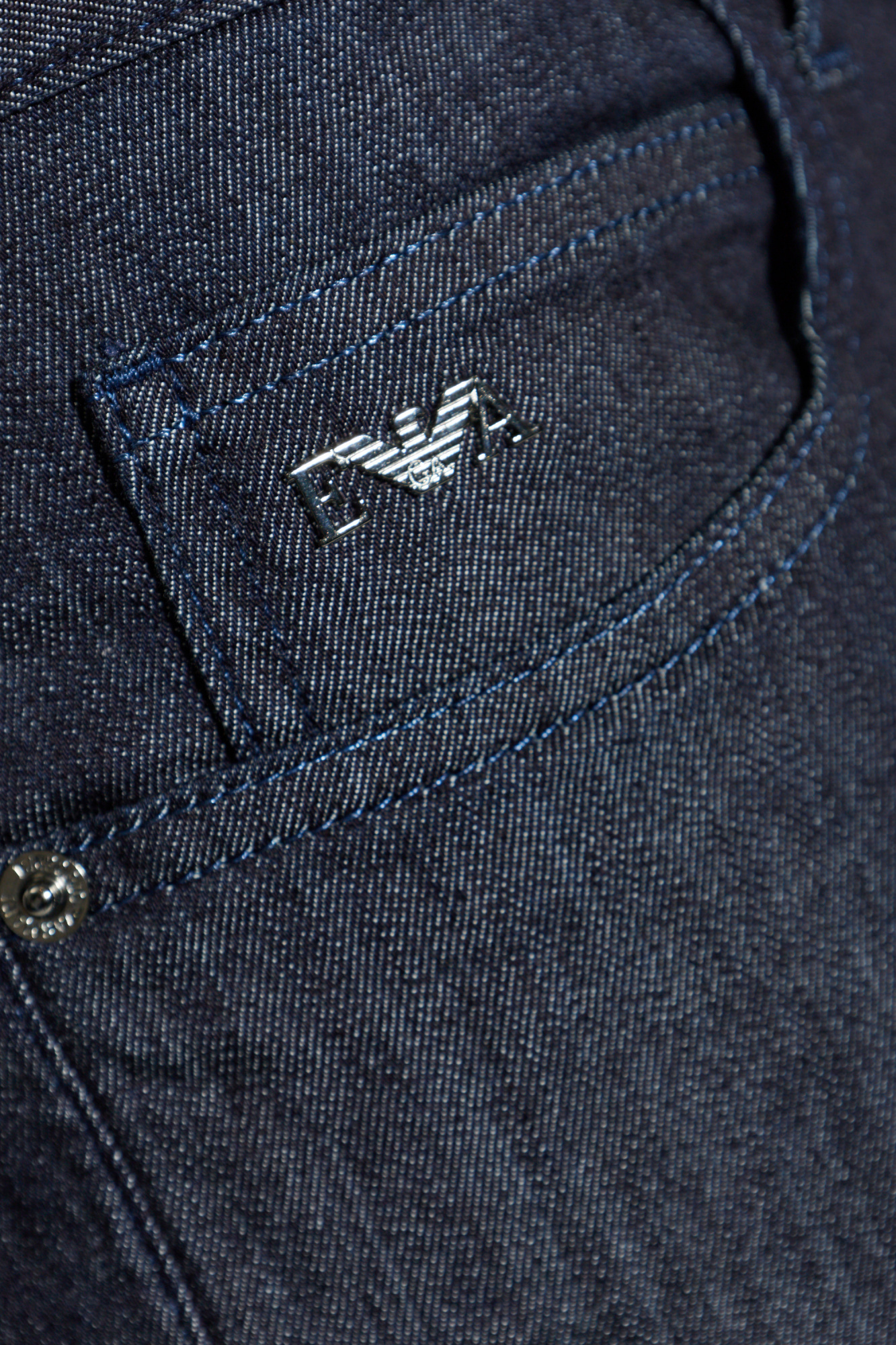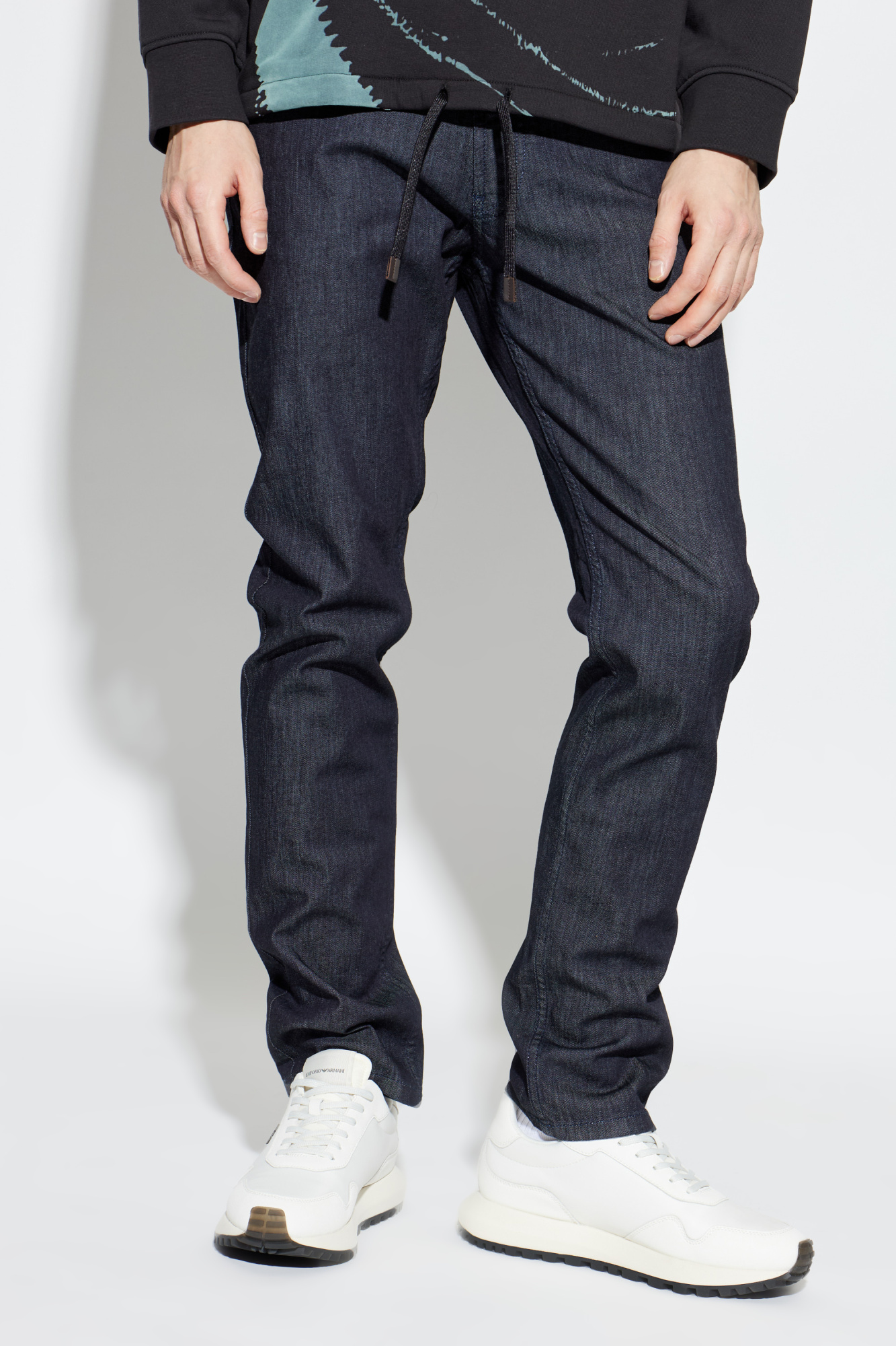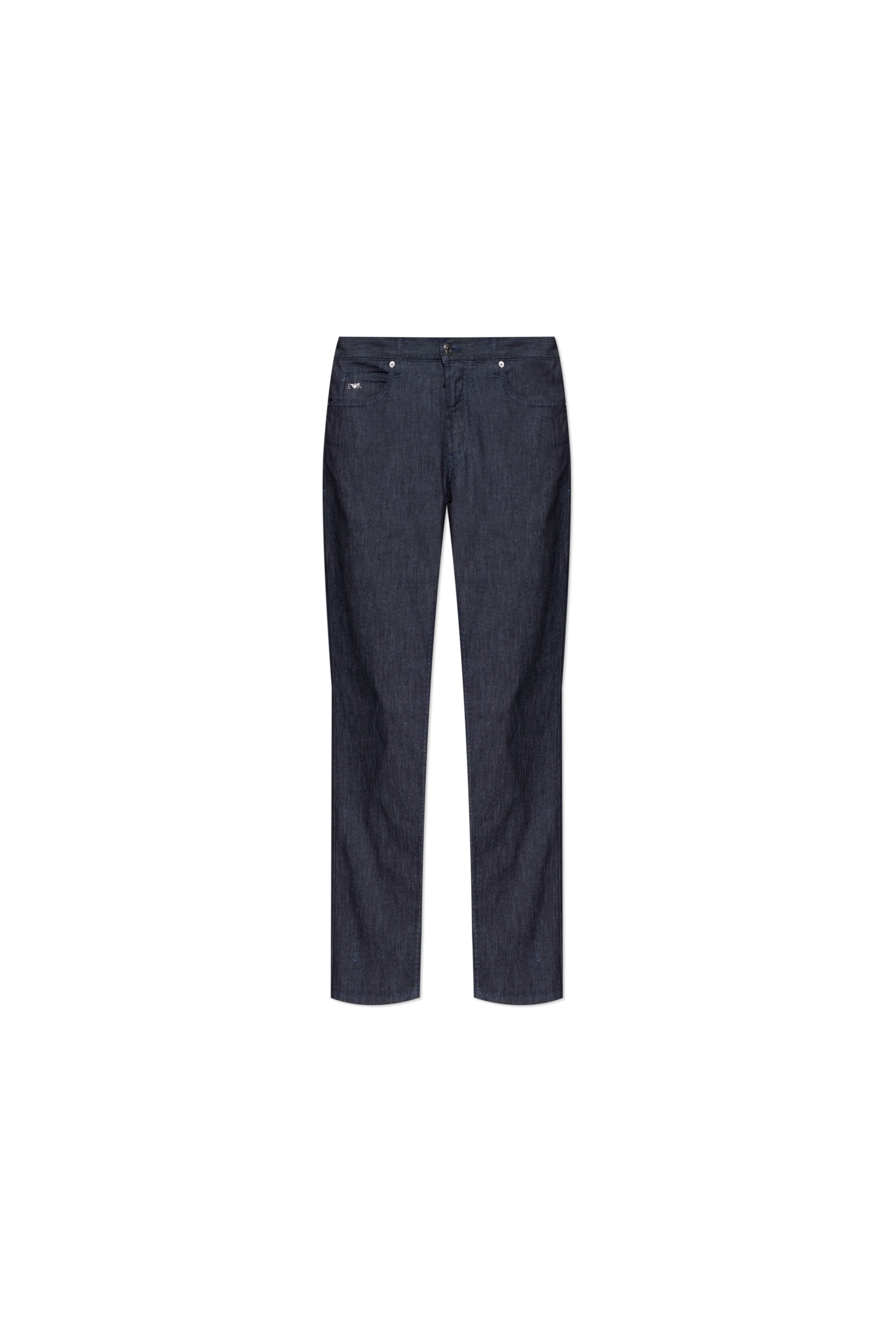 Базовые джинсы слегка зауженного силуэта с застежкой на молнию и пуговицу дополнены шлевками для ремня и фирменным металлическим логотипом бренда на монетном кармане.