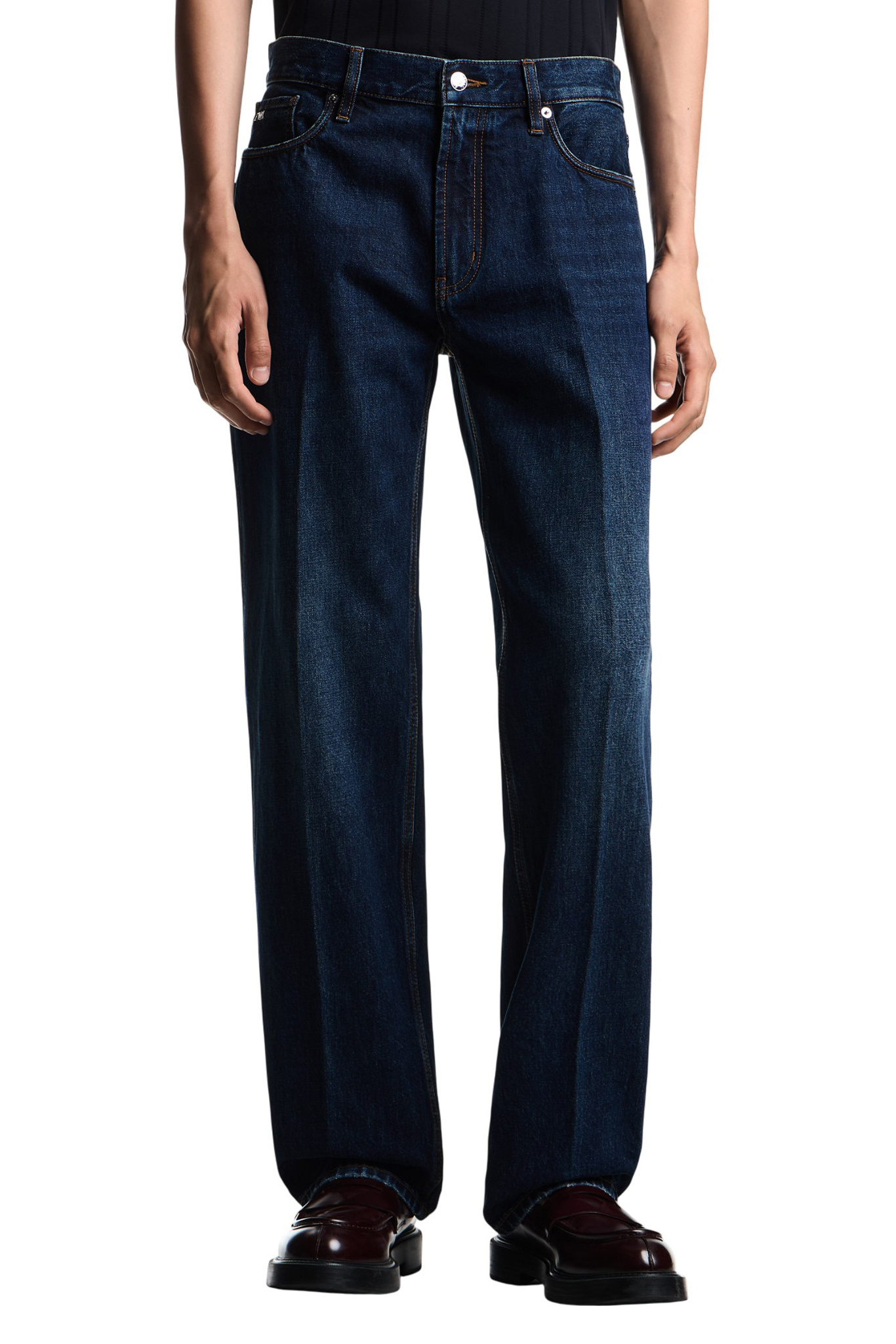 Джинсы расслабленного силуэта с застежкой на молнию и пуговицу дополнены шлевками для ремня, фирменным металлическим логотипом бренда на монетном кармане и кожаным патчем на поясе.
