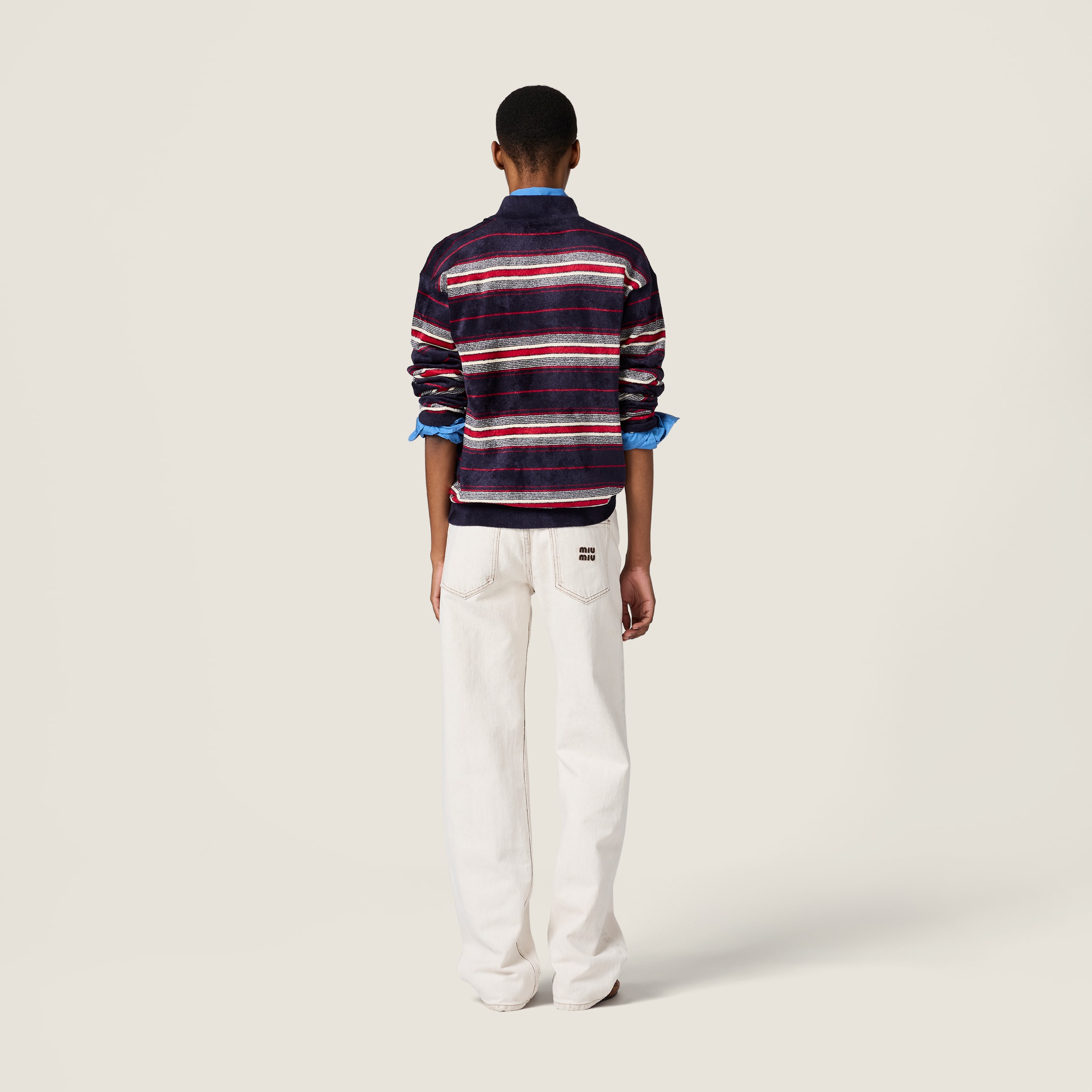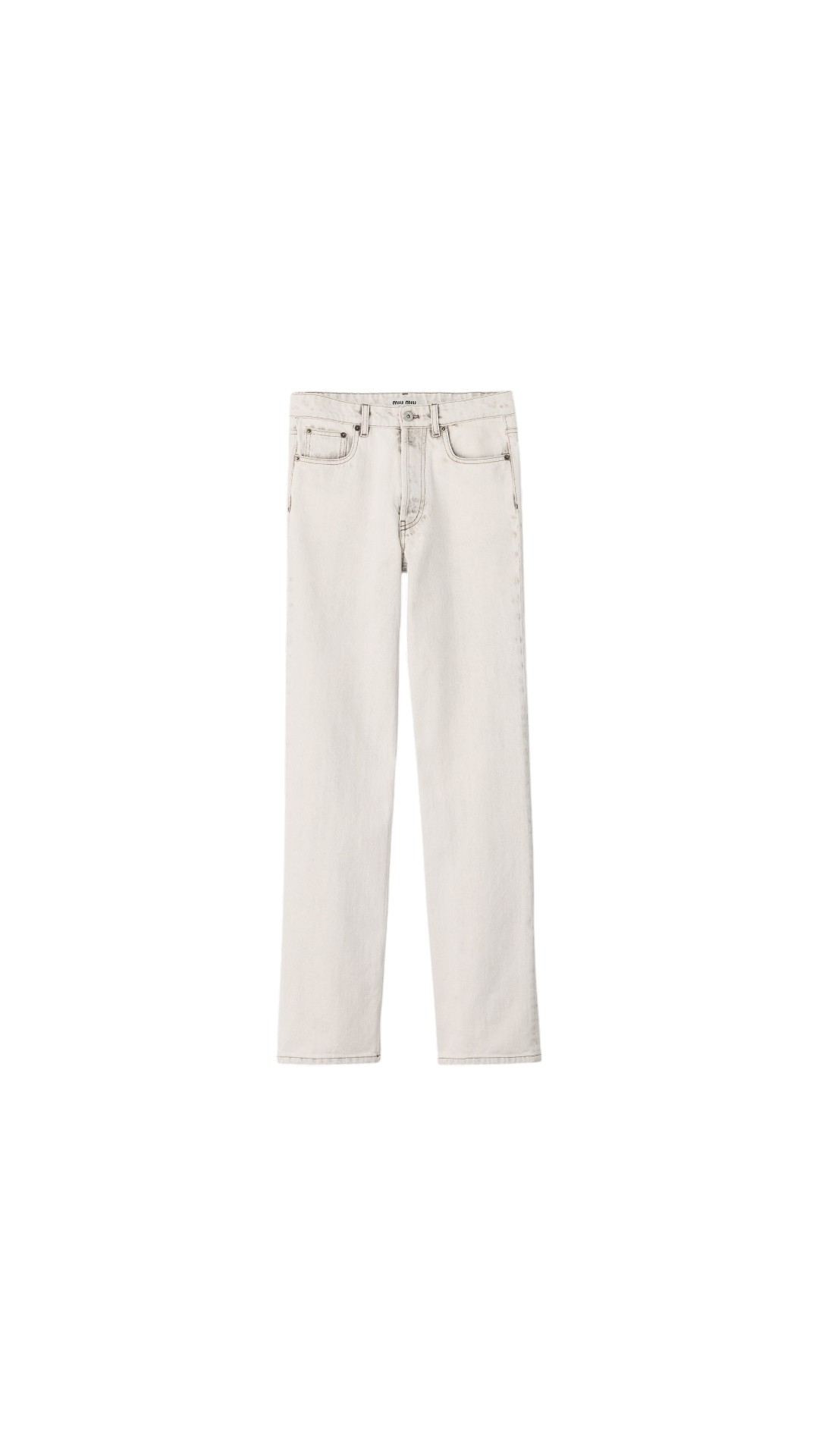 Джинсы слегка расслабленного силуэта с застежкой на молнию и пуговицу дополнены контрастной строчкой, пятью карманами и украшены на заднем кармане логотипом бренда.