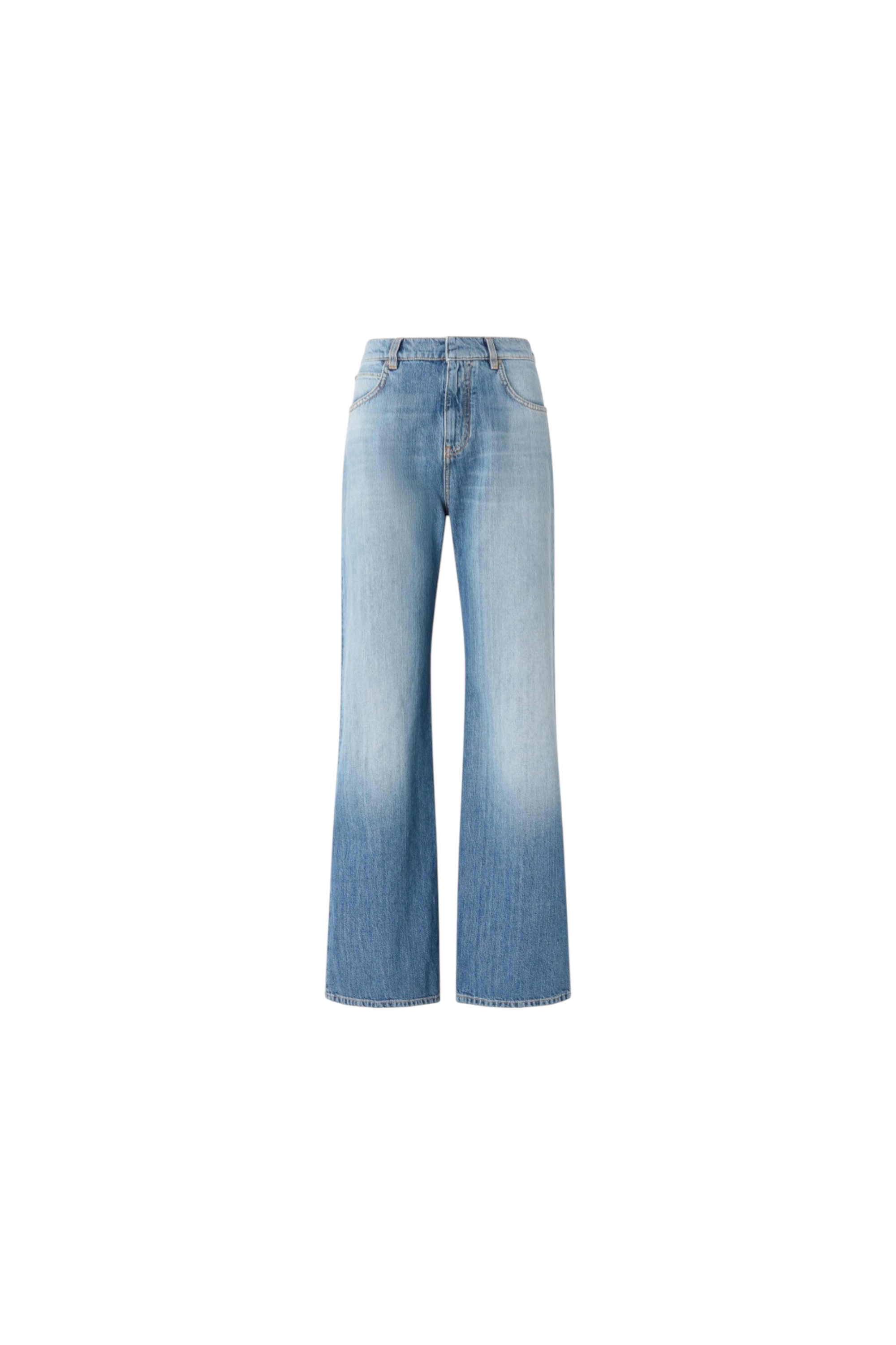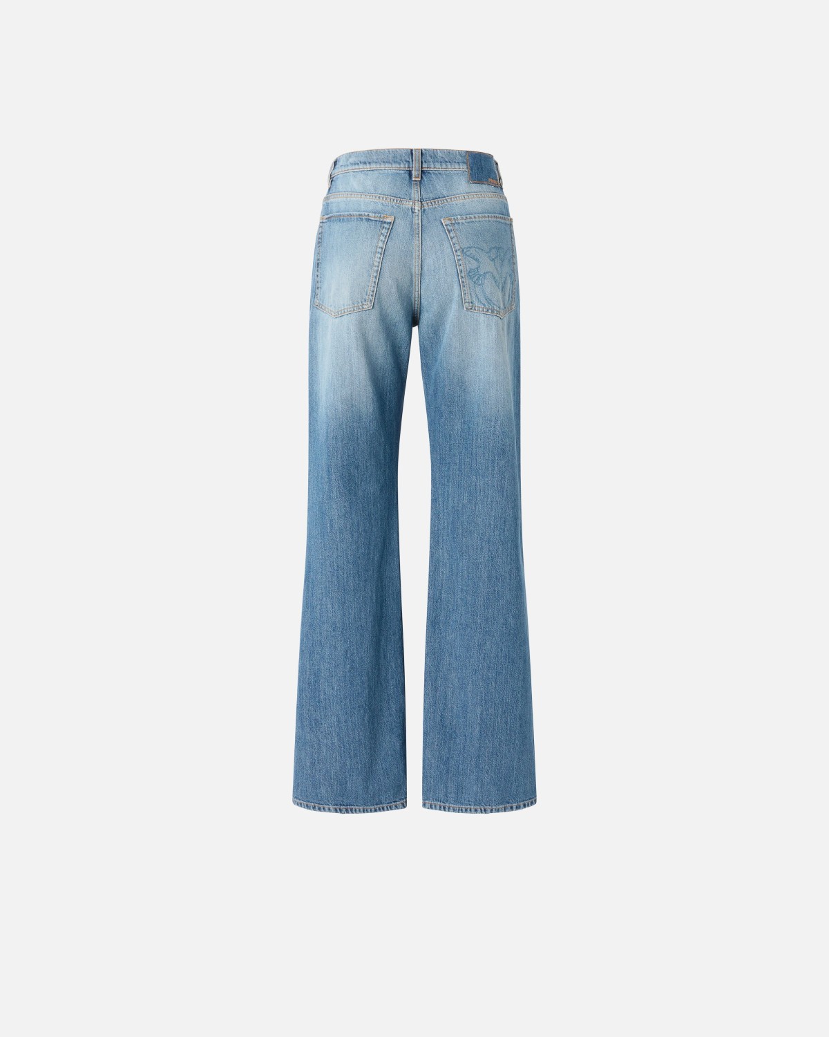 Джинсы свободного силуэта на низкой талии украшены на заднем кармане фирменным вышитым логотипом бренда.