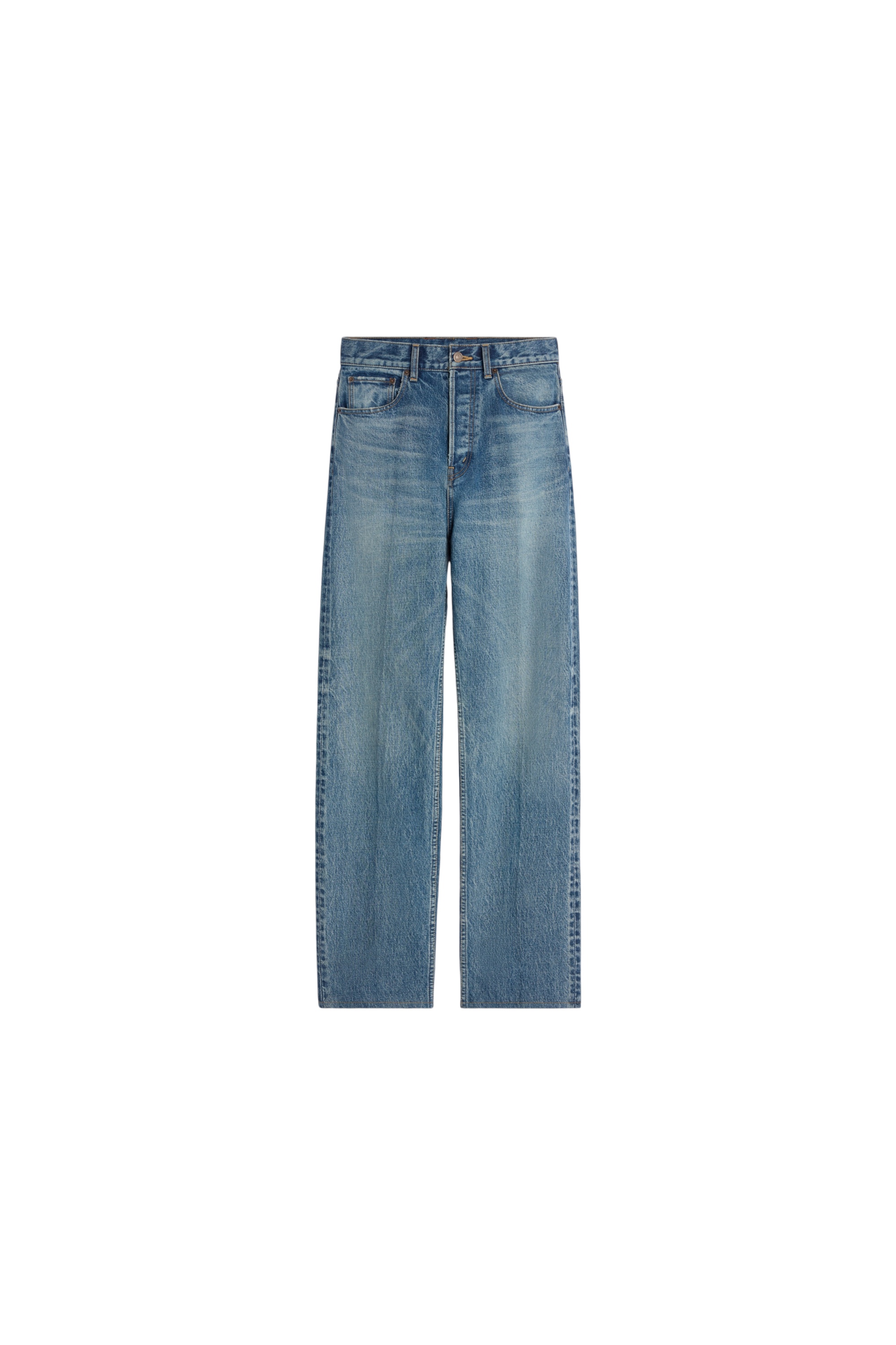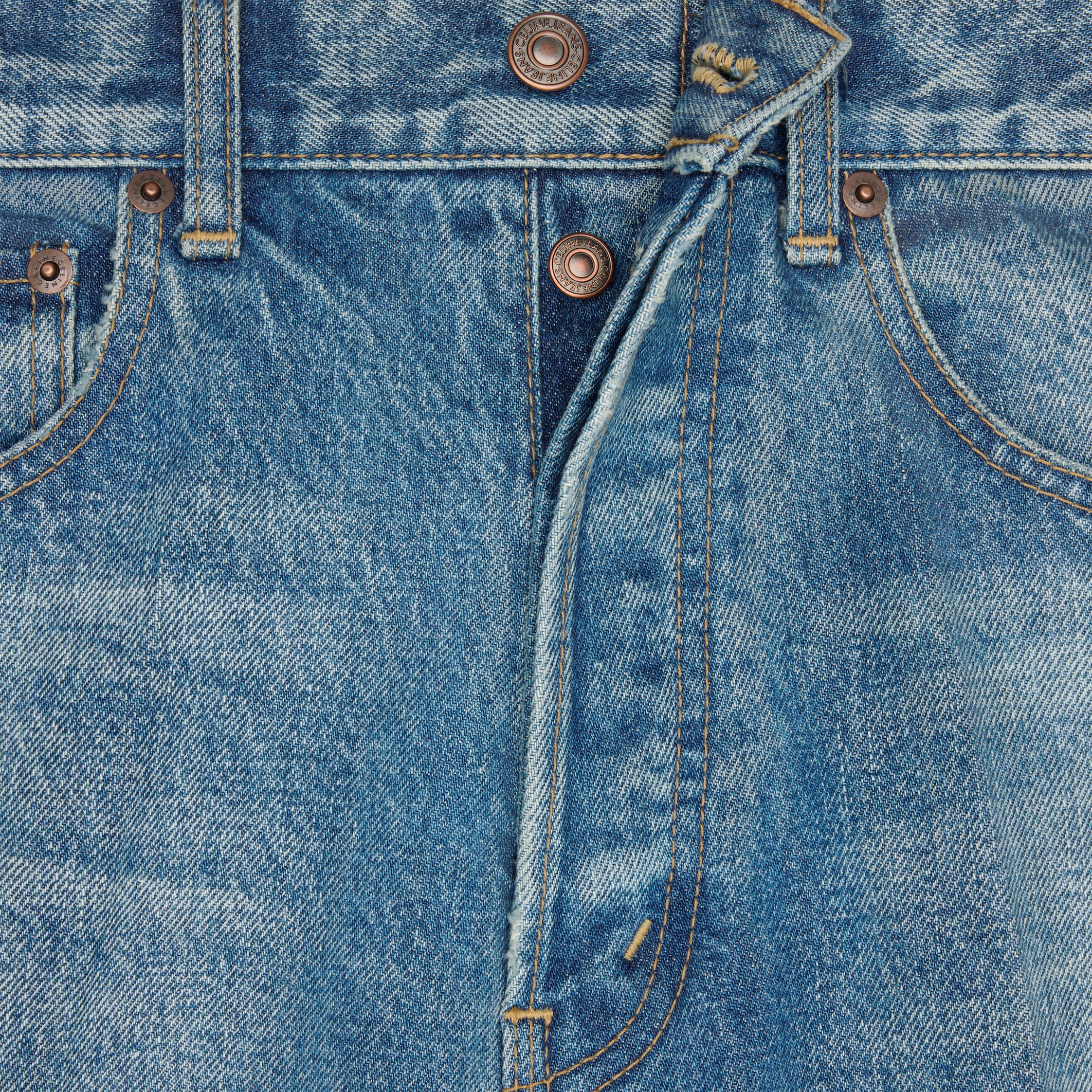 Лаконичные джинсы с пятью карманами и застежкой на пуговицы дополнены шлевками для ремня и кожаным патчем с логотипом бренда на поясе.