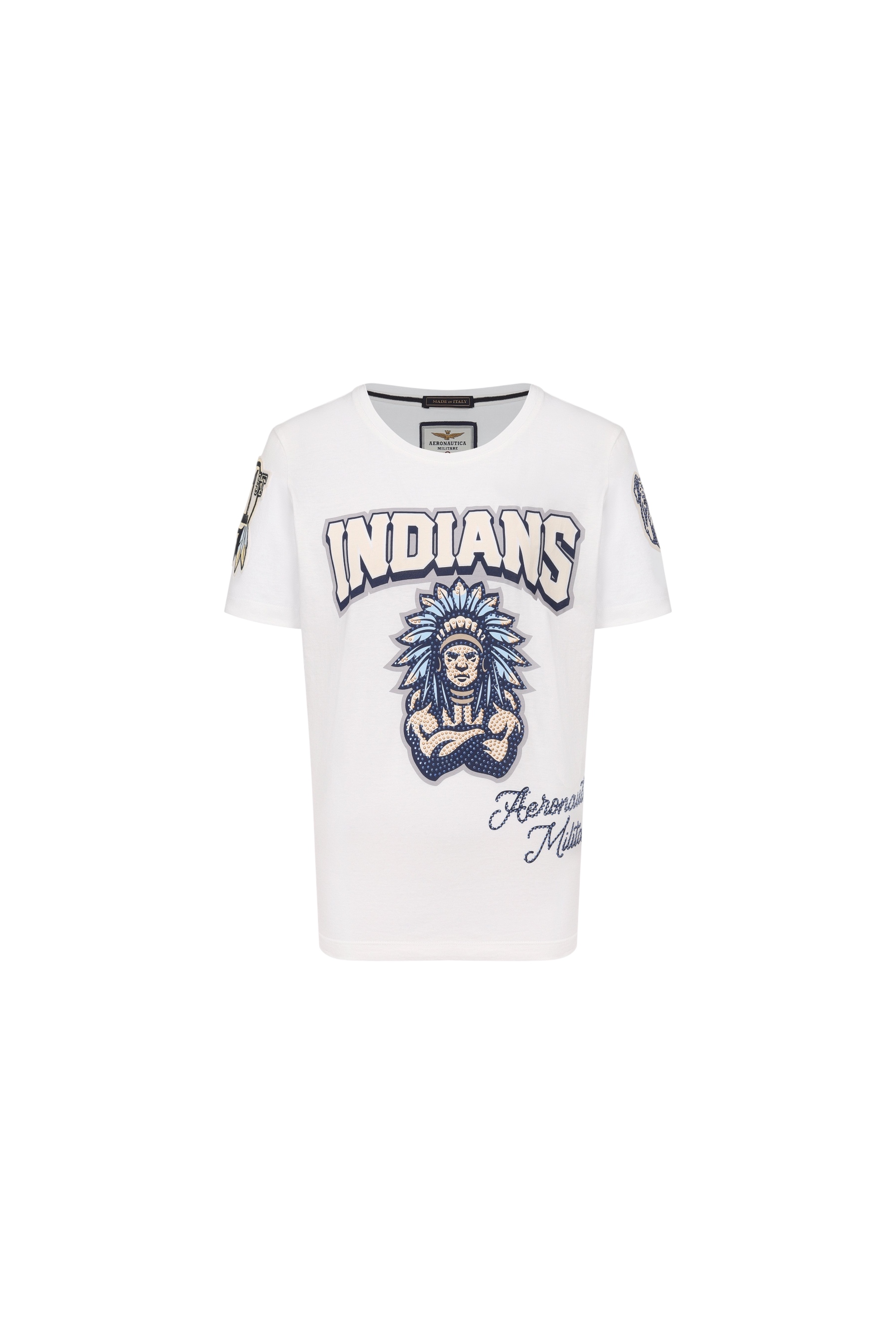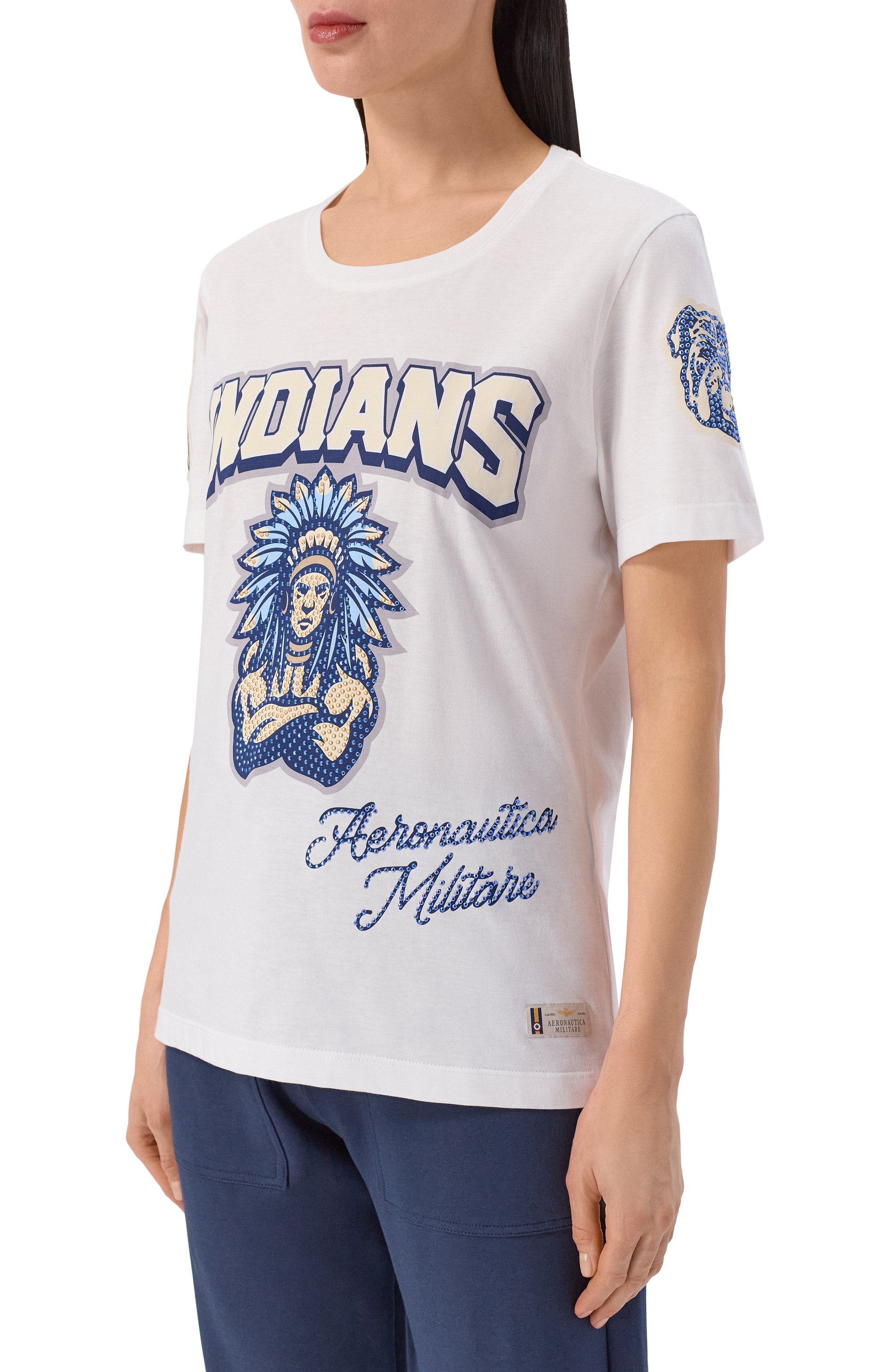 Футболка с круглой горловиной из хлопкового джерси: подчеркнутые стразами принты у модели посвящены 103-й эскадрилье Итальянских ВВС, пилотов которой окрестили «индейцами».