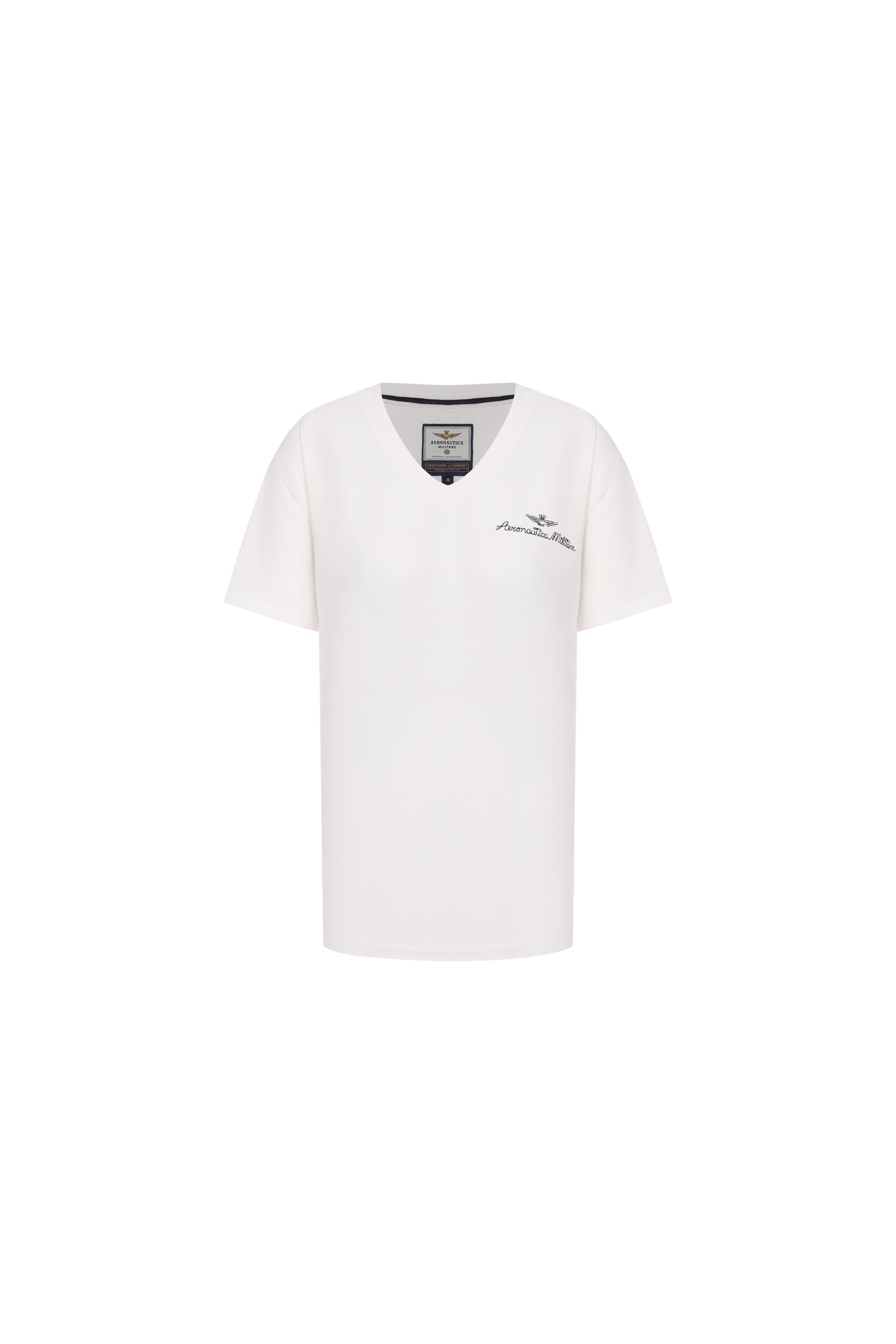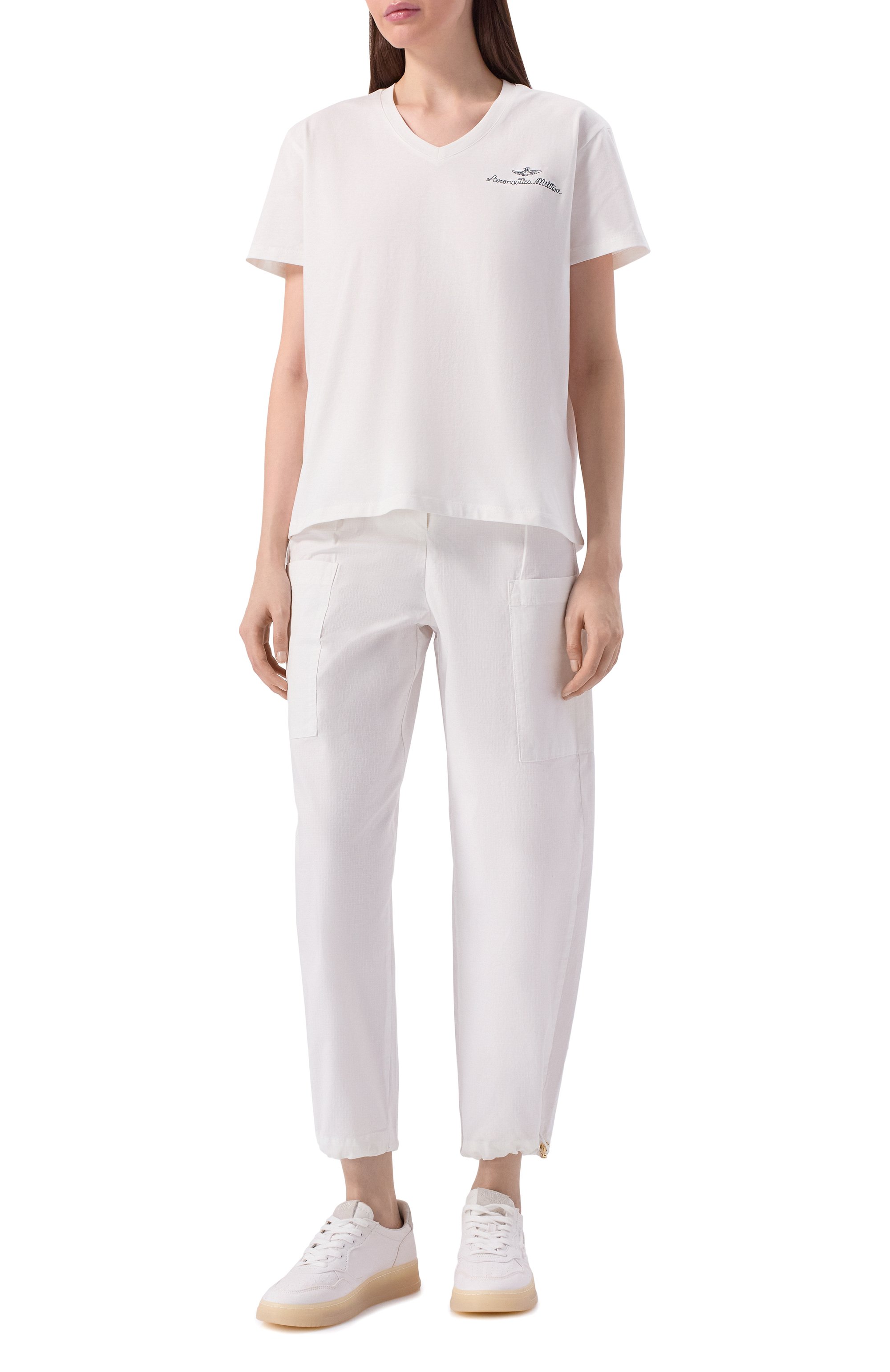 Футболка со спущенной линией плеч из стрейчевого хлопкового джерси с V-образным вырезом декорирована контрастной вышитой эмблемой и логотипом бренда.