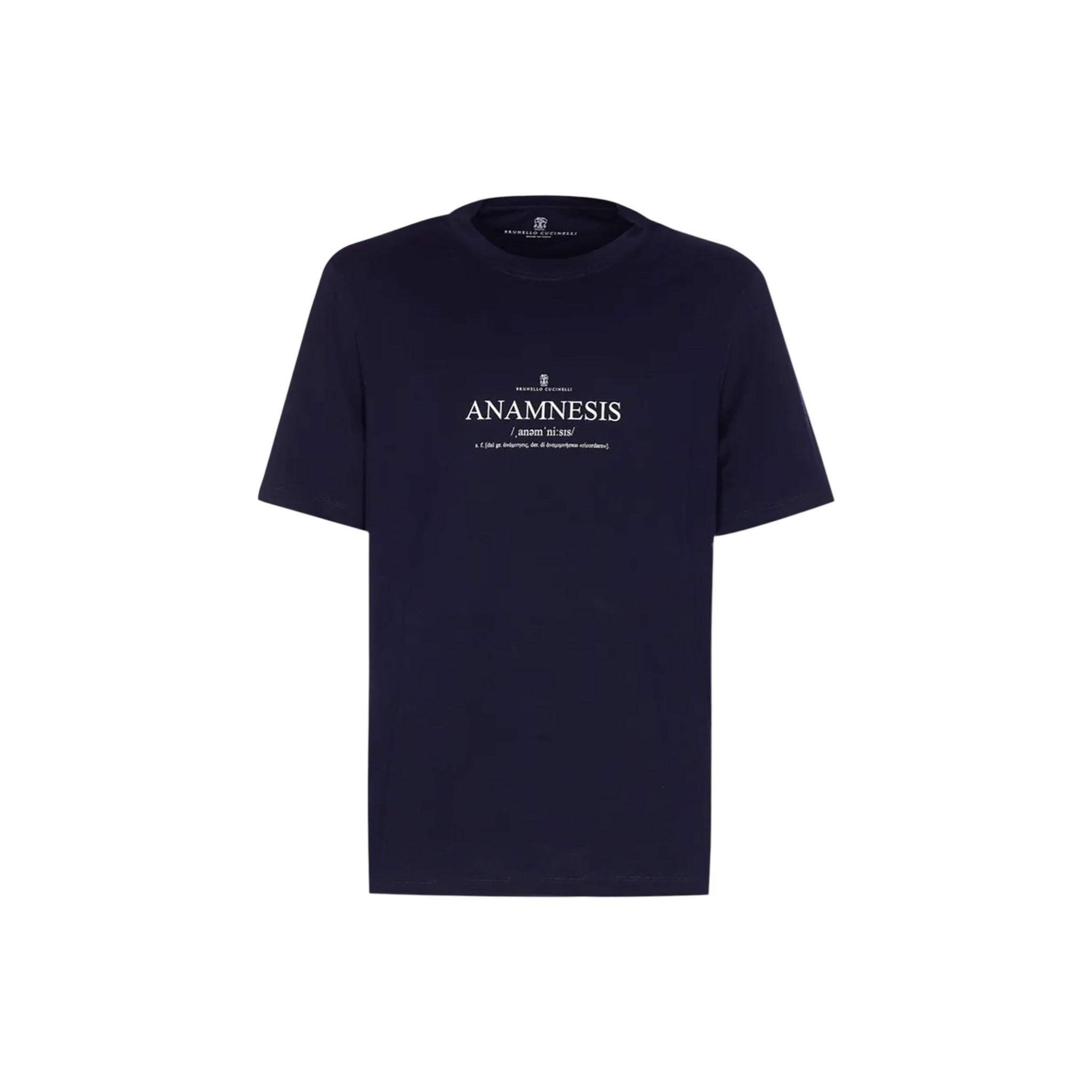Футболка, для пошива которой используется гладкое хлопковое джерси, характеризуется выверенным прямым кроем и наличием краёв коротких рукавов и низа с отглаженной кромкой. Отличительной деталью является крупный принт Anamnesis белого цвета, напоминающий о ценностях размышления и познания.