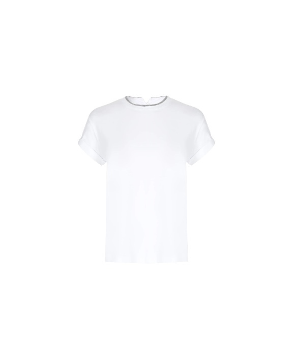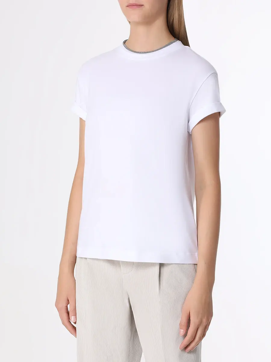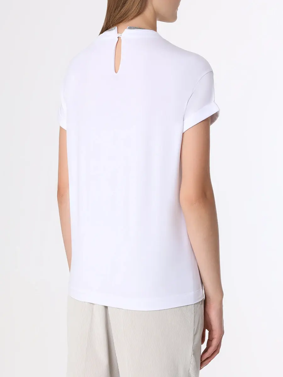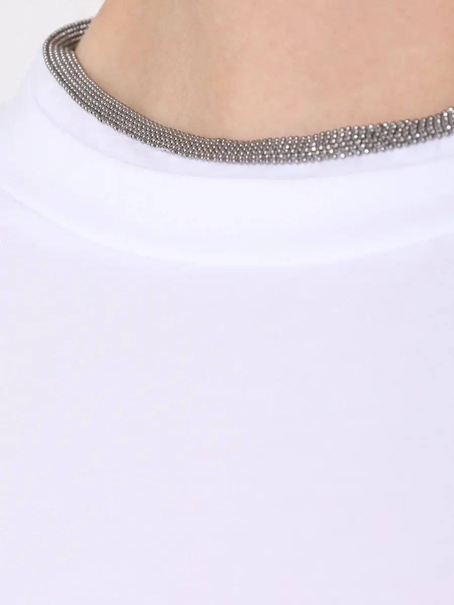 Футболка из хлопка полуприлегающего кроя с вырезом на спинке, спущенной линией плеч, короткими рукавами с отворотами и круглым вырезом горловины украшена отделкой цепочками Мониль.
