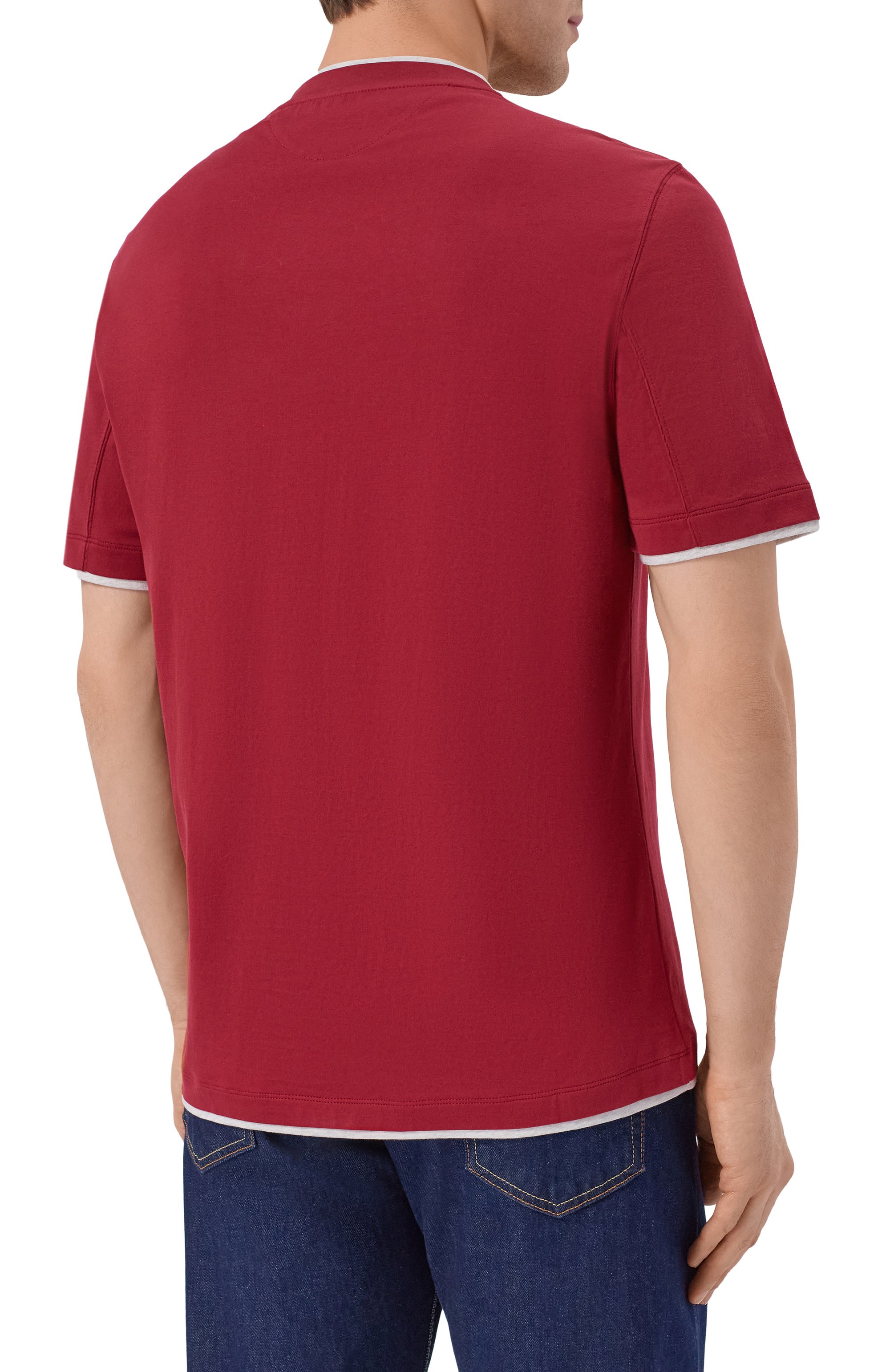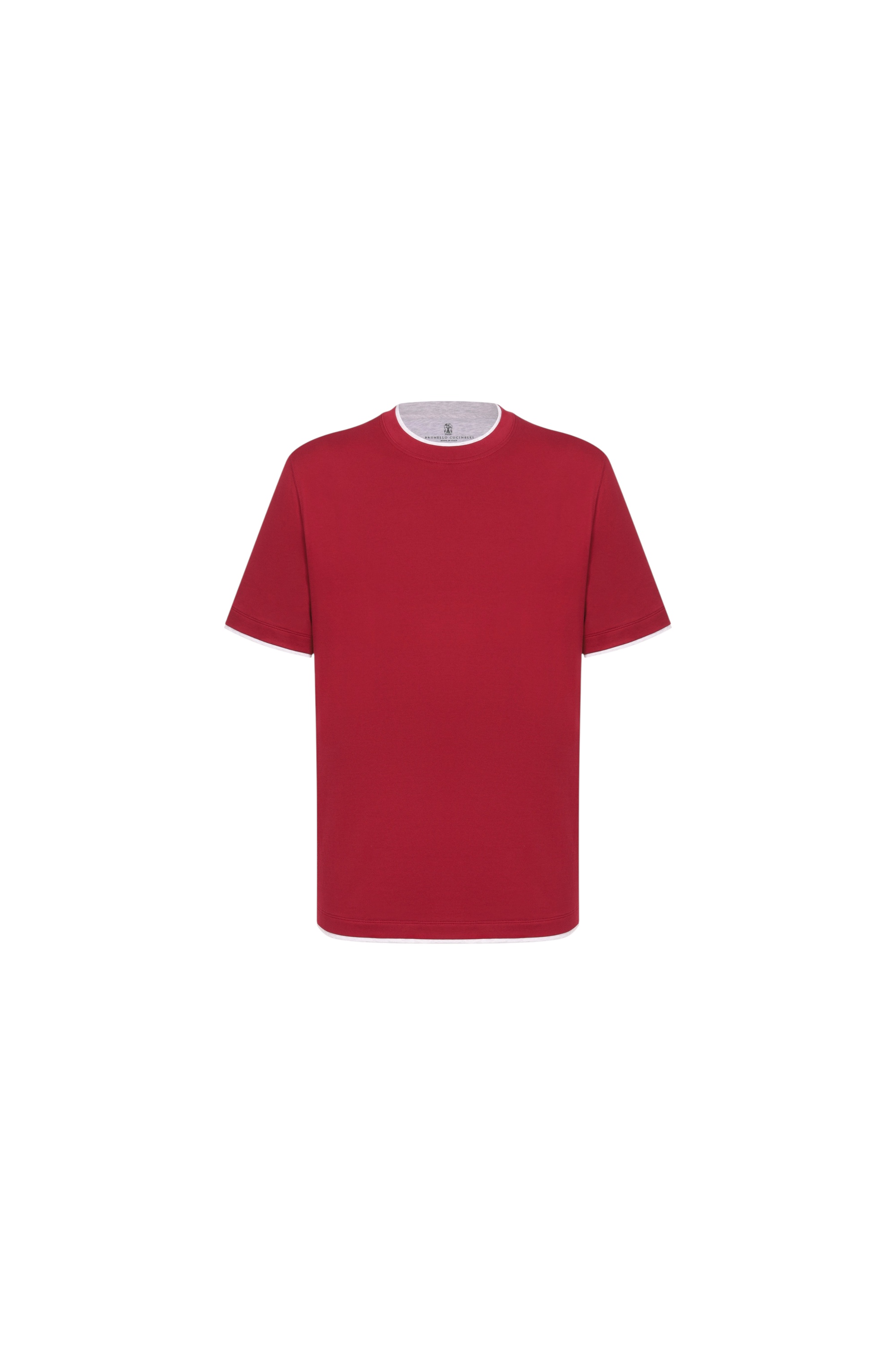 Футболка кроя Basic fit из хлопкового джерси с круглой горловиной в рубчик дополнили узкой контрастной отделкой по краям, создав иллюзию многослойности.