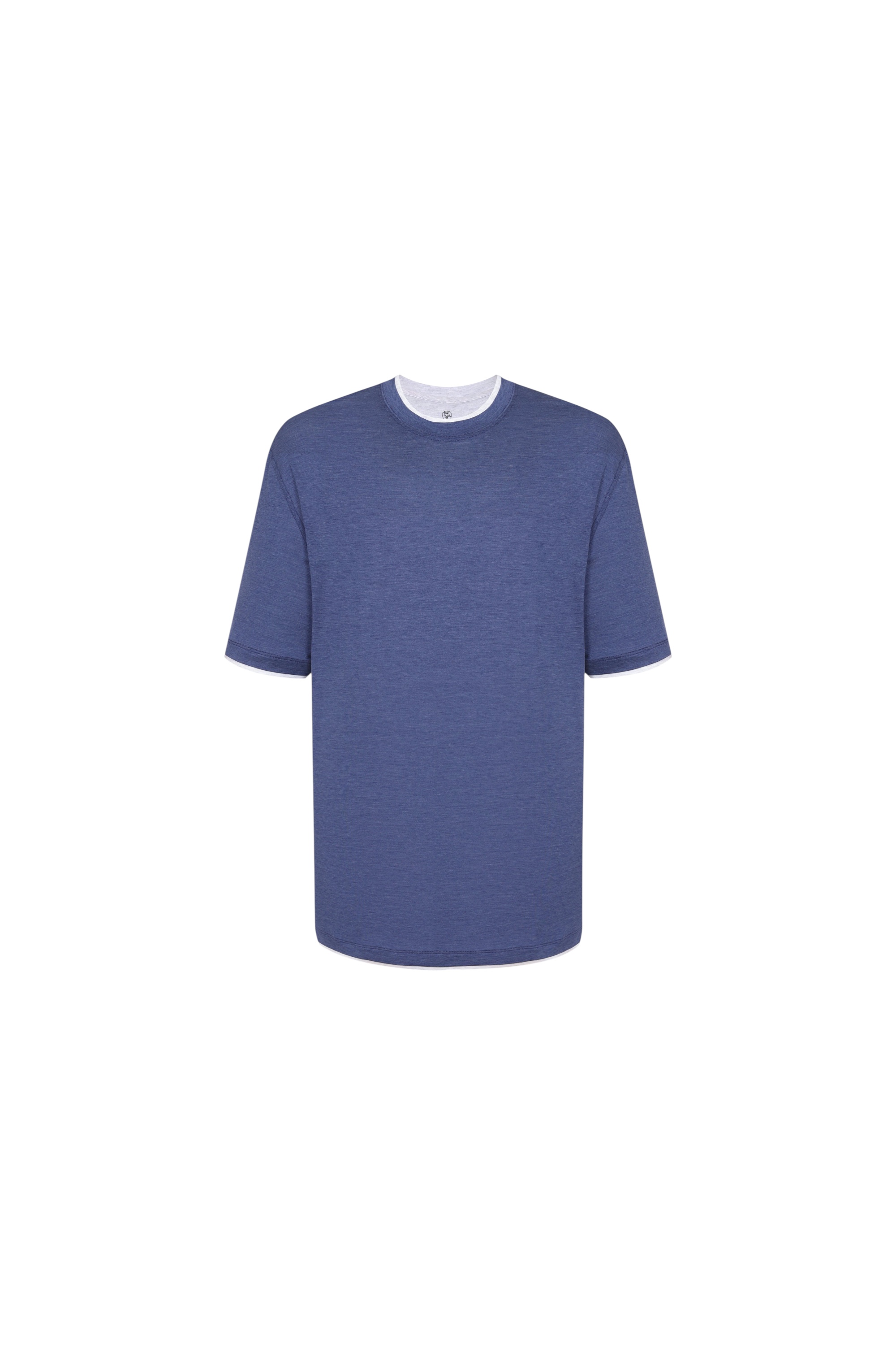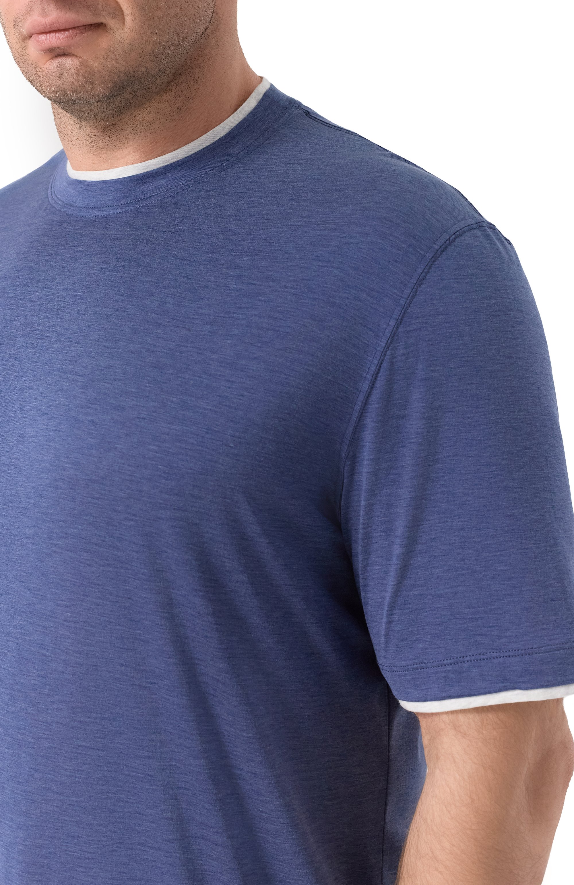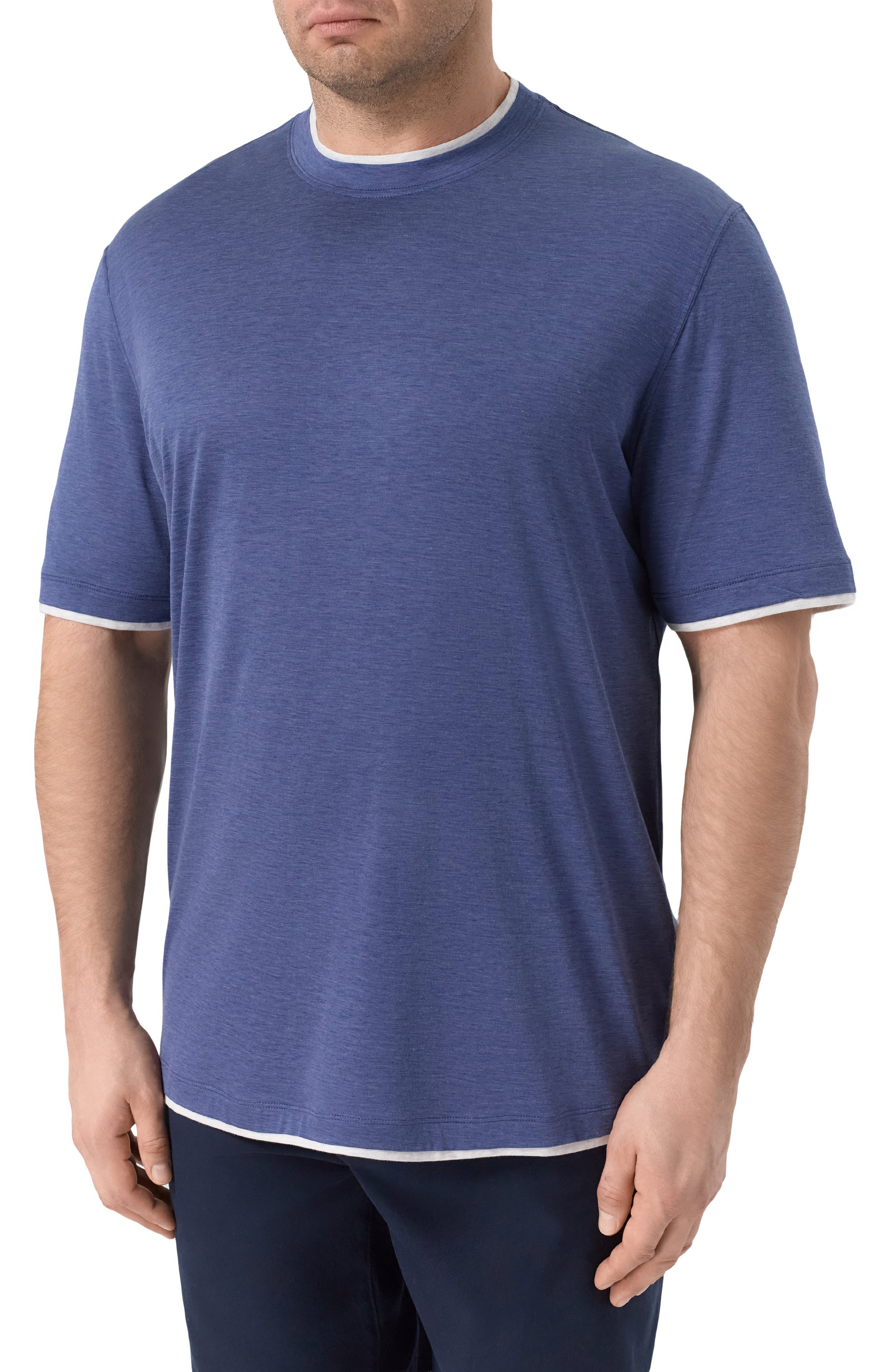 Футболка со слегка спущенной линией плеч из шелкового джерси с добавлением хлопка. Модель дополнили контрастными вставками на круглой горловине, манжетах и поясе.