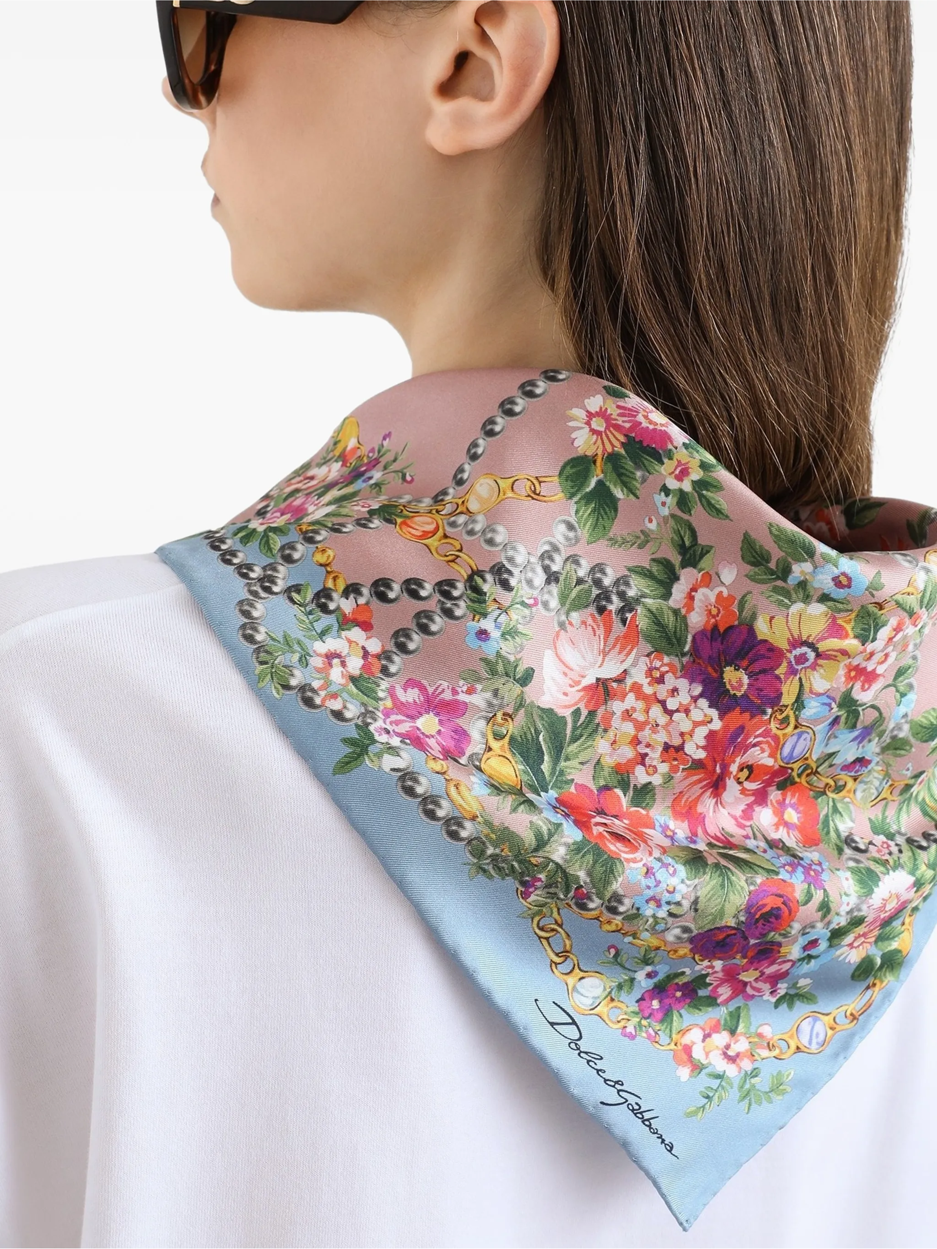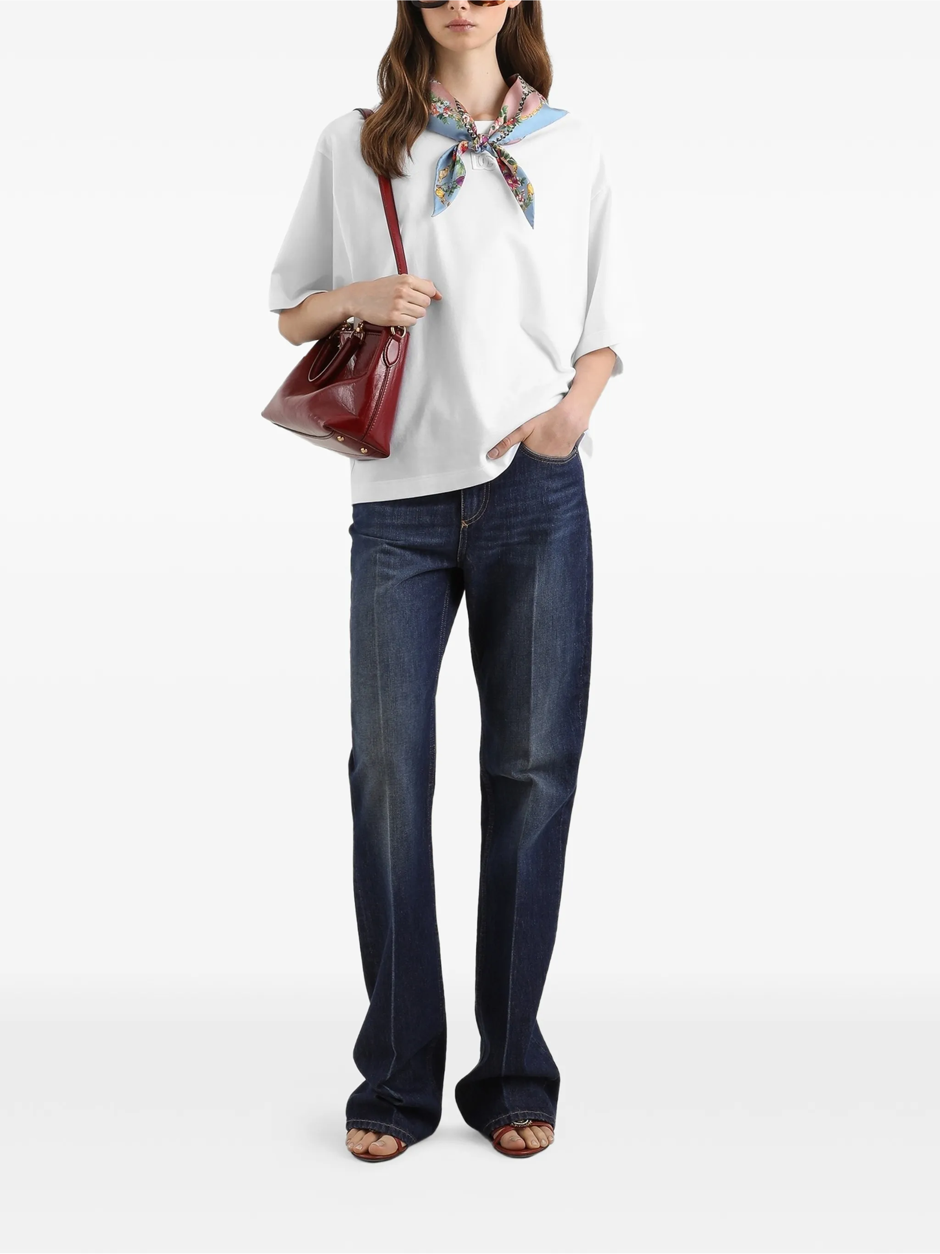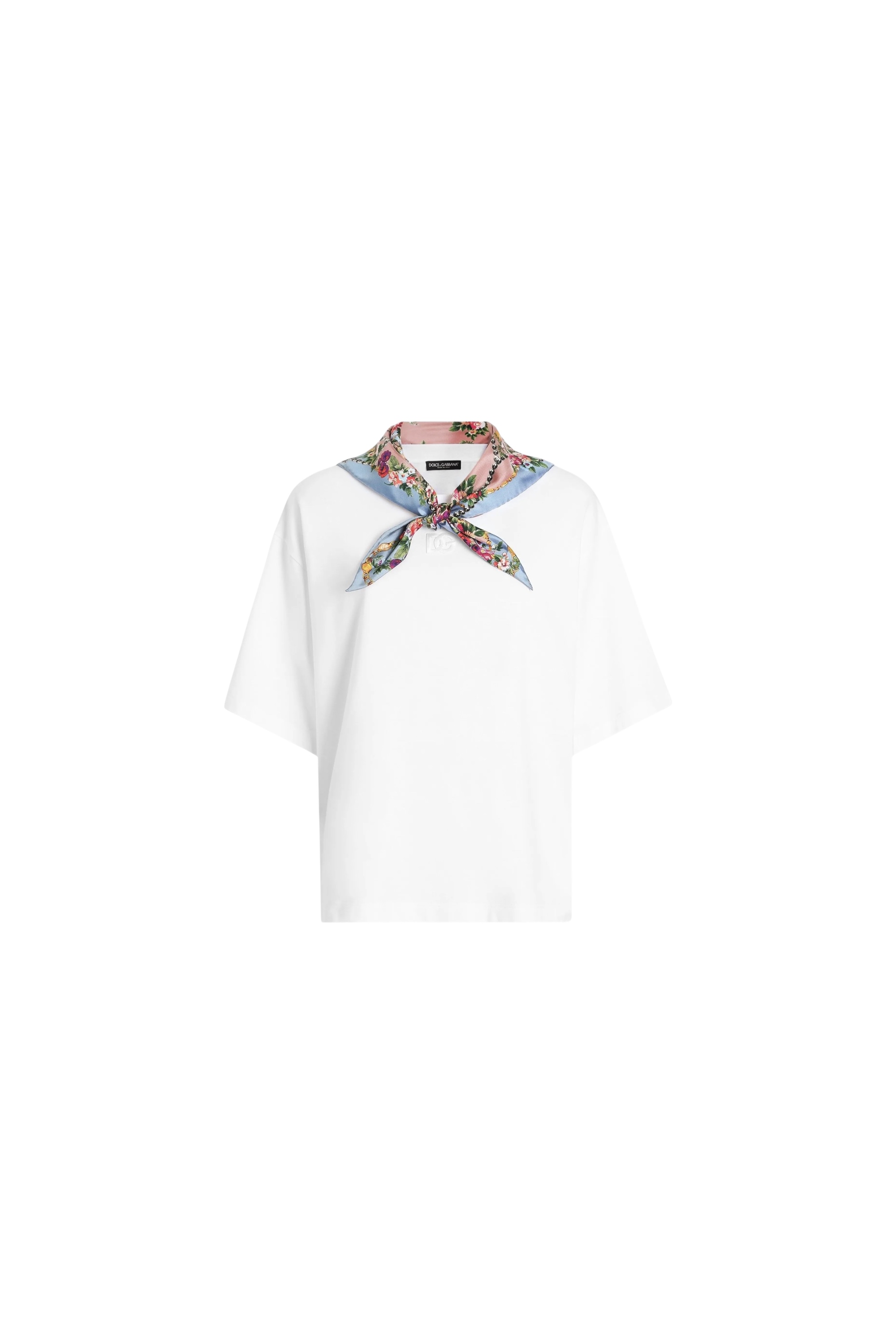 Футболка с традиционным круглым вырезом горловины из мягкого хлопкового джерси стилизована под комплект с большим треугольным платком, который украшен цветочным мотивом и изображением цепочек. Изделие дополнили фирменной эмблемой бренда спереди в тон.