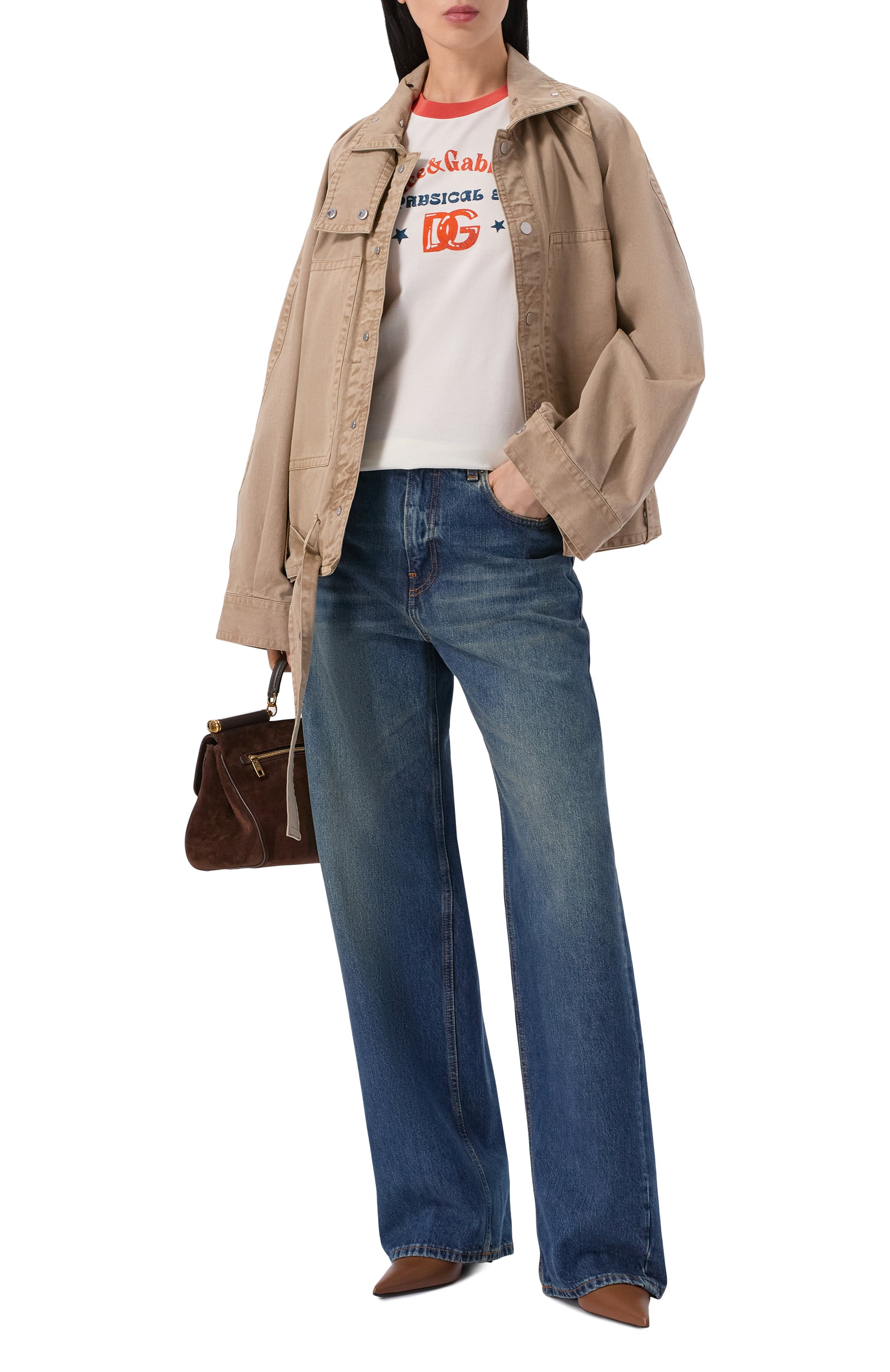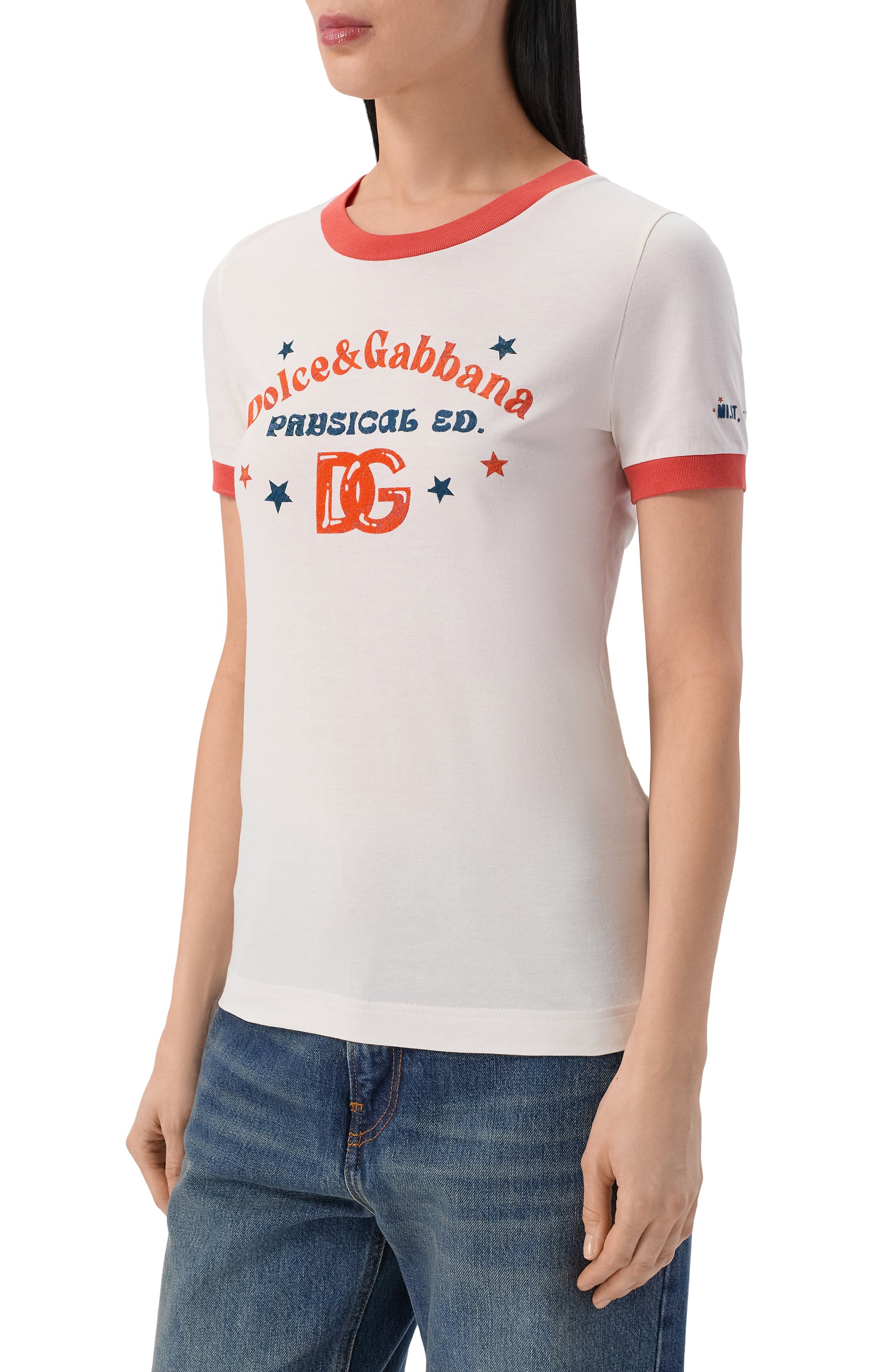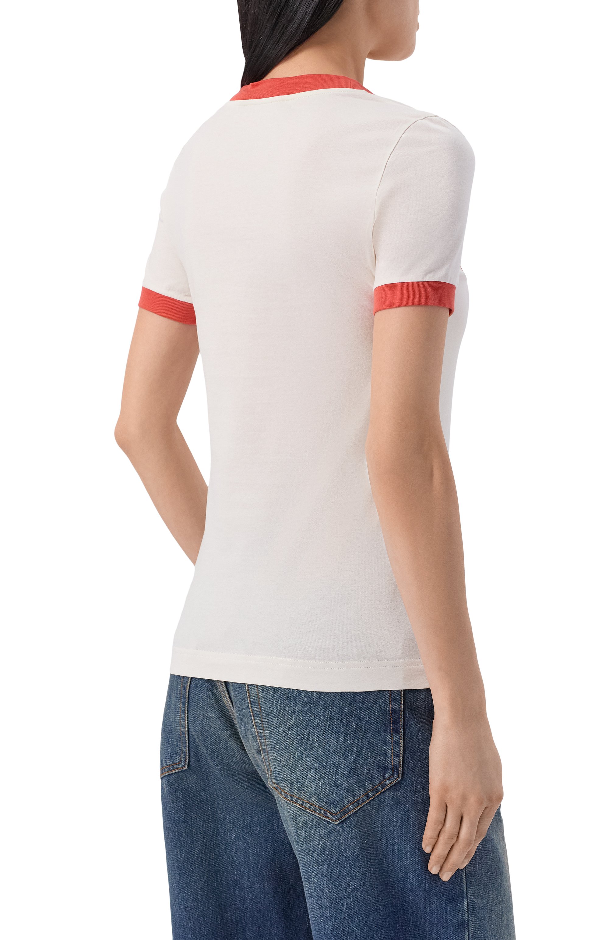 Футболка с контрастными горловиной и манжетами в рубчик выполнена из хлопкового джерси. Брендированному мотиву спереди вторит надпись на рукаве.