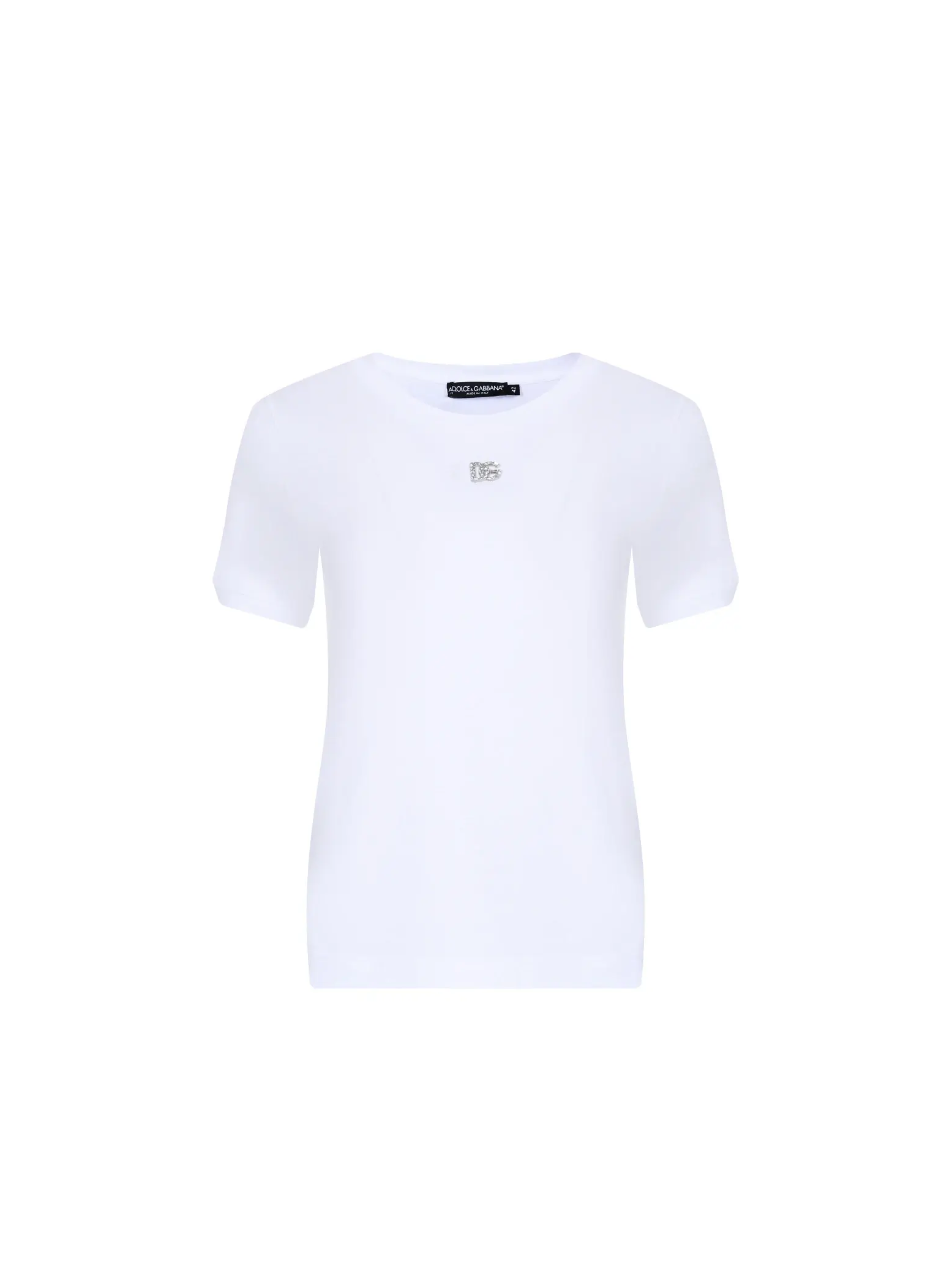 Футболка полуприлегающего кроя с короткими рукавами, узкими манжетами, круглым вырезом горловины и фирменной монограммой бренда на груди.