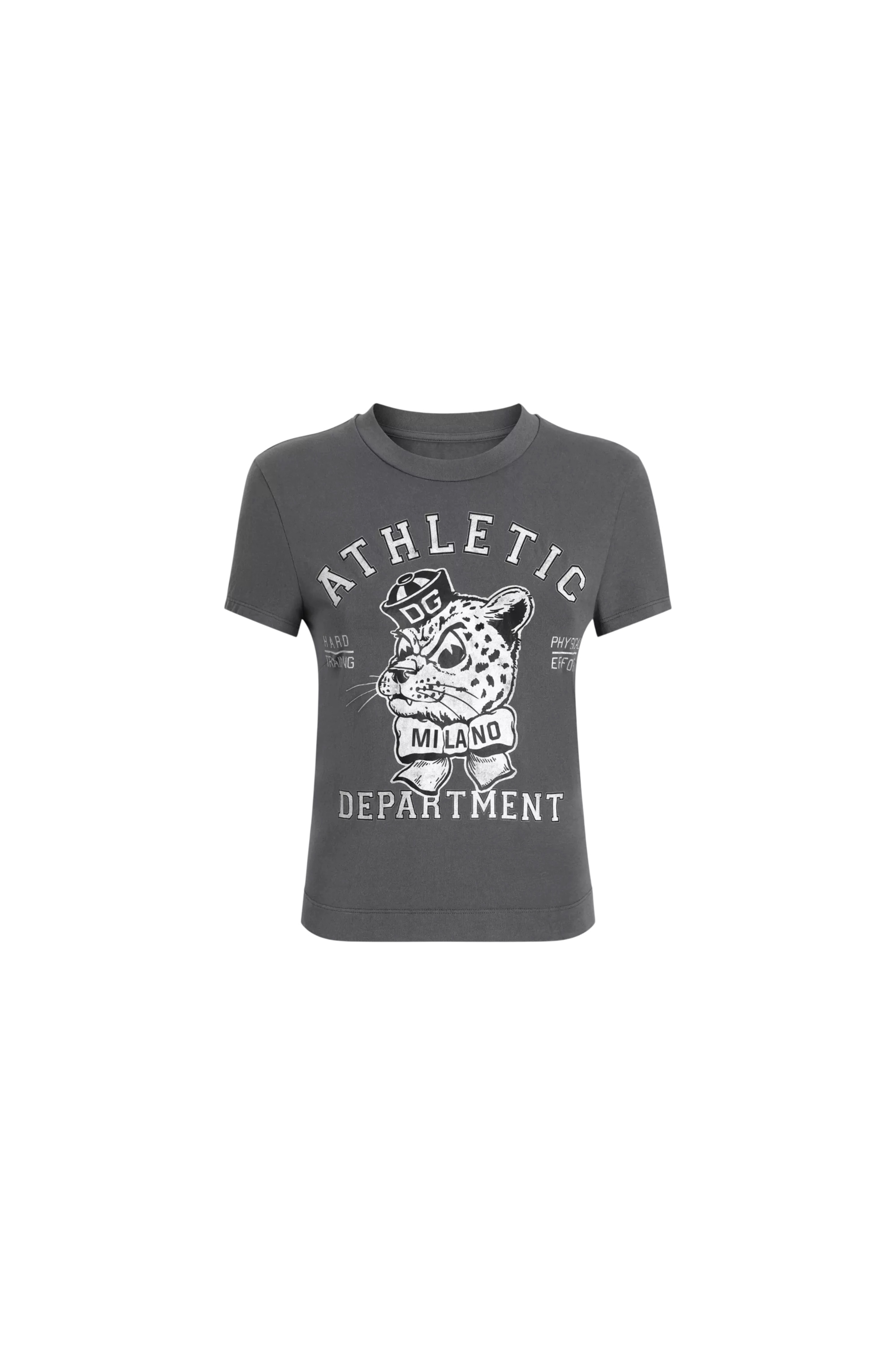Футболка с круглой горловиной из мягкого хлопка приталенного силуэта спереди украшена эффектным принтом.