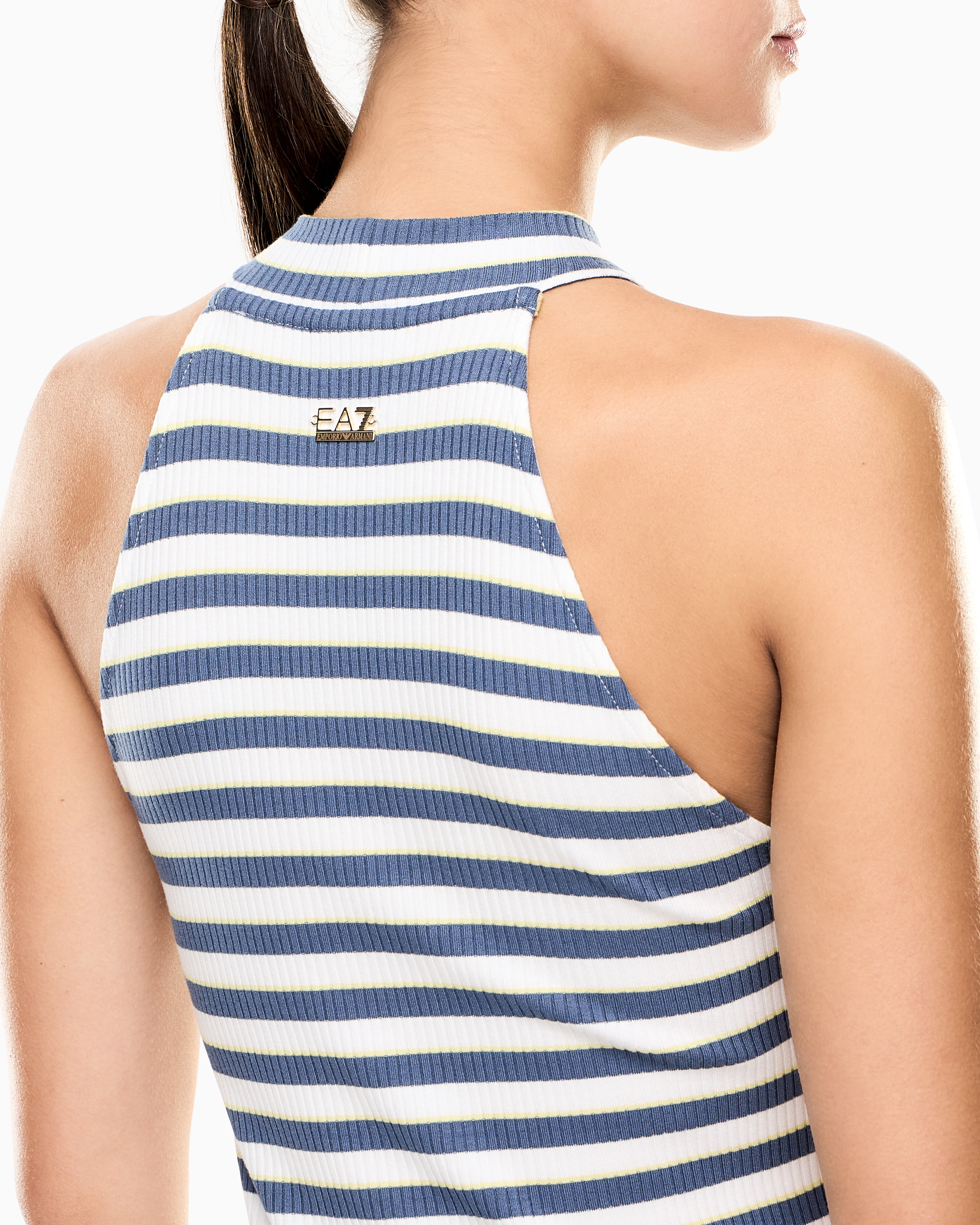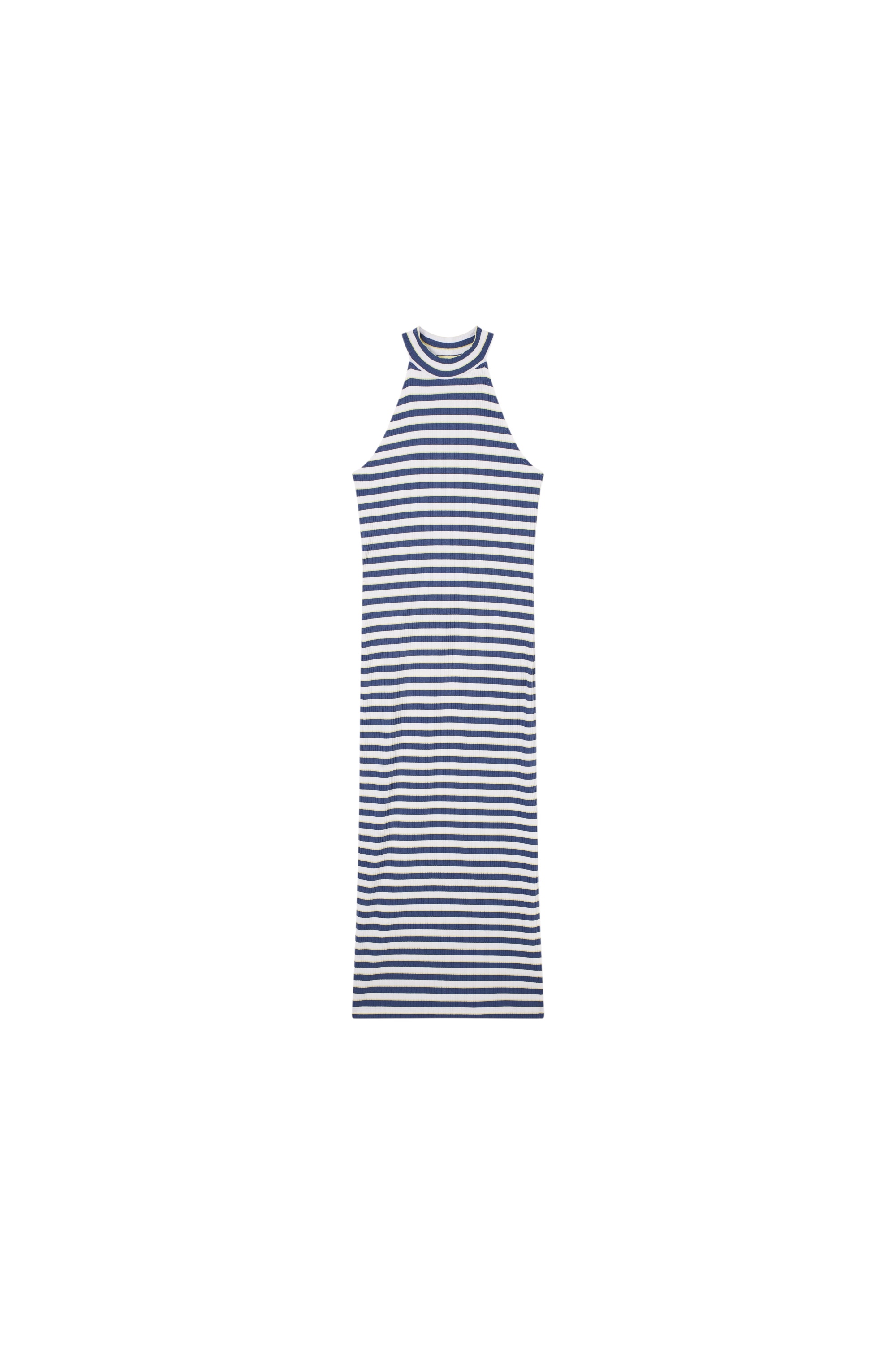 Платье приталенного силуэта длины миди с принтом в полоску и вырезом-халтер украшено сзади фирменным металлическим логотипом бренда.