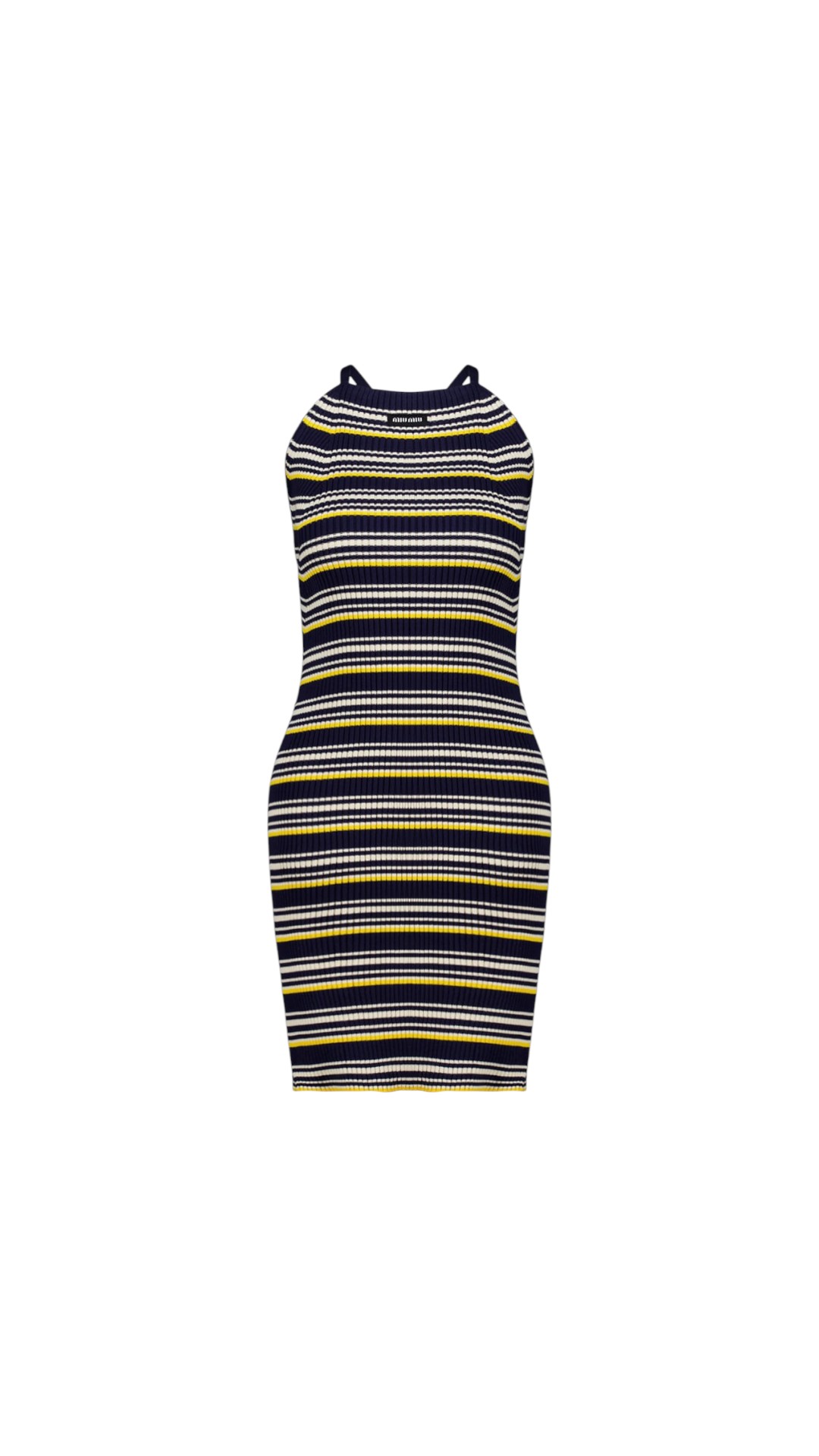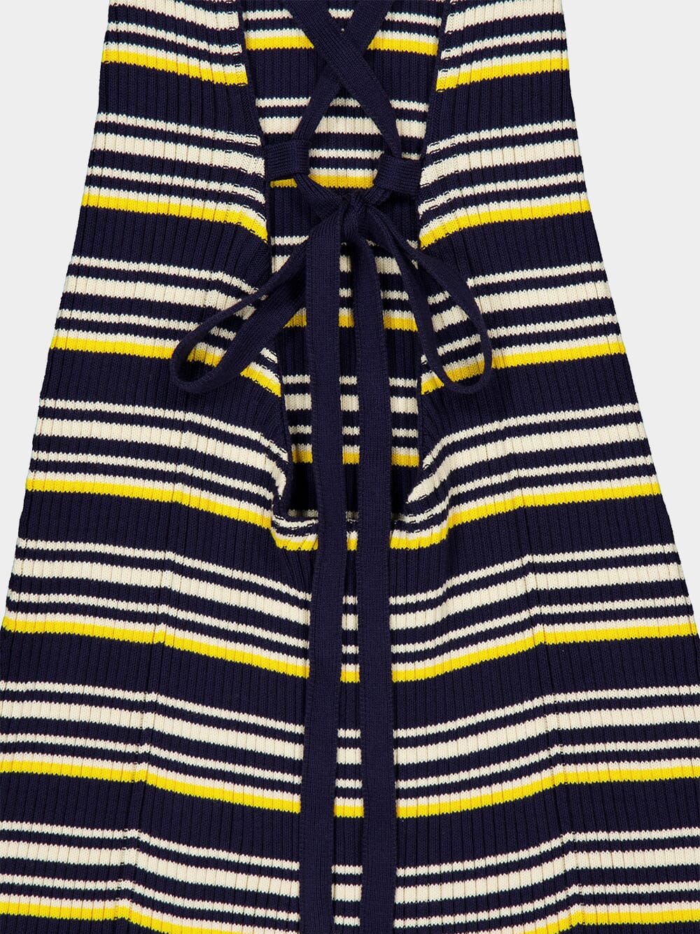Платье приталенного силуэта на бретелях с принтом в горизонтальную волоску дополнено эффектными завязками на спине и фирменным патчем с логотипом бренда спереди.