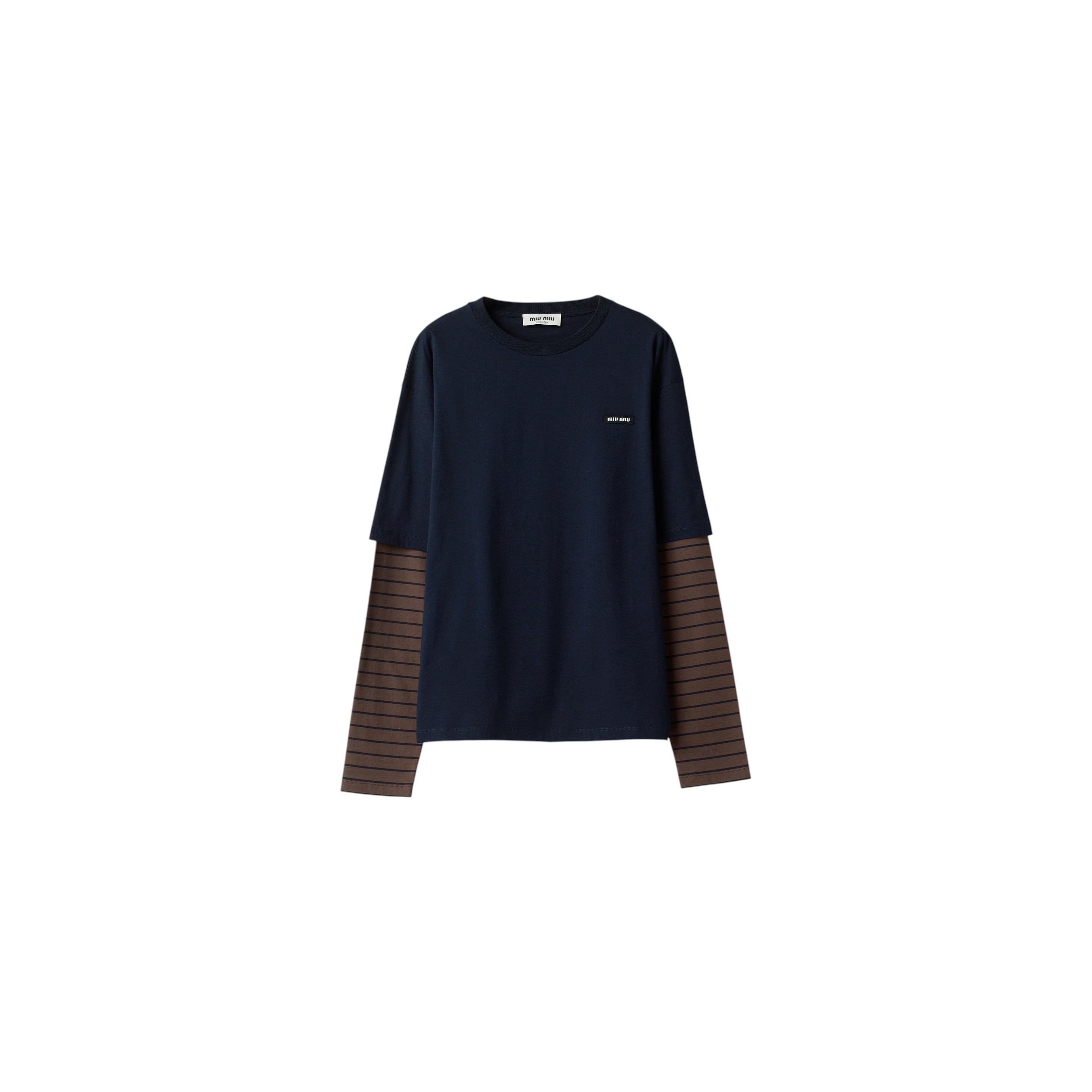 Футболка свободного силуэта с круглым вырезом дополнена с контрастными рукавами с принтом в полоску и украшена вышитым патчем с логотипом бренда спереди.