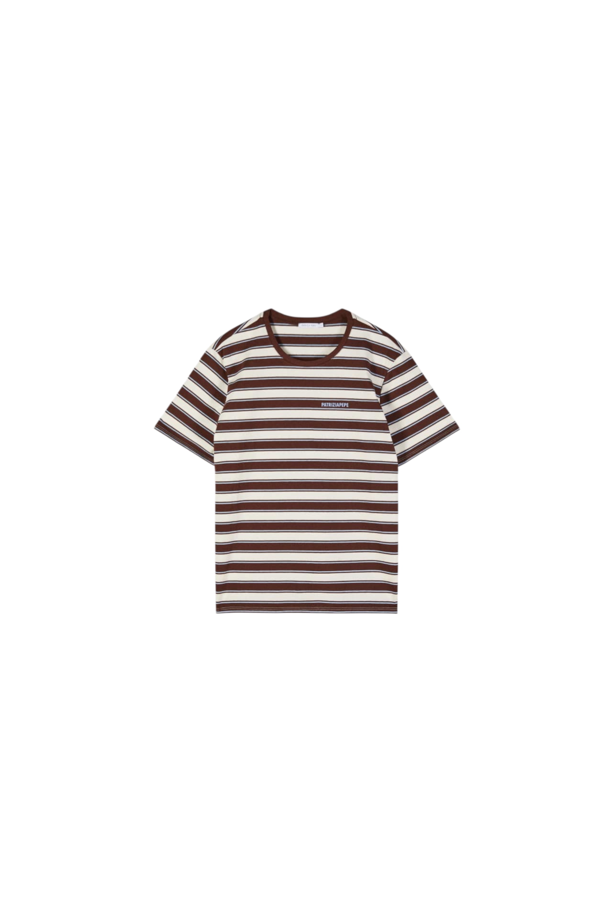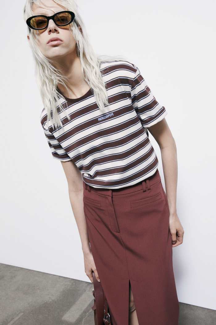 Футболка расслабленного силуэта с круглым вырезом и принтом в полоску дополнена спереди логотипом бренда. Такая модель будет прекрасно сочетаться как с юбками, так и с джинсами.