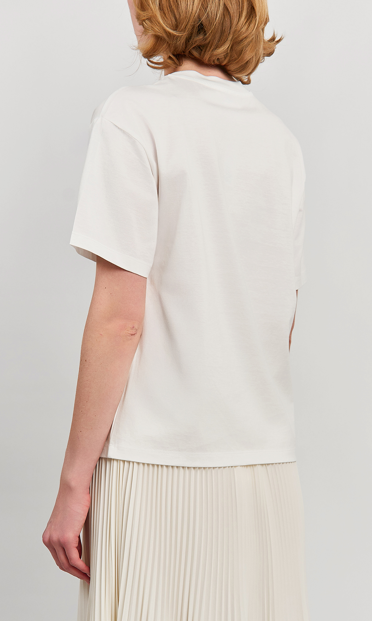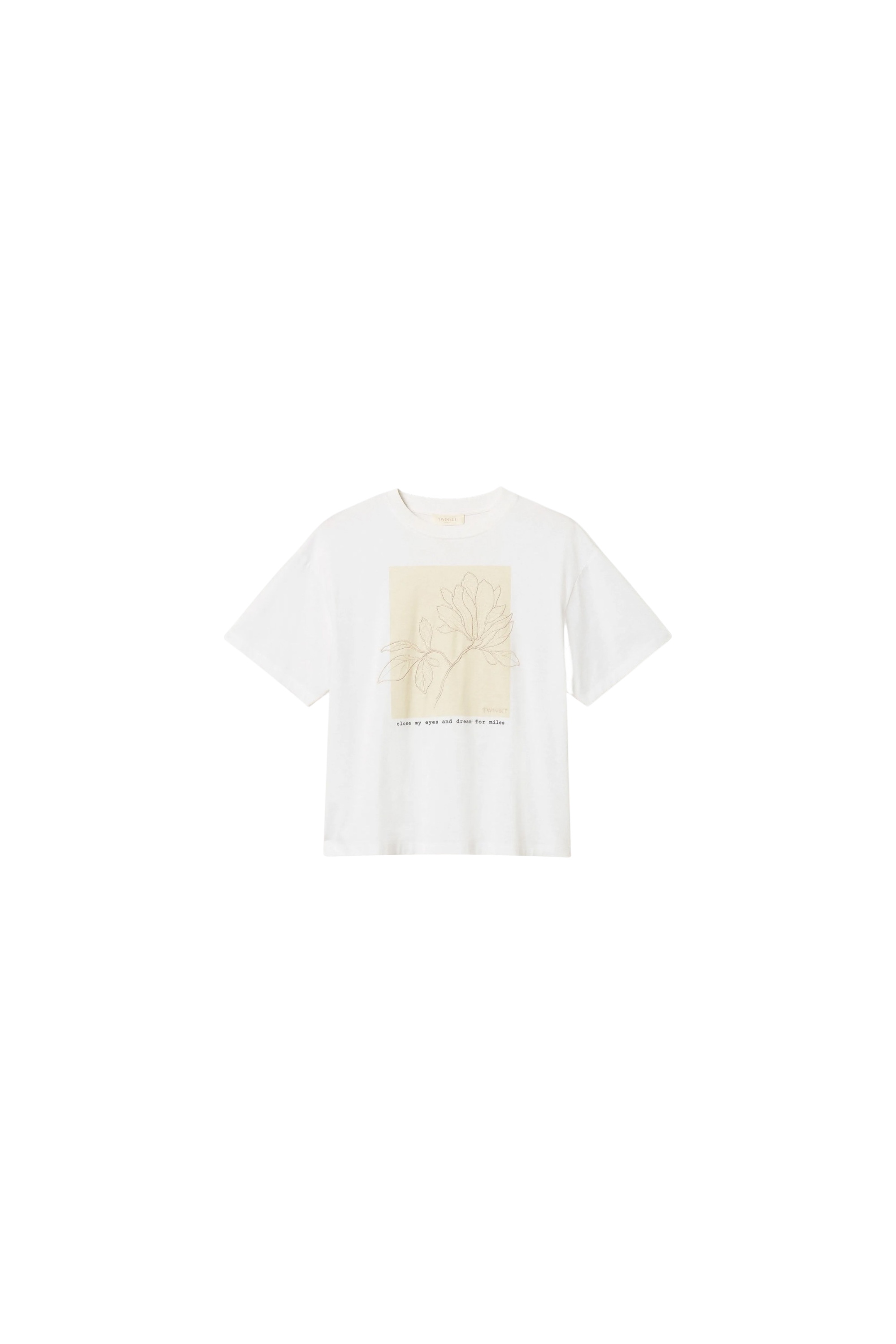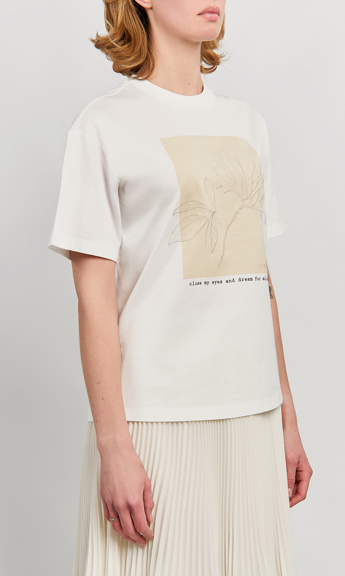Хлопковая футболка свободного кроя с классическим круглым вырезом дополнена цветочным принтом с вышивкой и надписью.