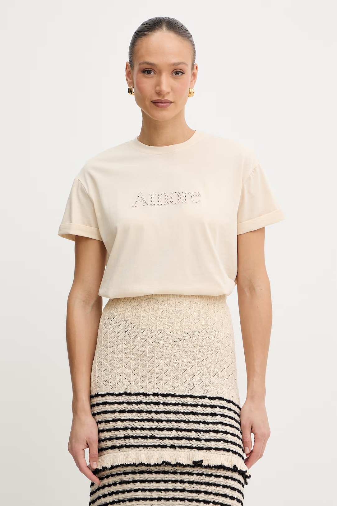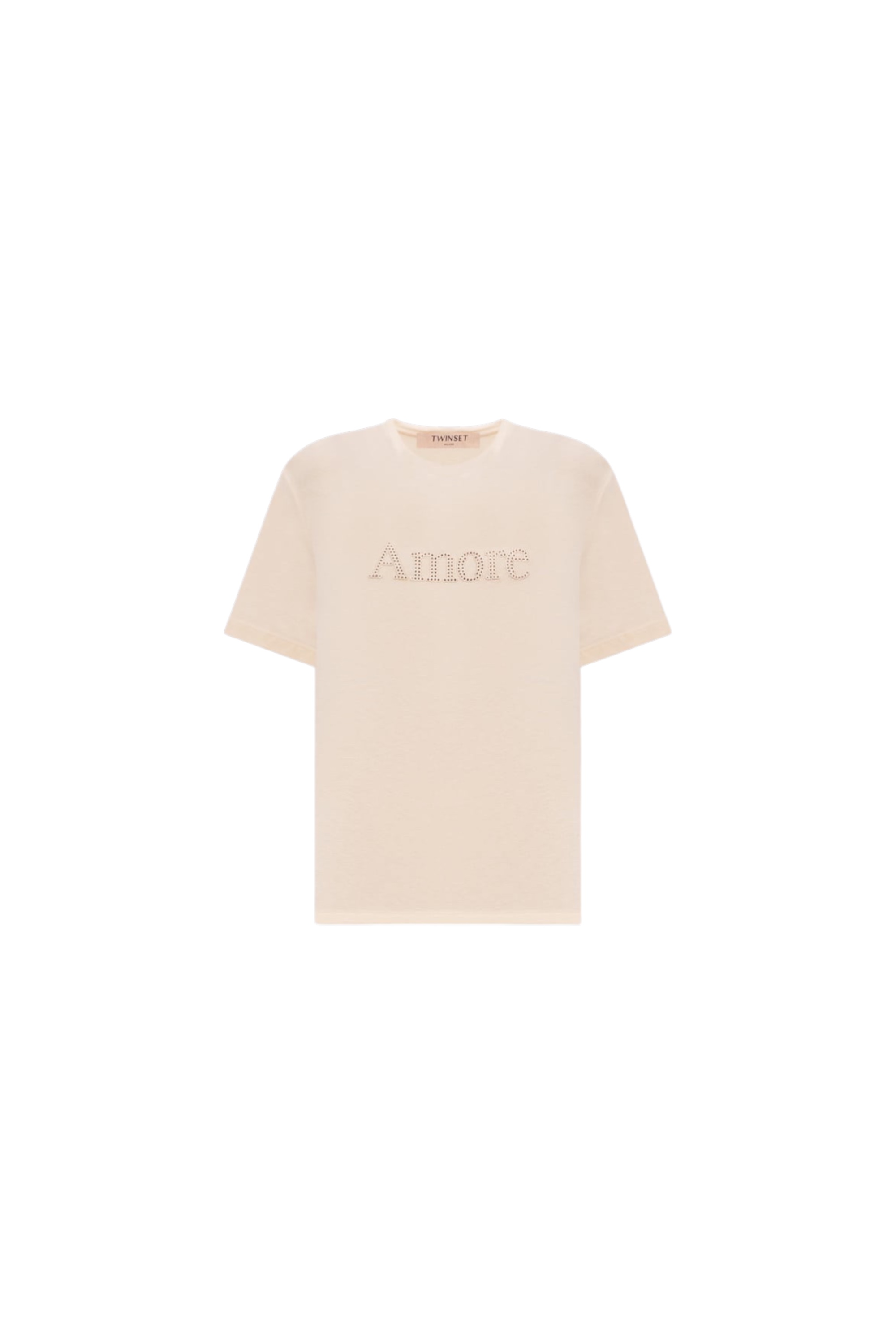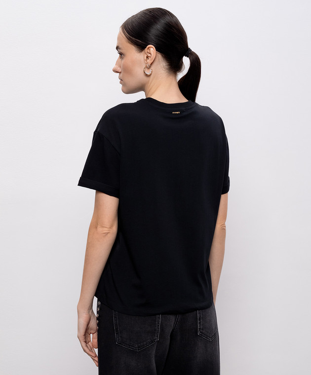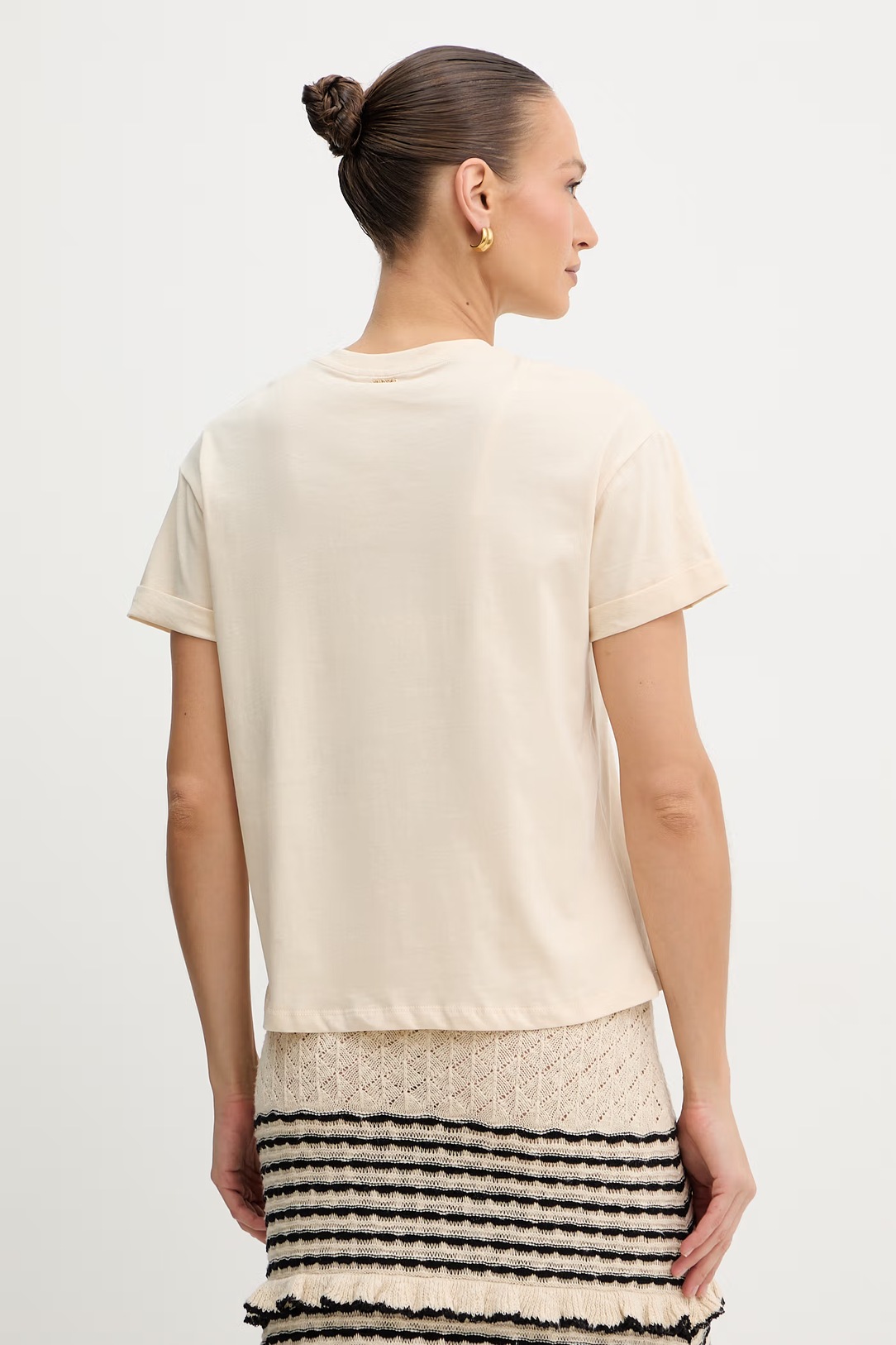 Хлопковая футболка с классическим круглым вырезом дополнена спереди лаконичным принтом и металлическим логотипом бренда на спине.