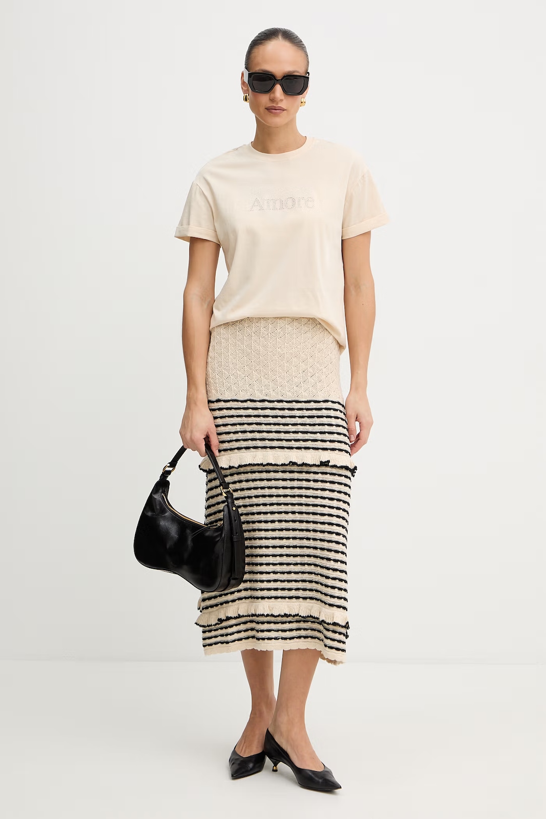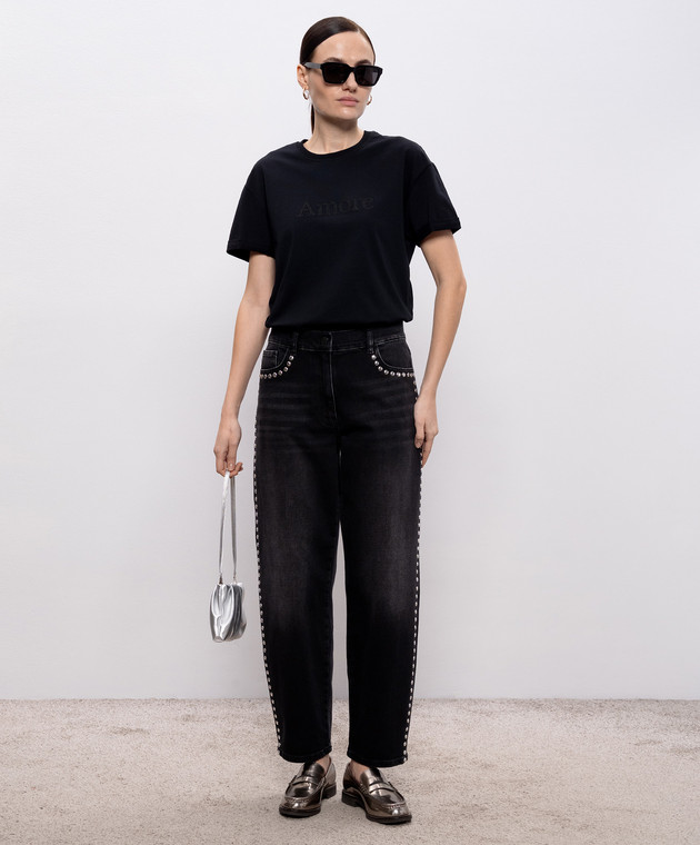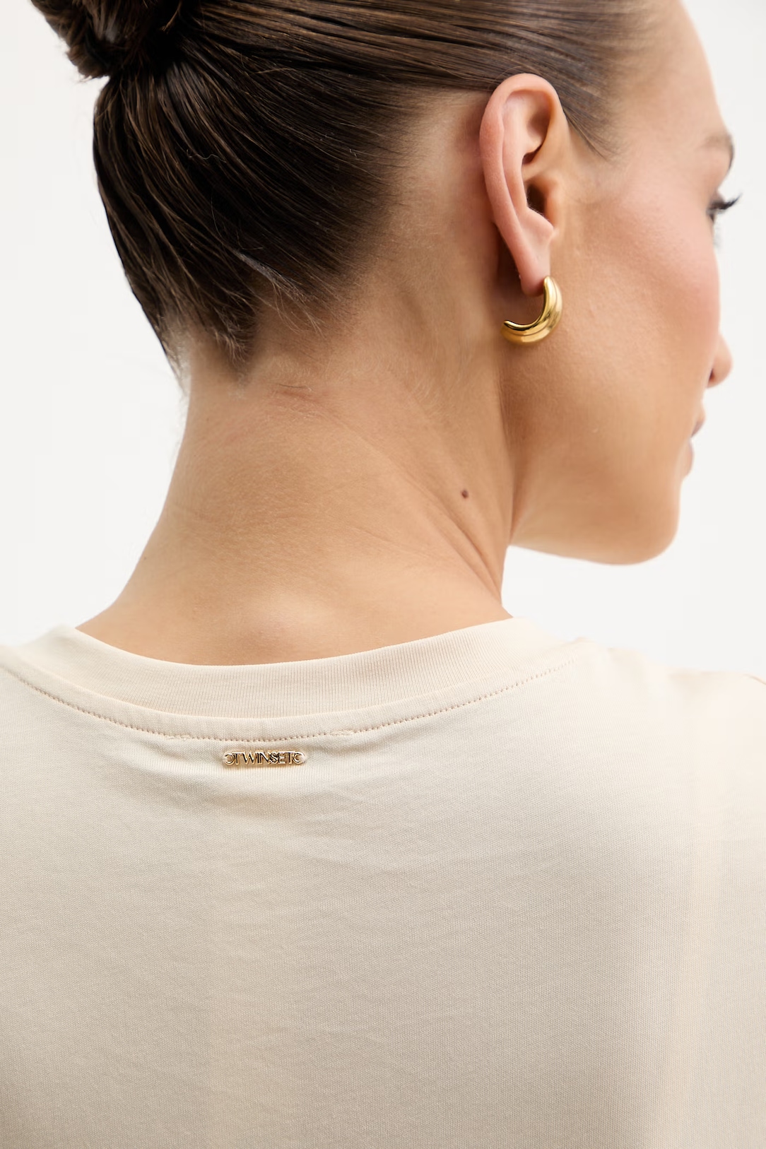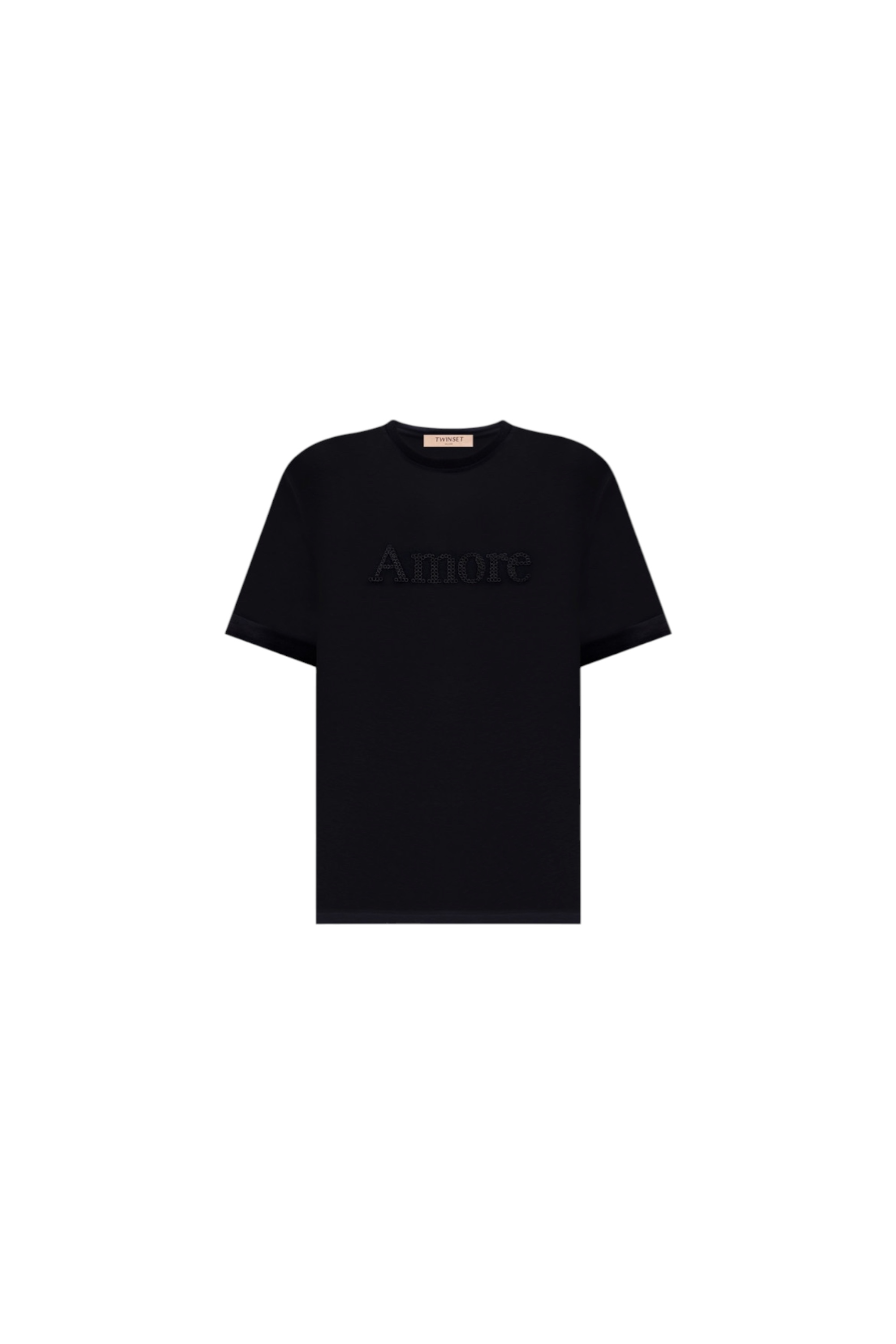 Хлопковая футболка с классическим круглым вырезом дополнена спереди лаконичным принтом и металлическим логотипом бренда на спине.