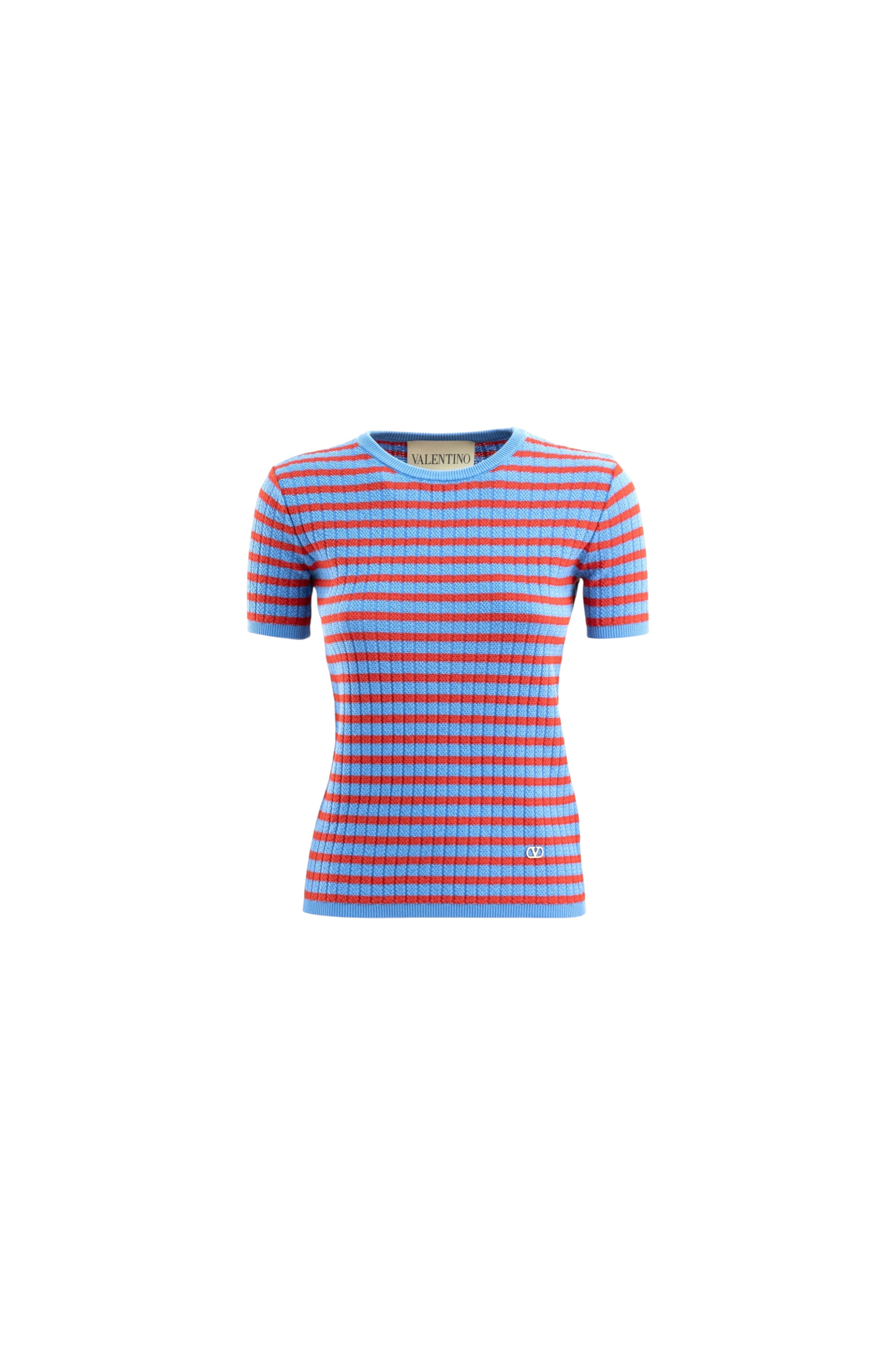 Футболка прямого кроя из вязаного хлопка с круглым вырезом дополнена принтом в полоску, манжетами и основанием в рубчик. Изделие декорировано металлическим логотипом бренда спереди.
