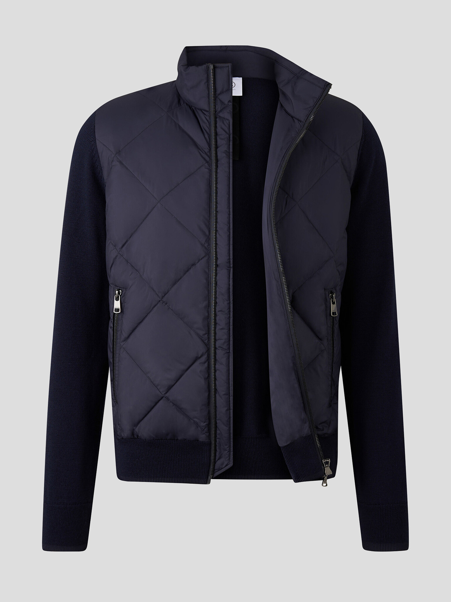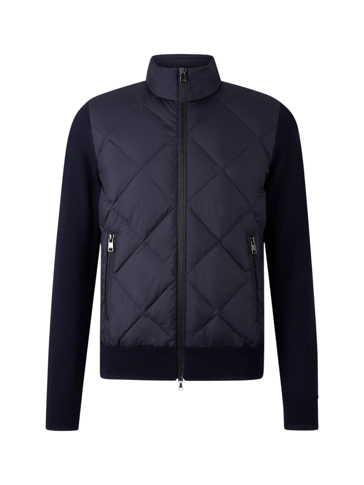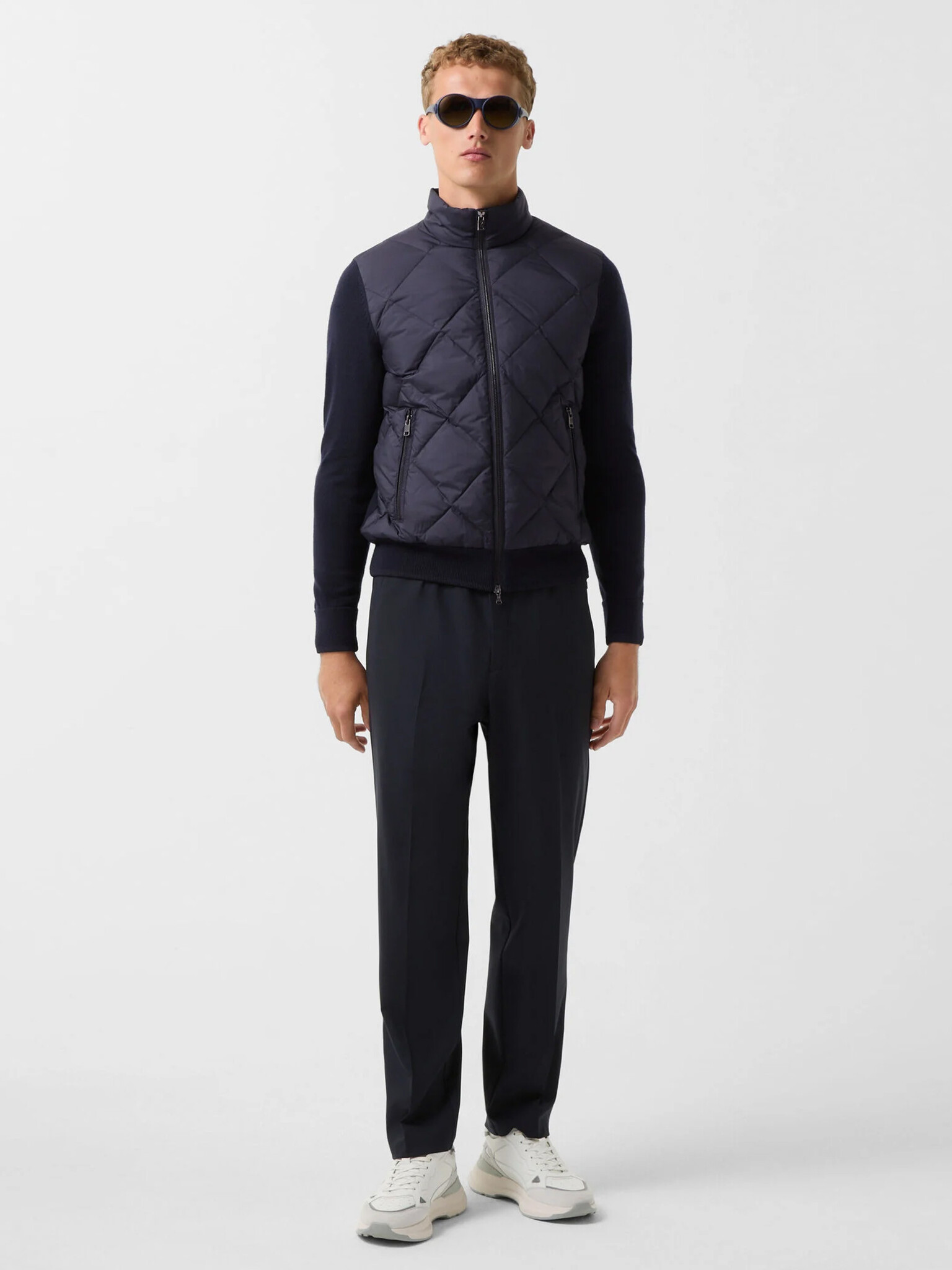 Комбинированный кардиган из шерстяного трикотажа и стеганой плащевки, утепленной отборным пухом полуприлегающего силуэта с длинными рукавами, эластичными рельефными манжетами и поясом, воротником-стойкой, прорезными карманами на молниях и застежкой на молнию с двумя пуллерами. Благодаря стежке наполнитель равномерно распределен внутри изделия и лучше сохраняет тепло.