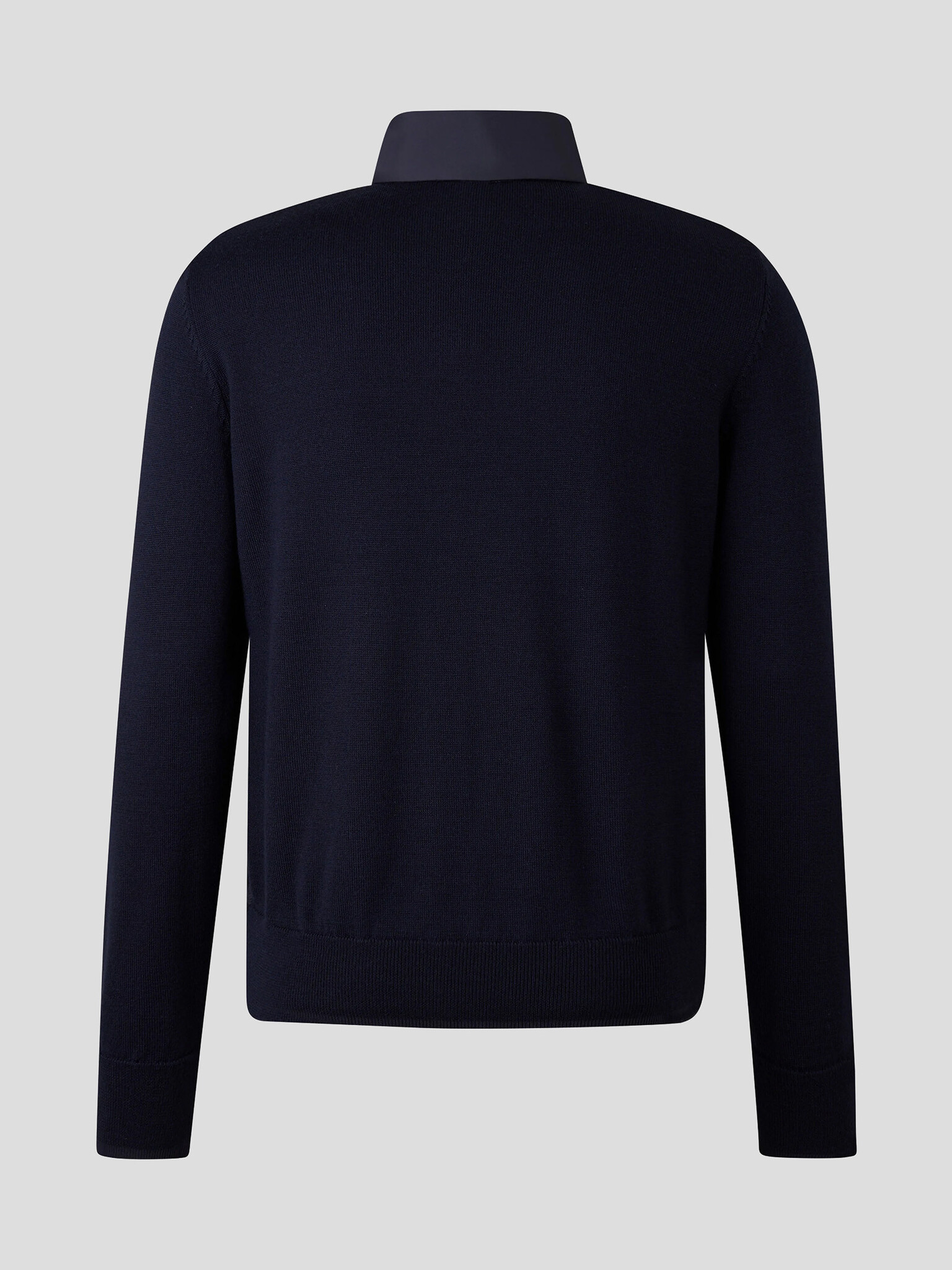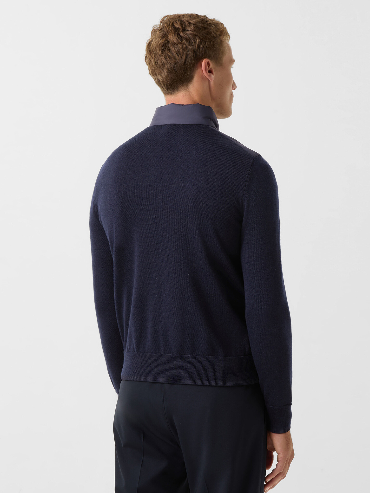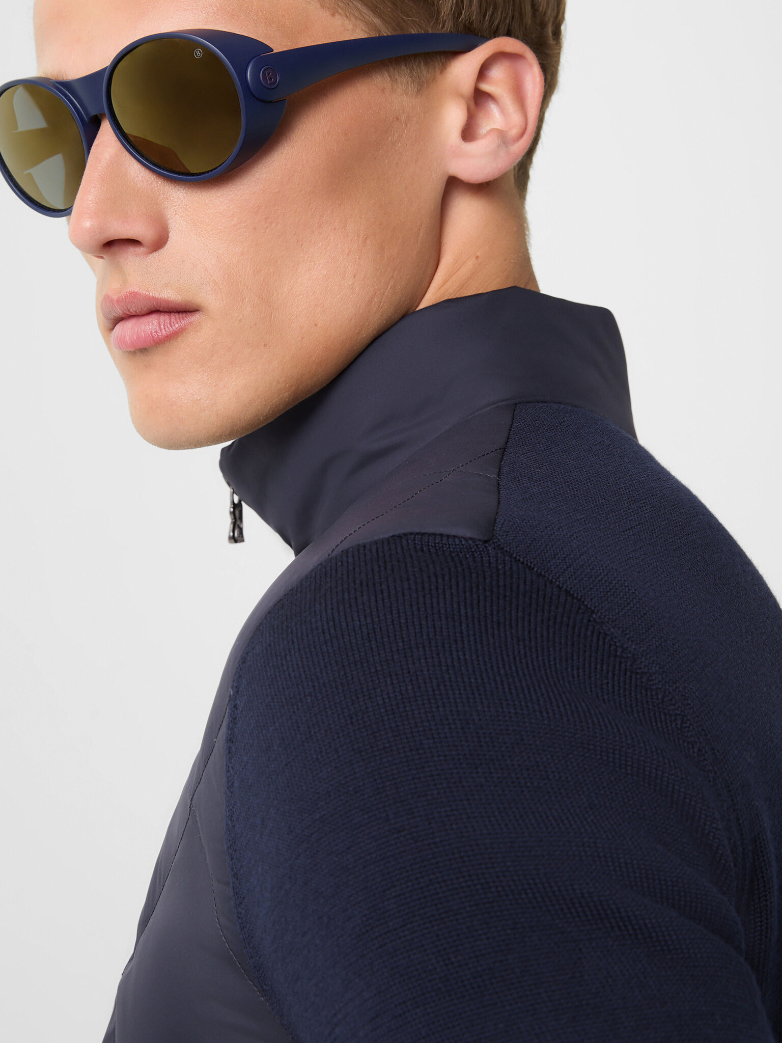 Комбинированный кардиган из шерстяного трикотажа и стеганой плащевки, утепленной отборным пухом полуприлегающего силуэта с длинными рукавами, эластичными рельефными манжетами и поясом, воротником-стойкой, прорезными карманами на молниях и застежкой на молнию с двумя пуллерами. Благодаря стежке наполнитель равномерно распределен внутри изделия и лучше сохраняет тепло.