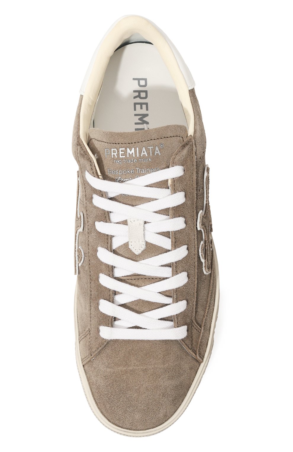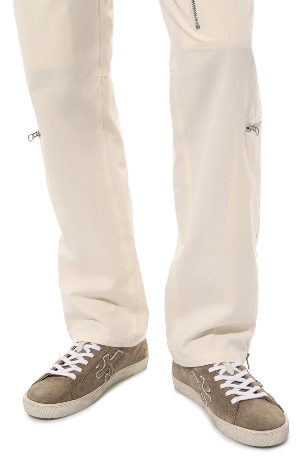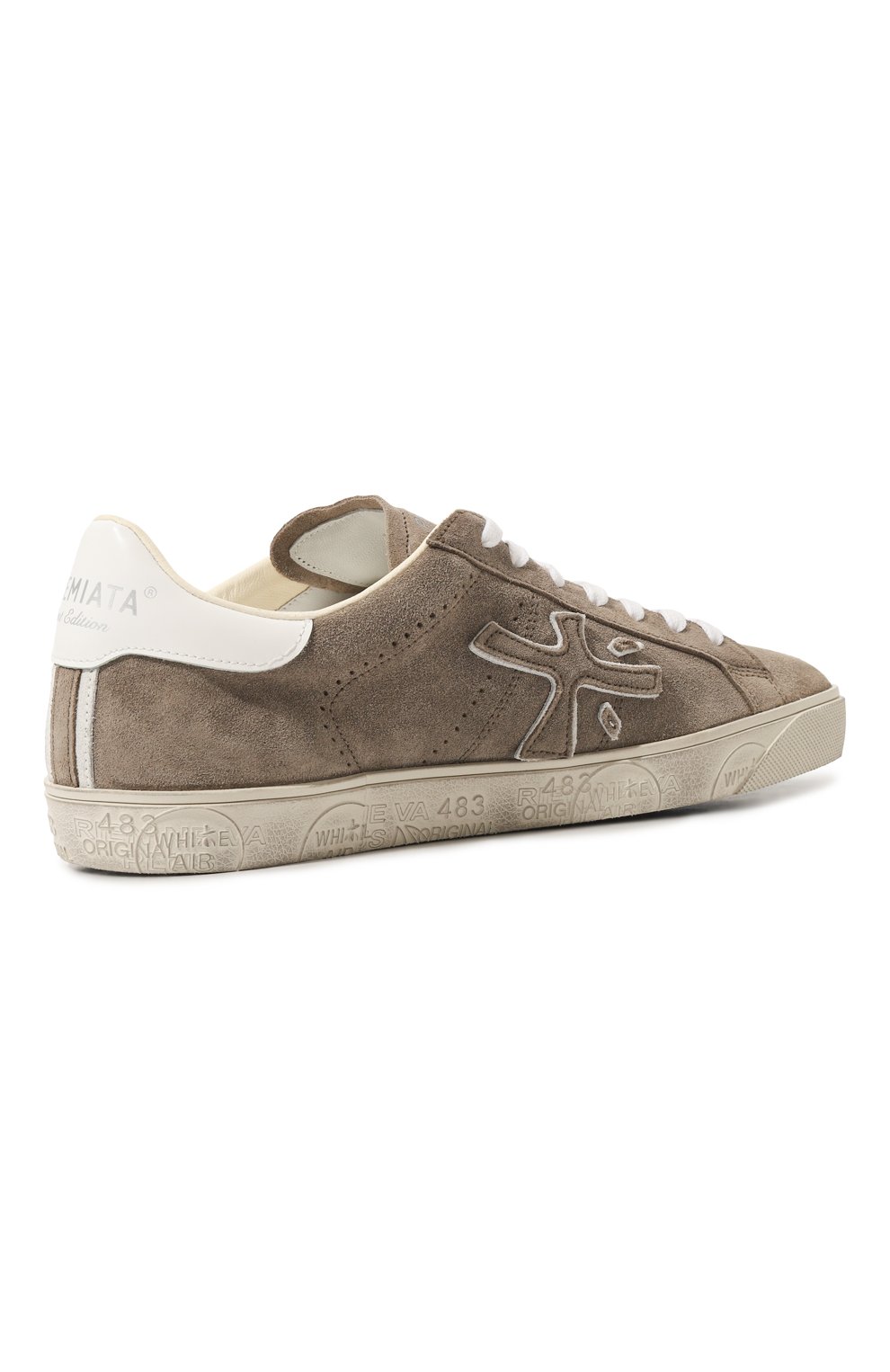 Кеды Steven из мягкой бархатистой замши с контрастным задником из матовой кожи украшена фирменными иероглифами бренда по бокам и тиснеными штампами и печатями на подошве, которую окрасили так, чтобы сымитировать потертости.